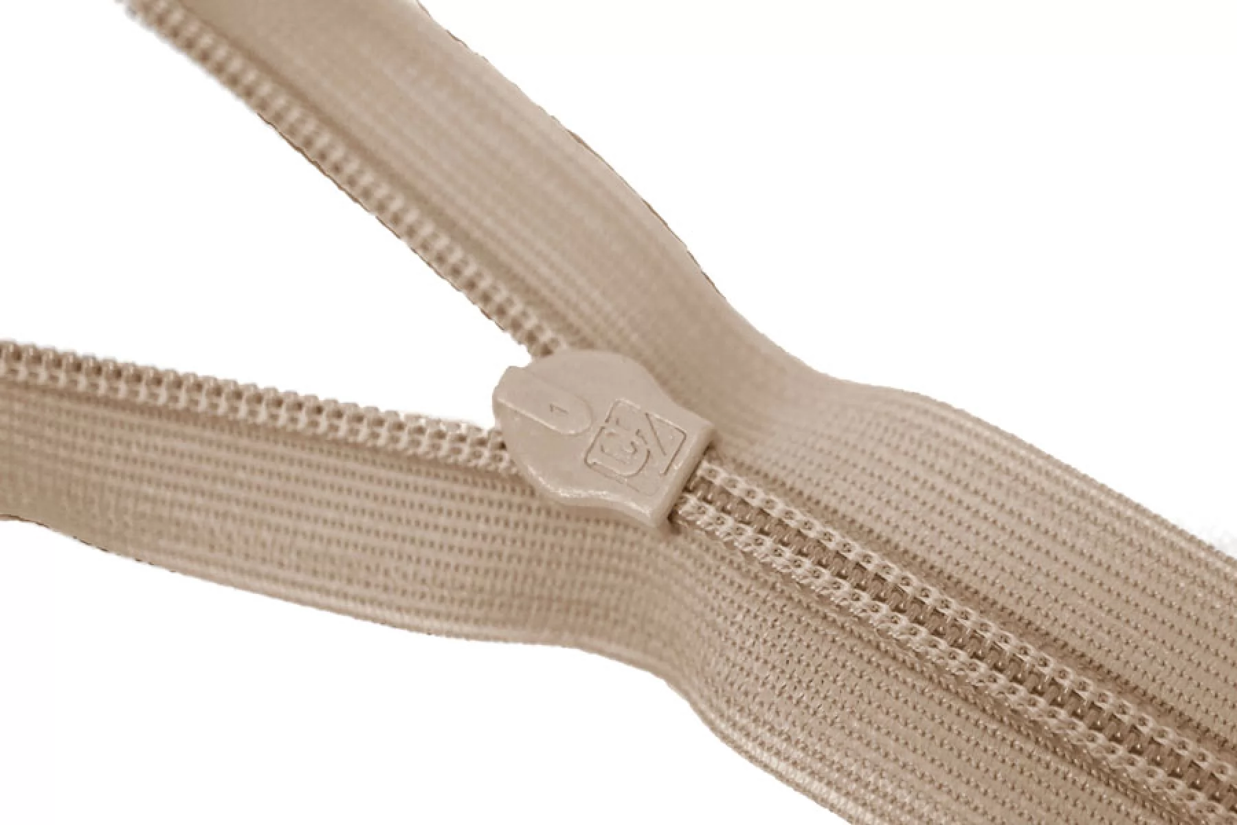 Потайная молния UZ светло-коричневого цвета, длина 20 см. Неразъемная. Зубцы пластиковые, слайдер и пуллер - металл в цвет молнии. Ширина молнии 2,2 см. Ширина зубцов 4 мм.