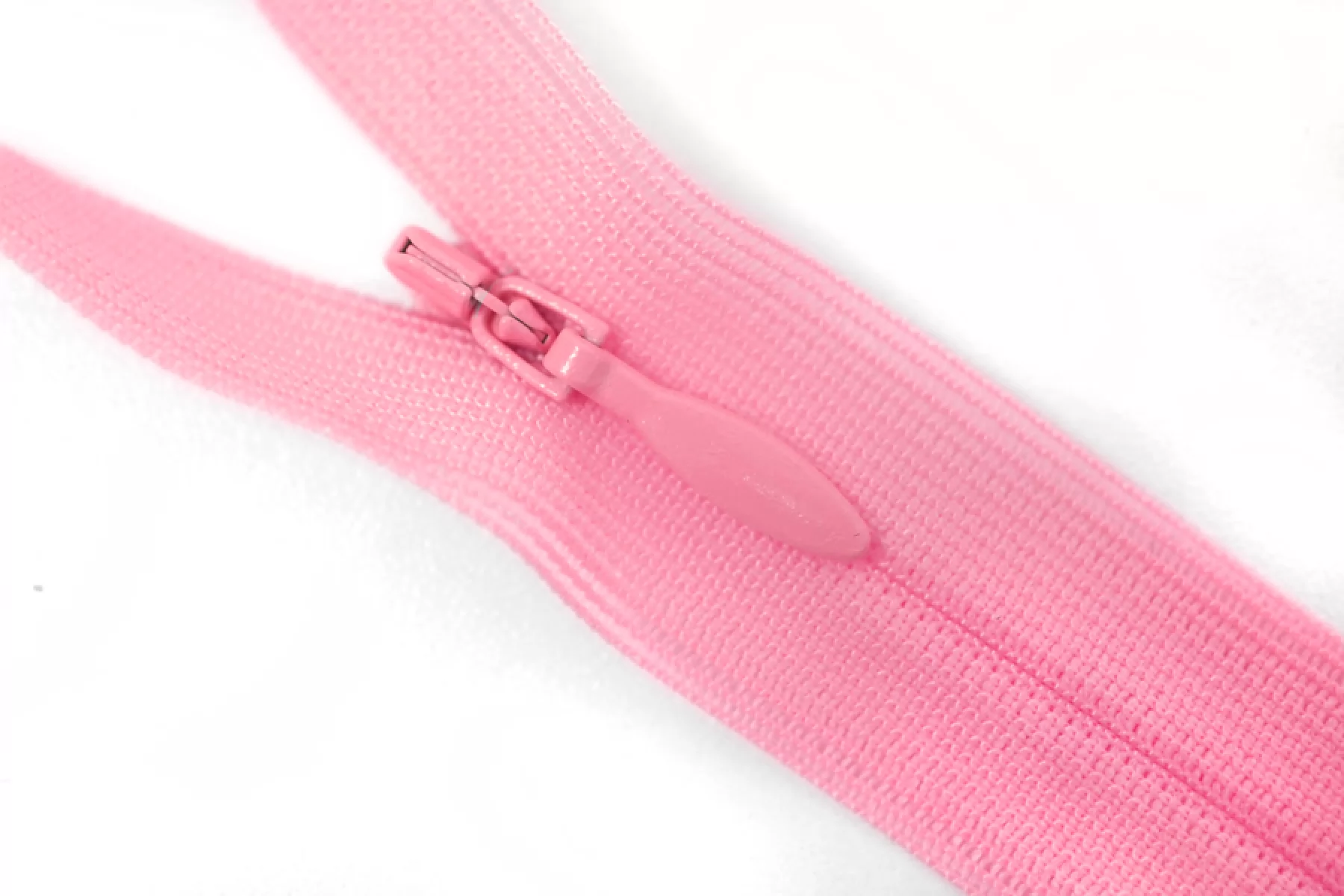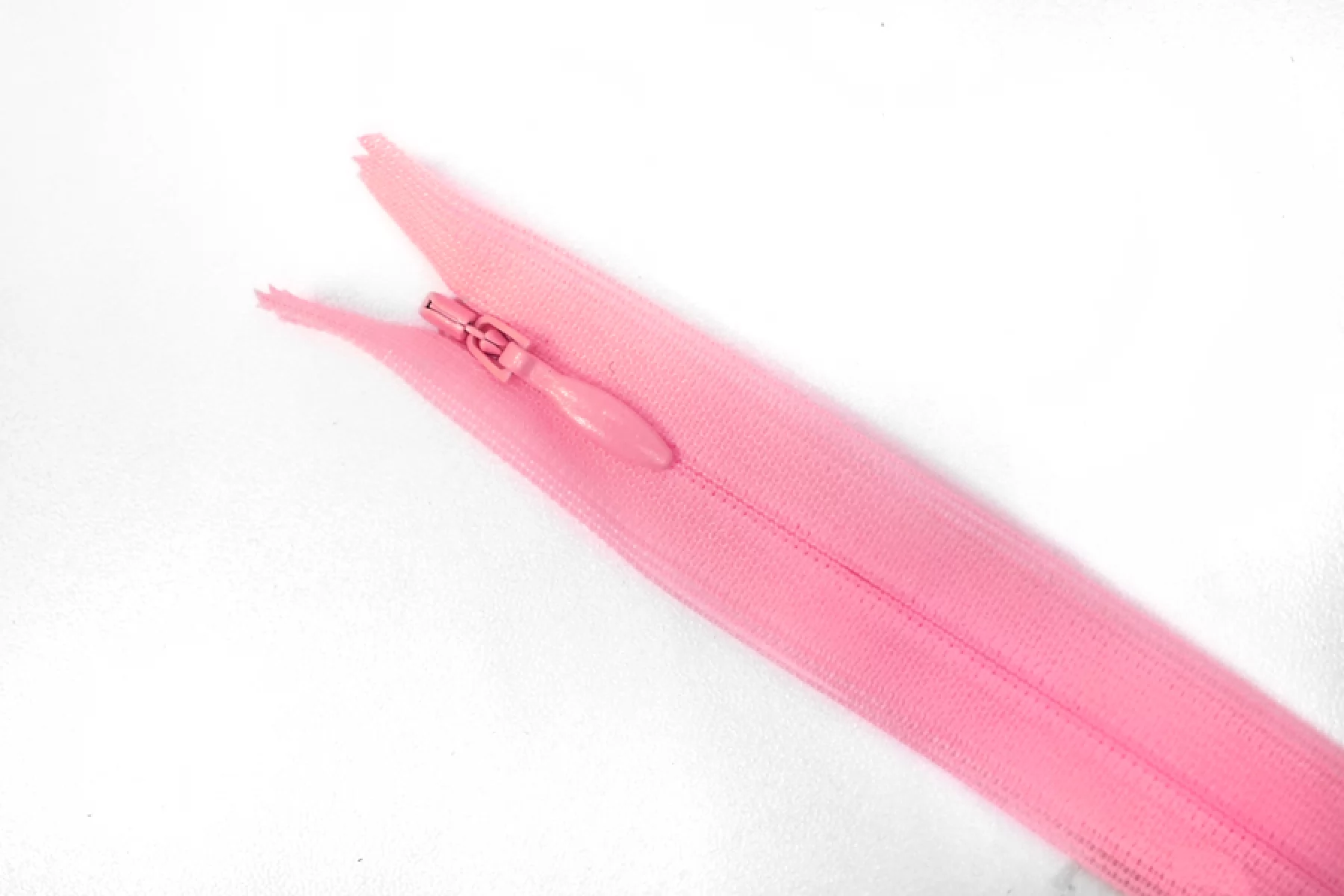 Потайная молниясветло-розового оттенка от бренда YKK , длина 60 см. Неразъемная. Зубцы пластиковые, слайдер и пуллер - металл. Ширина молнии 2,1 см. Ширина зубцов 5 мм.