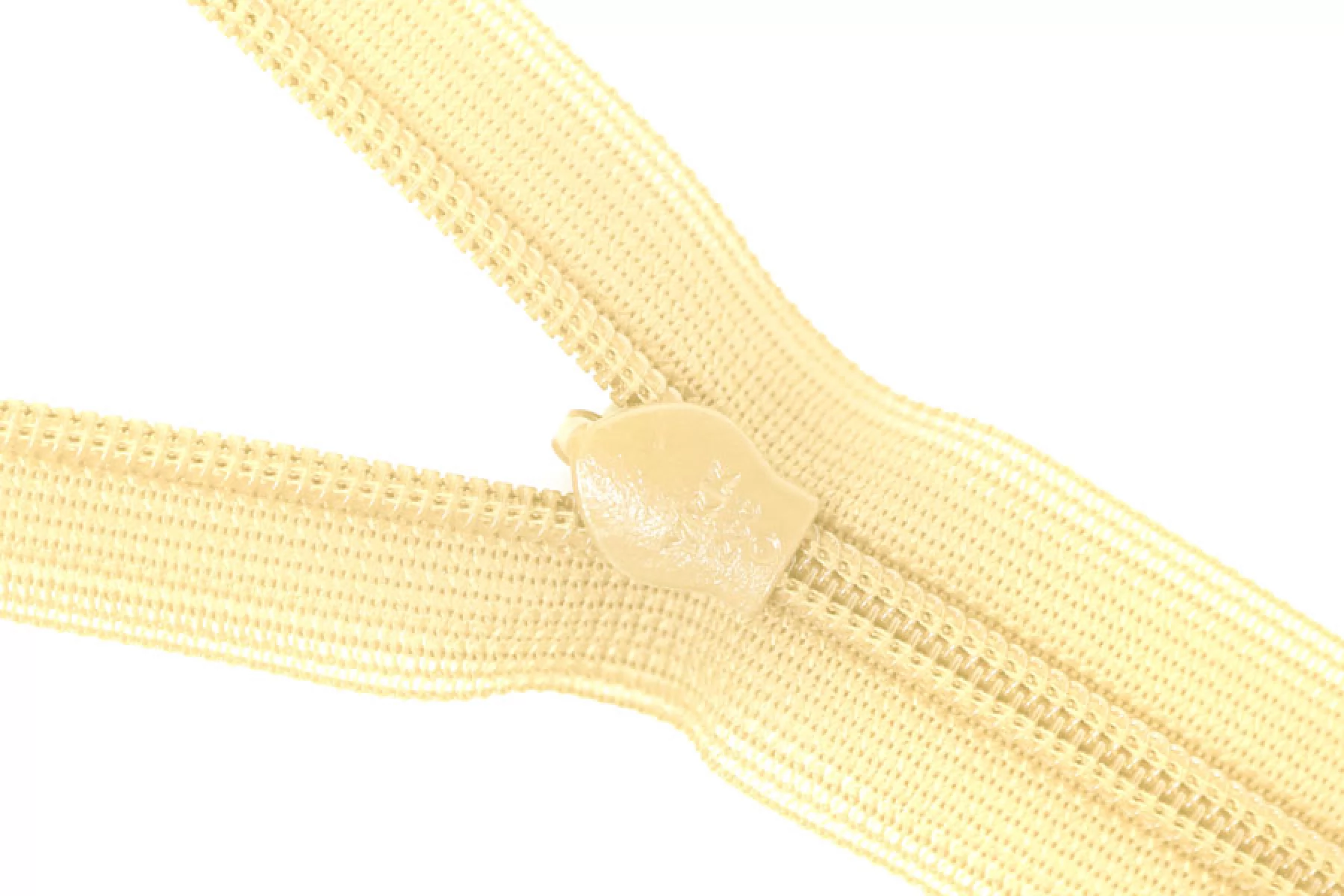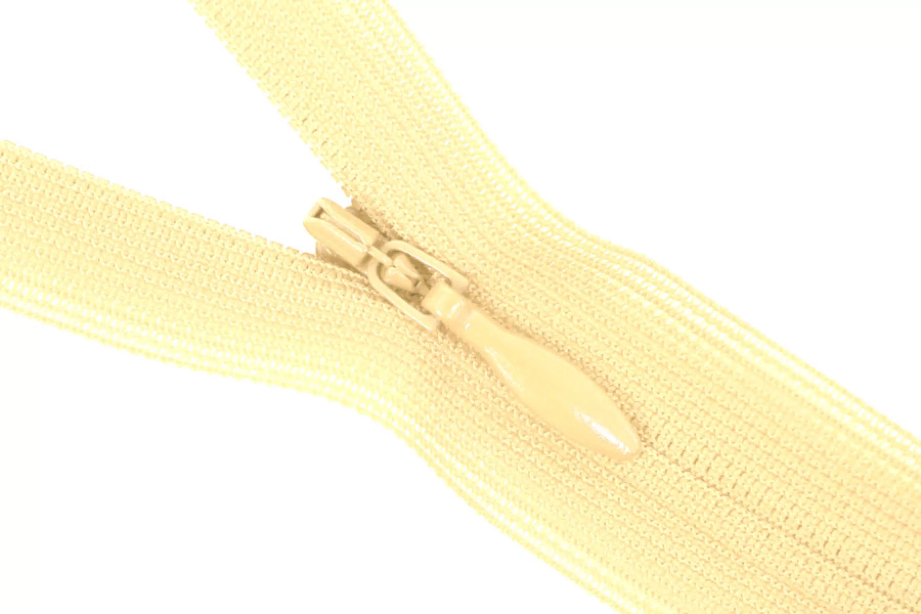 Потайная молния светло-желтого оттенка от бренда YKK , длина 15 см. Неразъемная. Зубцы пластиковые, слайдер и пуллер - металл. Ширина молнии 2 см. Ширина зубцов 4 мм.