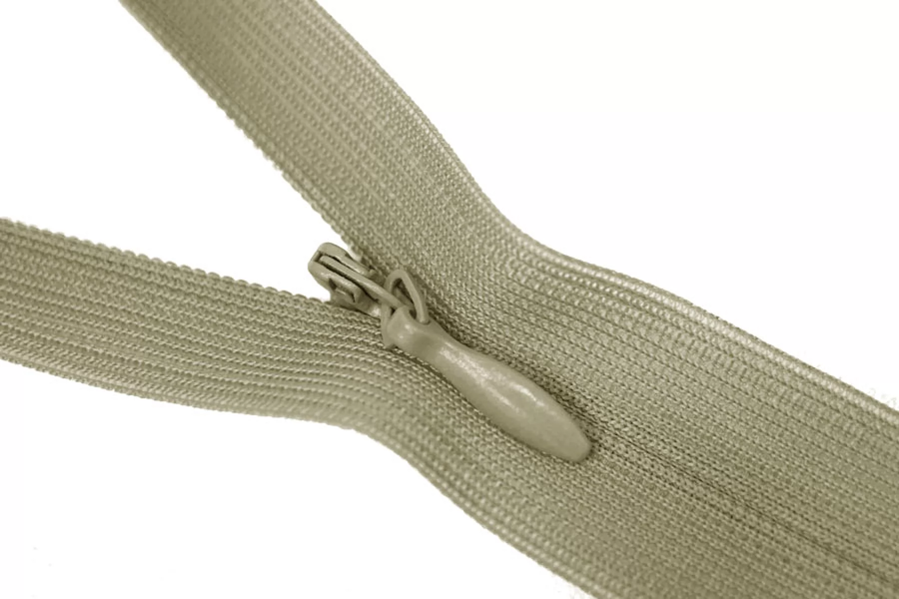 Потайная молния цвета светлый хаки , длина 22см. Слайдер и пуллер - метал. в цвет молнии. Ширина молнии 2.2 см , ширина зубцов 4мм.