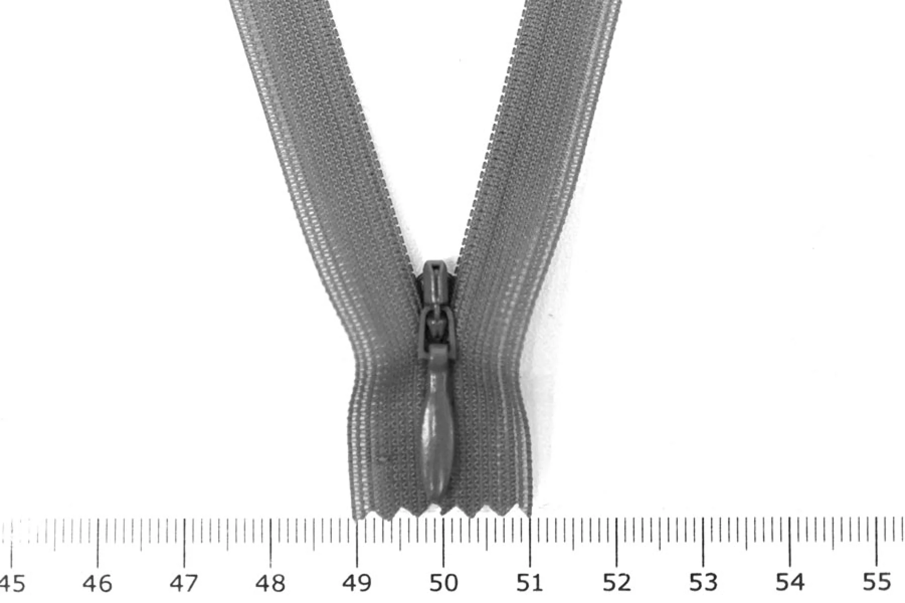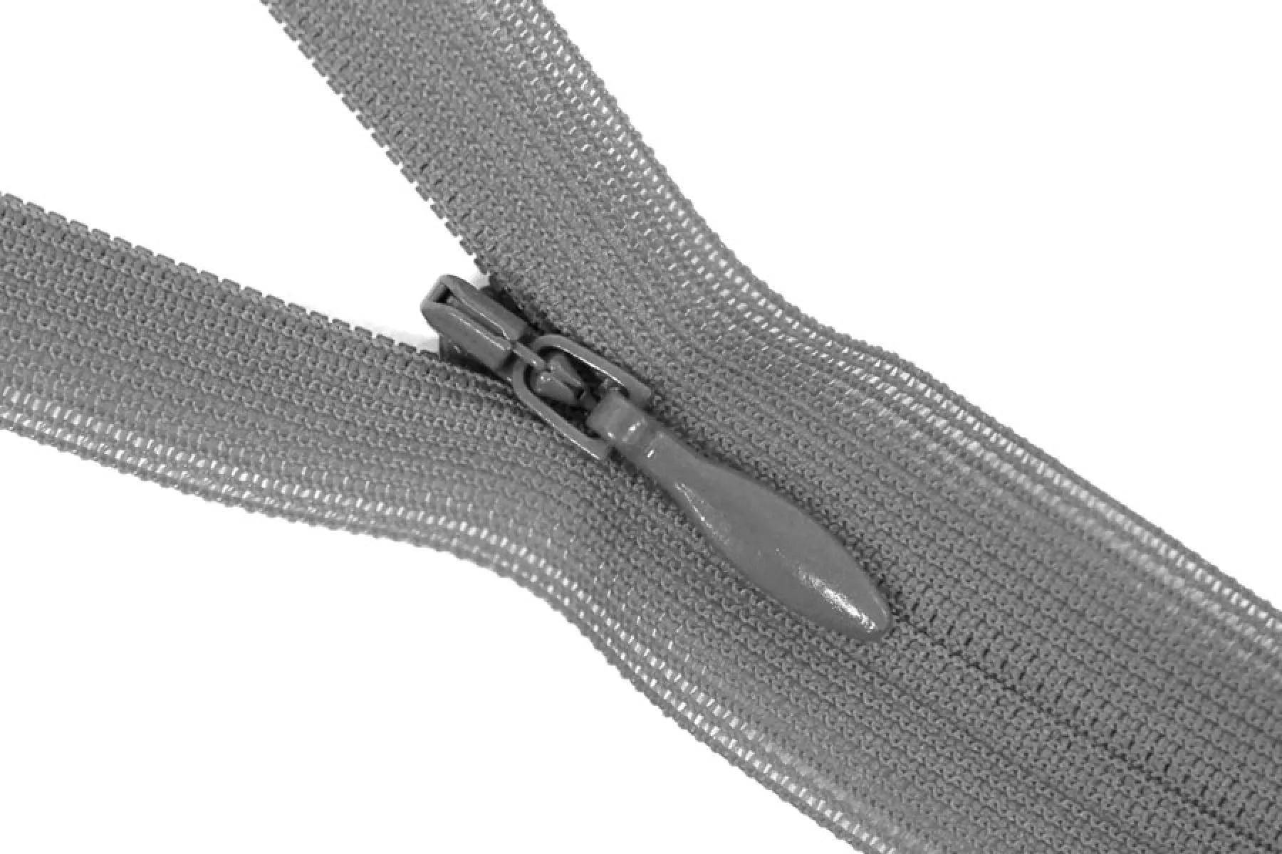 Потайная молния в темно-сером цвете , длина 18 см. Неразъемная. Зубцы пластиковые, слайдер и пулер - металл в цвет молнии. Ширина молнии 2 см. Ширина зубцов 4 мм.