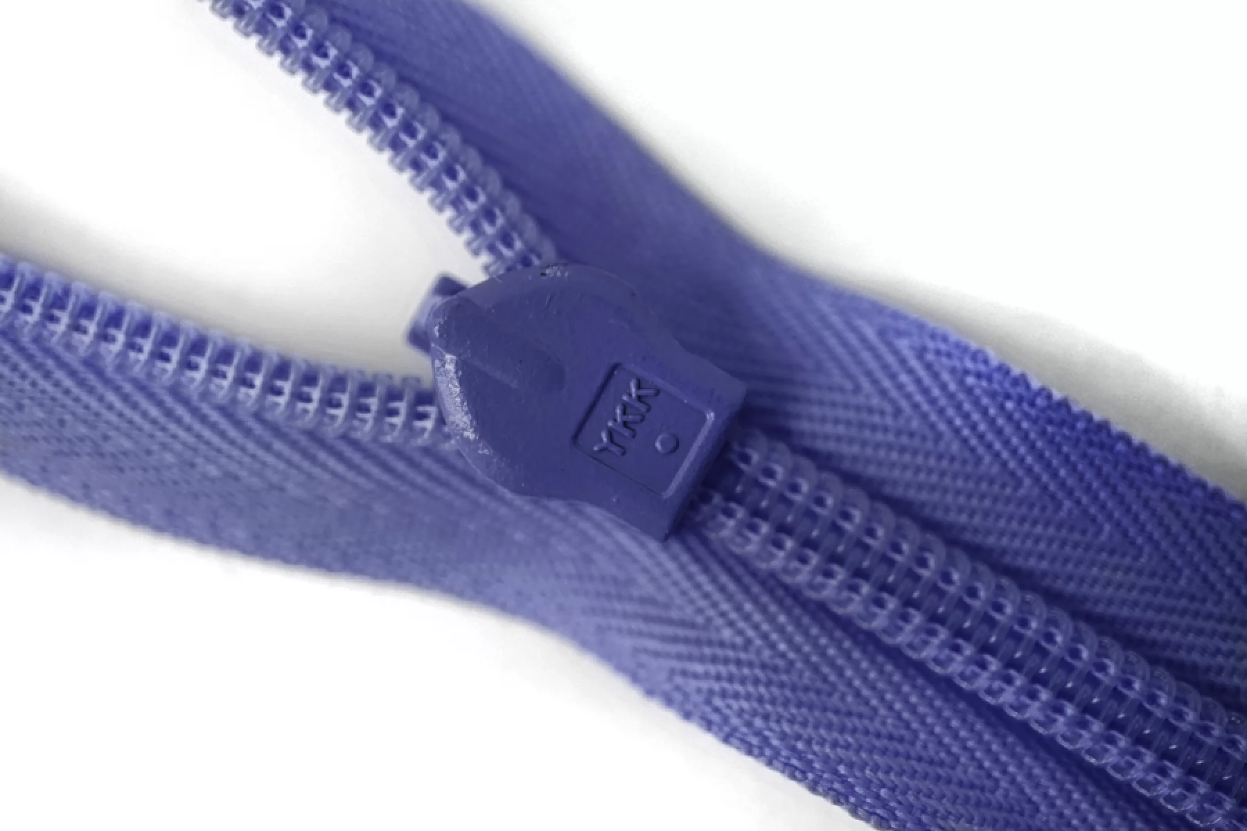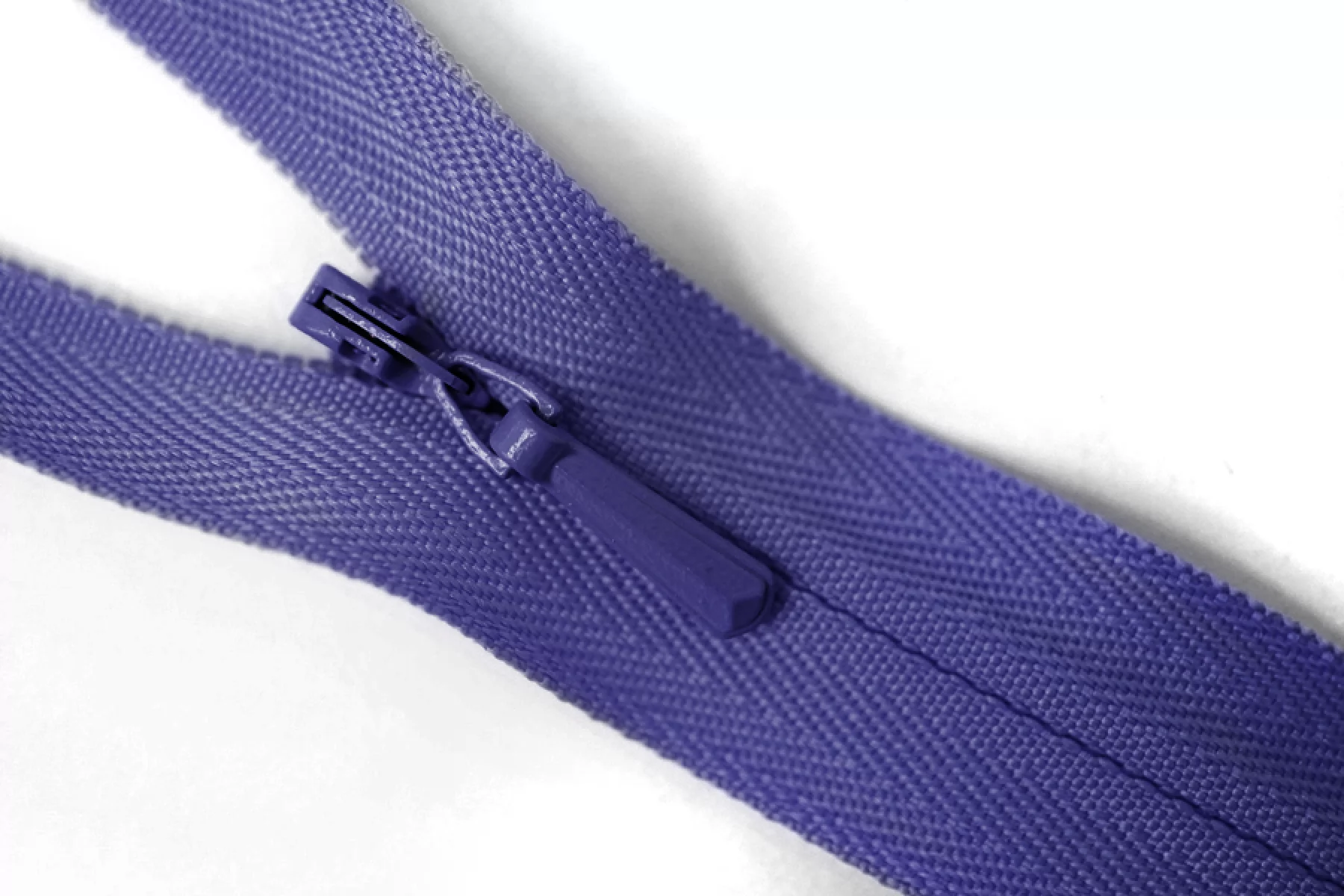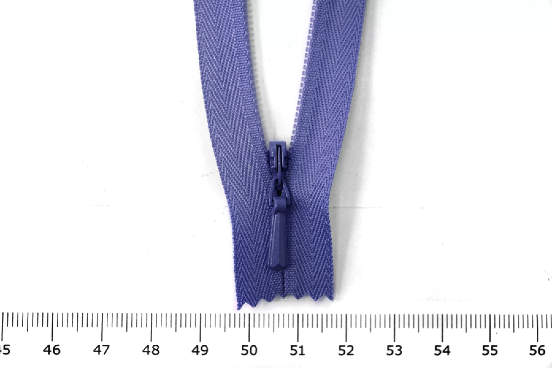 Потайная молния темно-синего цвета от YKK, длина 39,5 см. Неразъемная. Зубцы пластиковвые, слайдер и пуллер металл темно-синего цвета. Ширина молнии 1,8 см. Ширина зубцов 5 мм.
