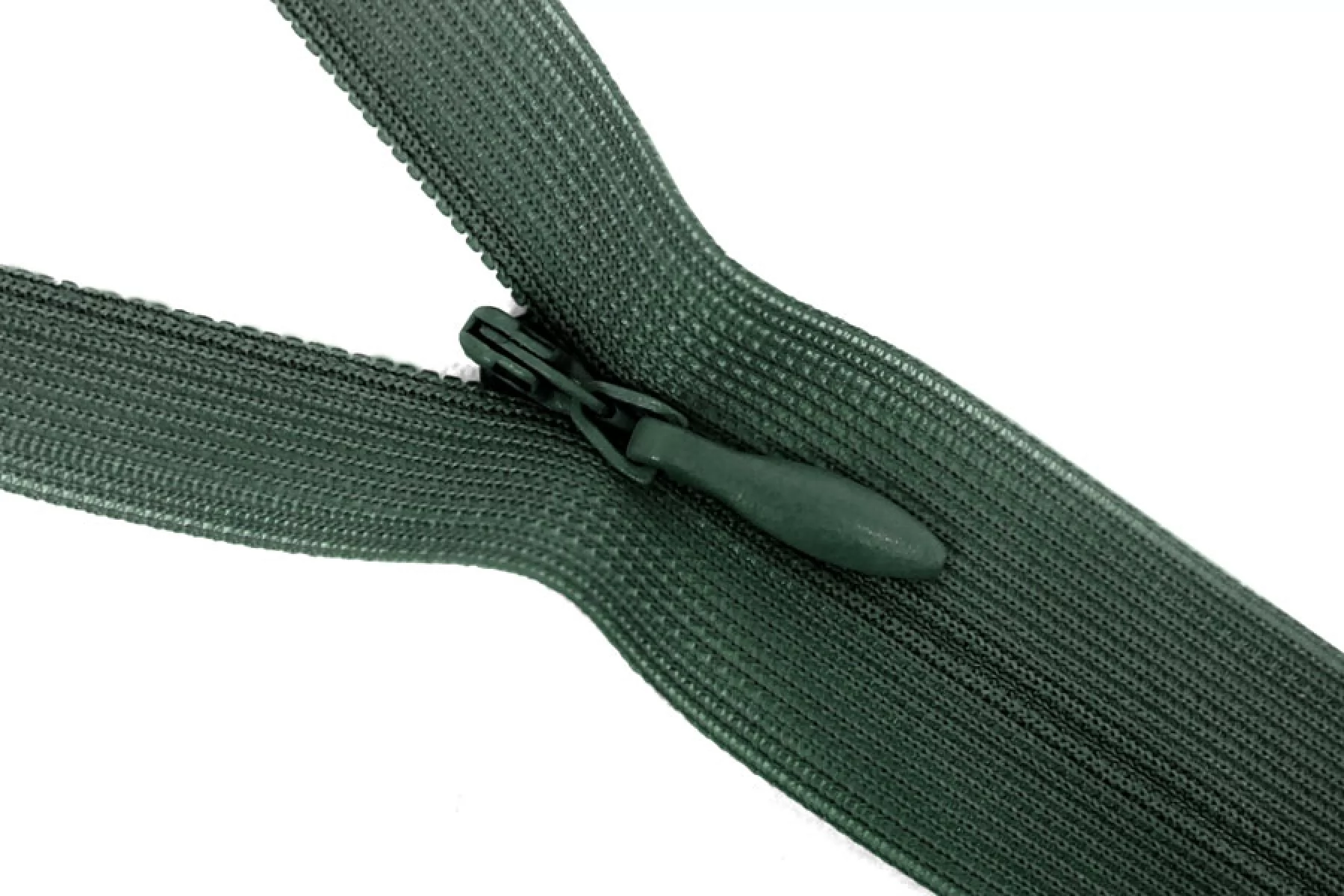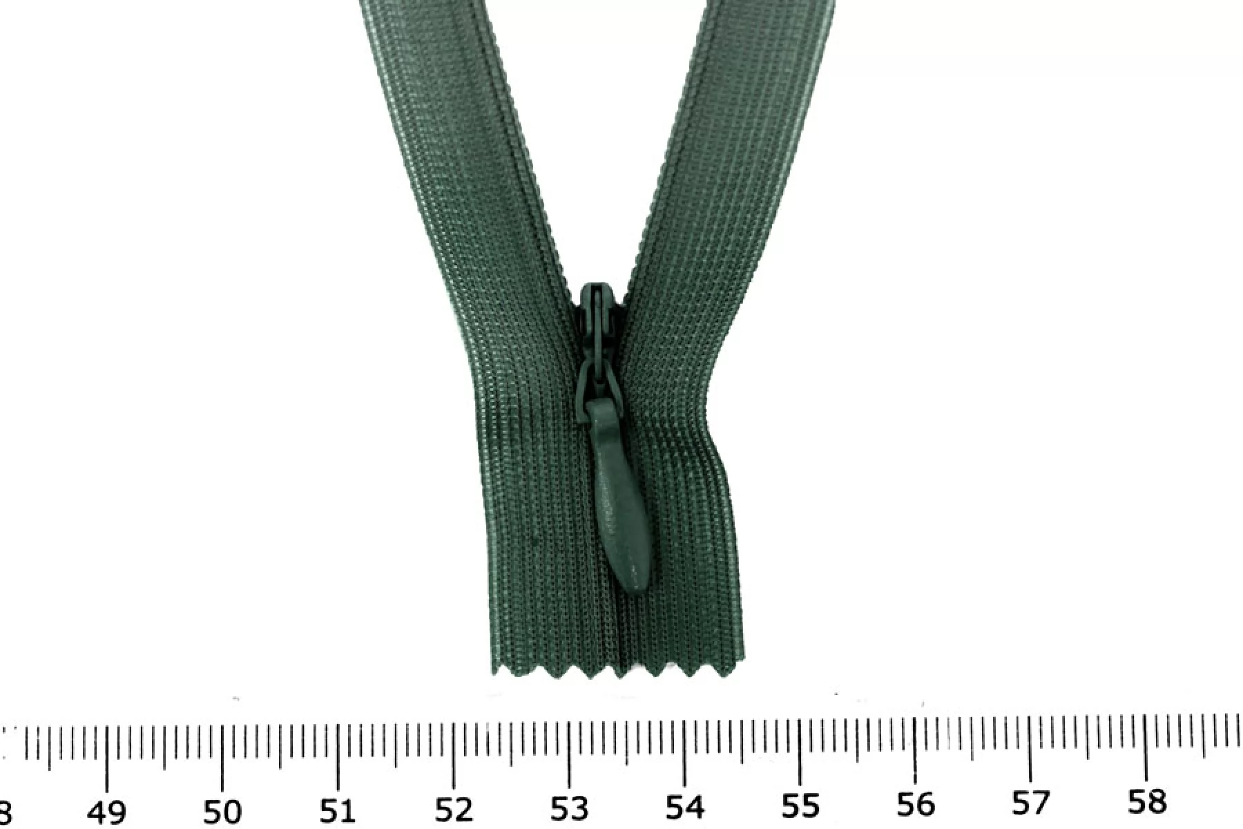 Потайная молния темно-зеленого цвета, длина 20 см. Слайдер и пуллер - метал. в цвет молнии. Ширина молнии 2.2 см , ширина зубцов 4мм.