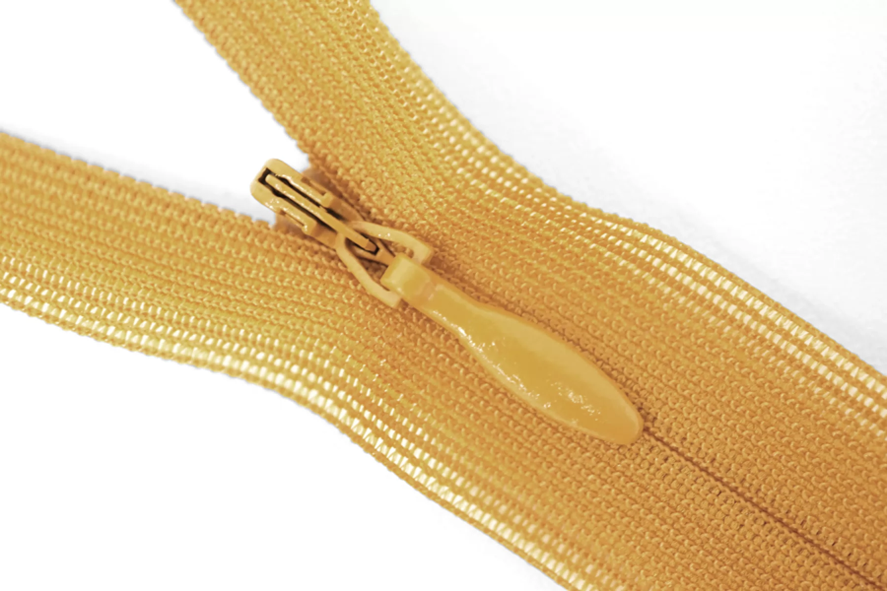 Потайная молния теплого желтого оттенка от бренда YKK , длина 25,5 см. Неразъемная. Зубцы пластиковые, слайдер и пуллер - металл. Ширина молнии 2 см. Ширина зубцов 4 мм.