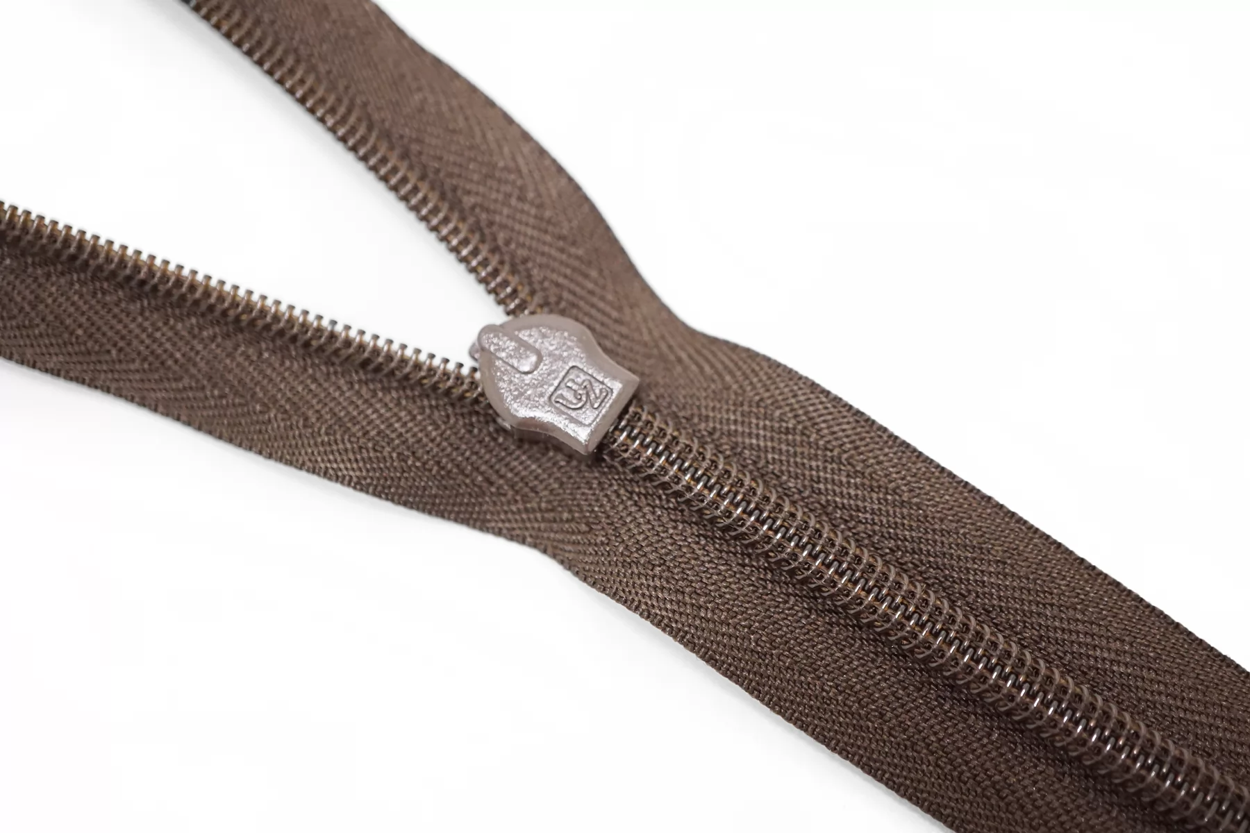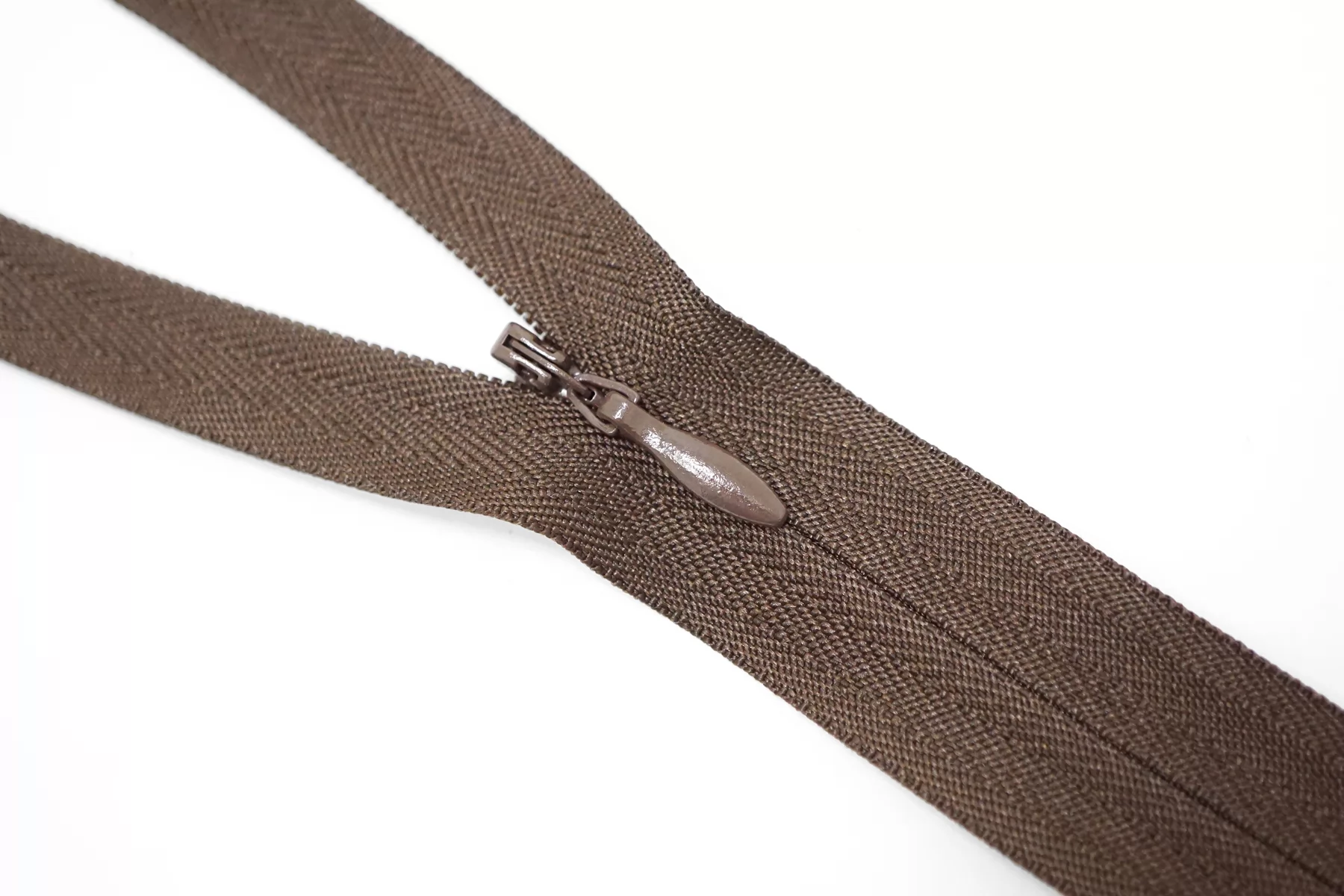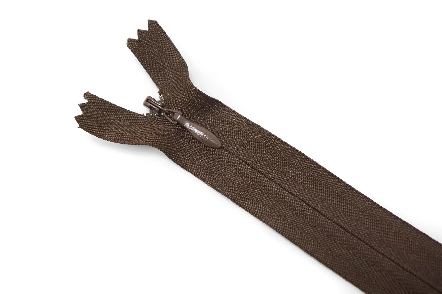 Потайная молния тёмно-коричневого оттенка от UZ, длина 50 см. Зубцы пластиковые, слайдер и пуллер - металл.