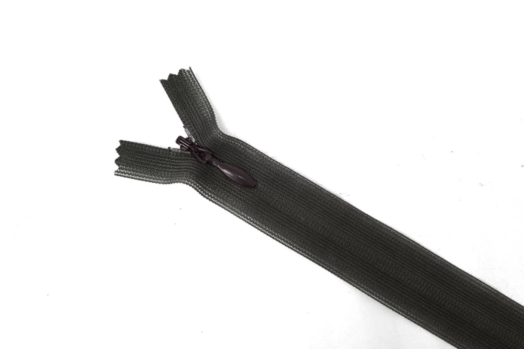 Молния потайная тёмно-коричневая , длина 16 см. Неразъемная. Зубцы пластиковые, слайдер и пуллер - металл вцвет молнии. Ширина молнии 2,2 см. Ширина зубцов 4 мм.