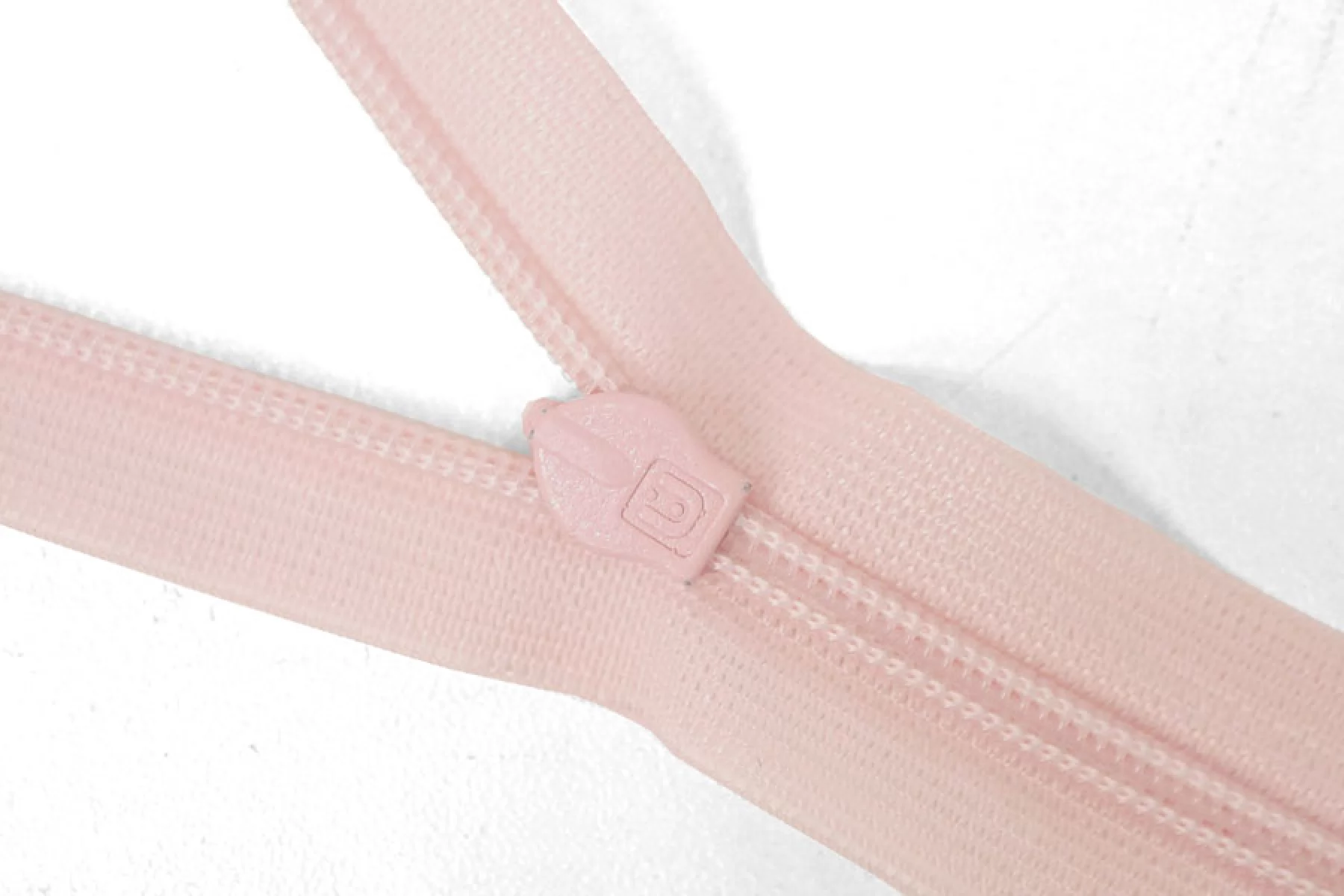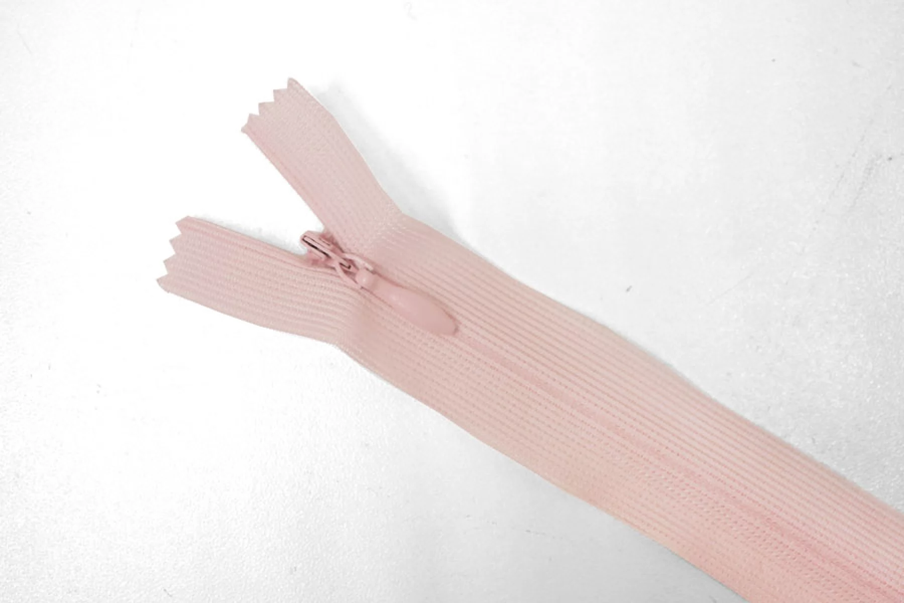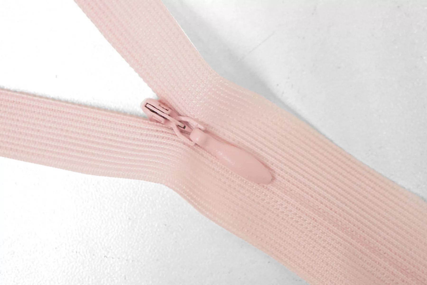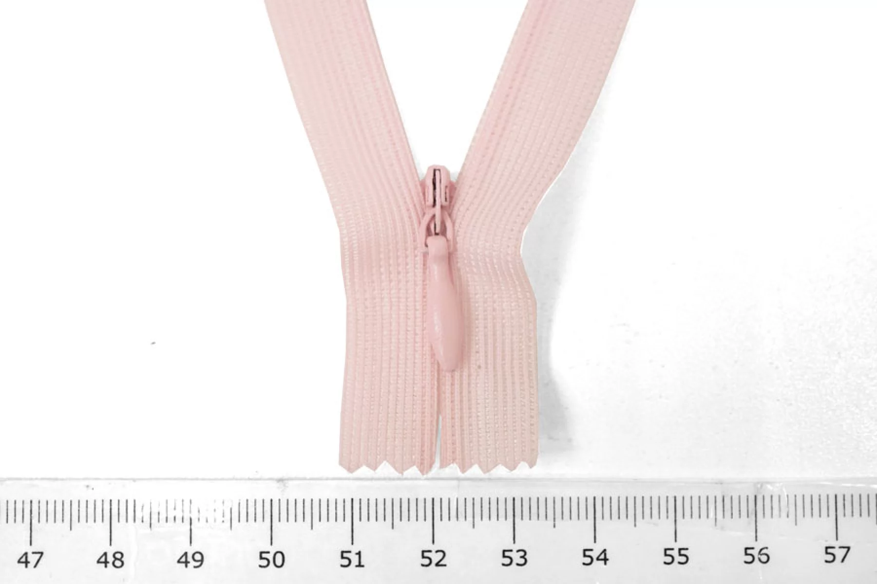 Потайная молния бело-розовая от бренда U , длина 20см. Неразъемная. Зубцы пластиковые, слайдер и пуллер - металл. Ширина молнии 2,2 см. Ширина зубцов 4 мм.