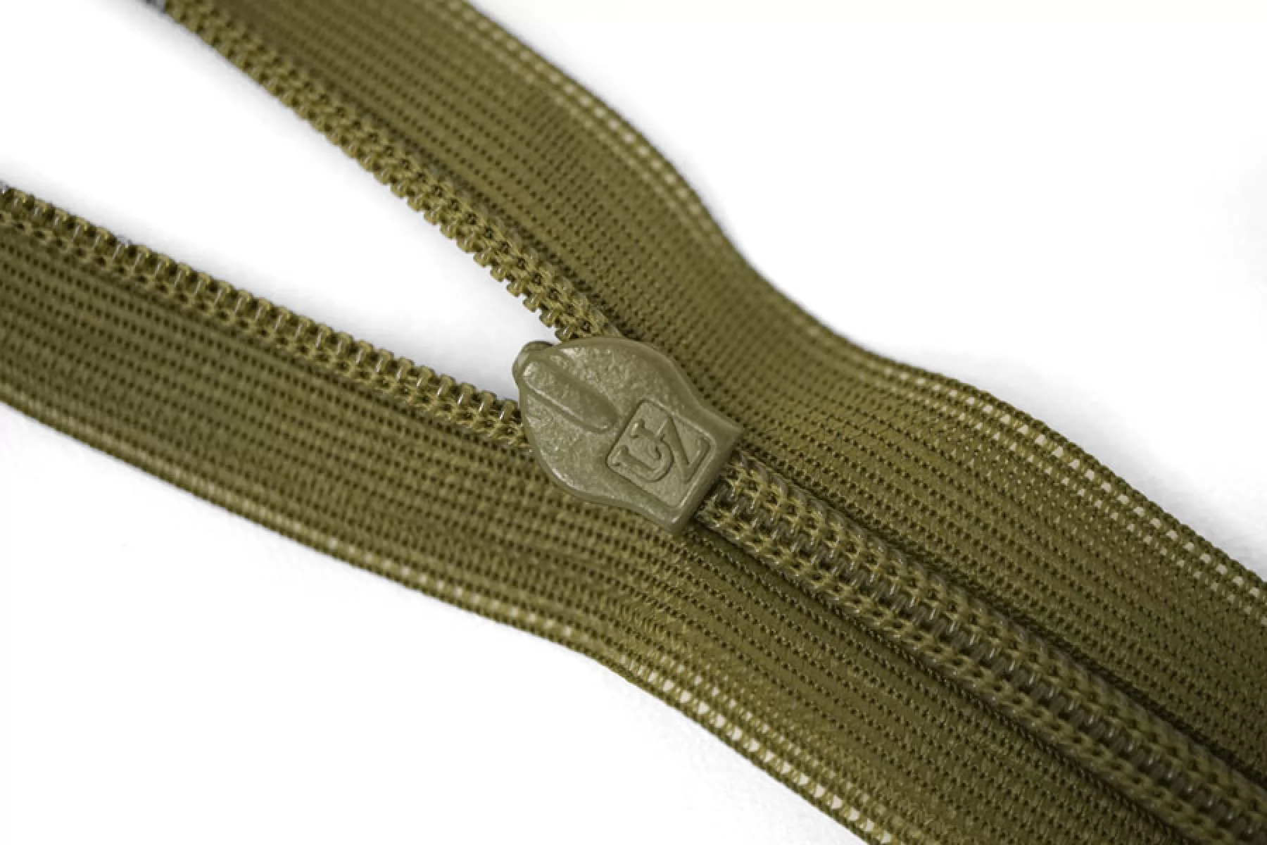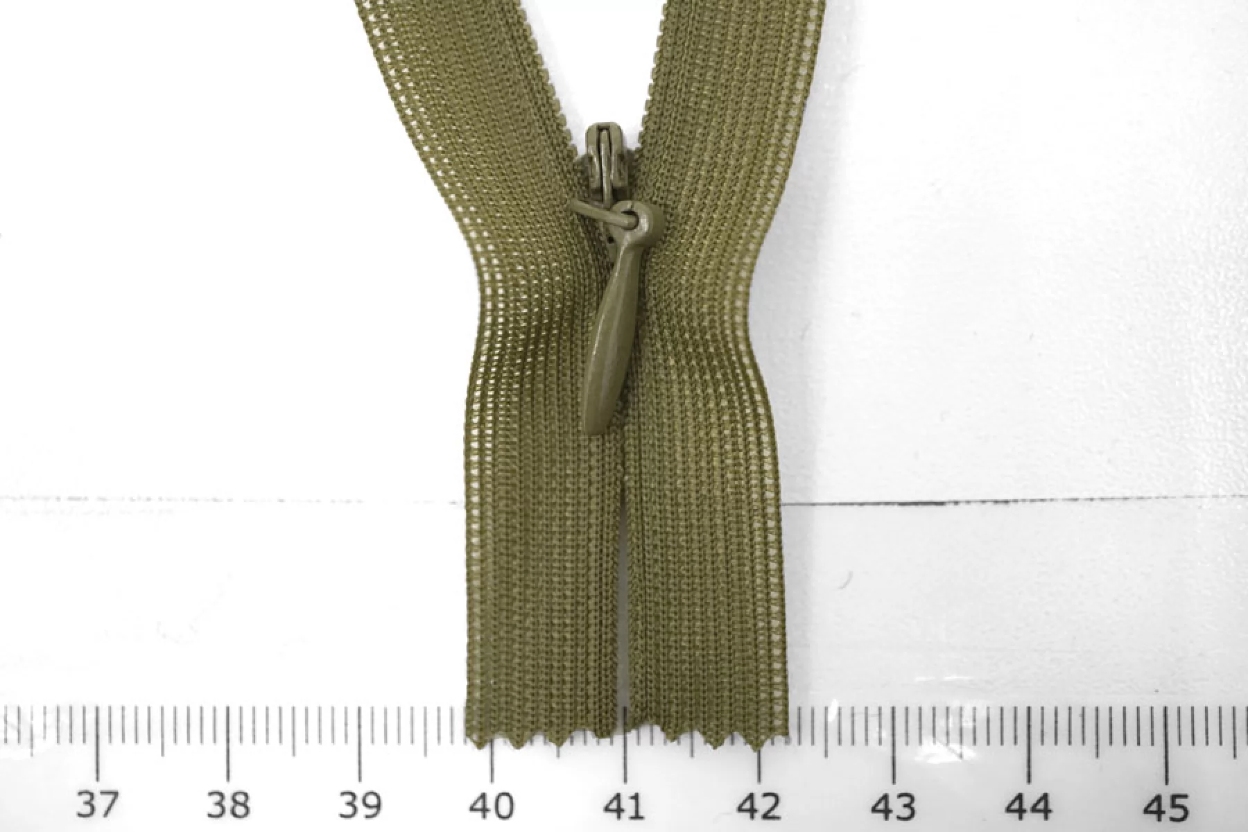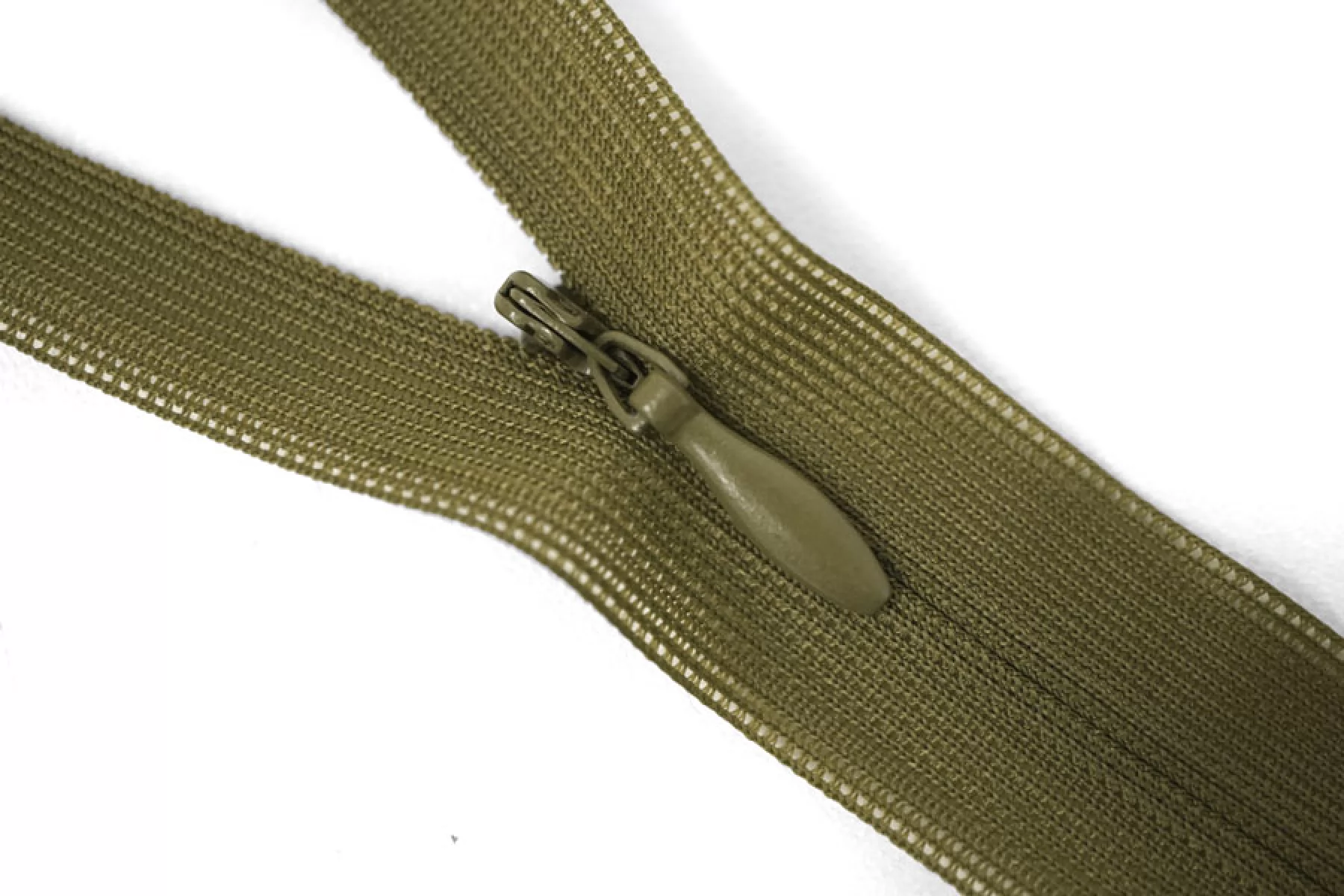 Потайная молния в оттенке хаки от бренда UZ , длина 50 см. Неразъемная. Зубцы пластиковые, слайдер и пуллер - металл. Ширина молнии 2 см. Ширина зубцов 4 мм.