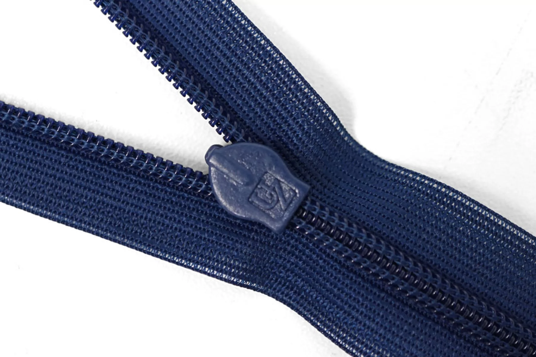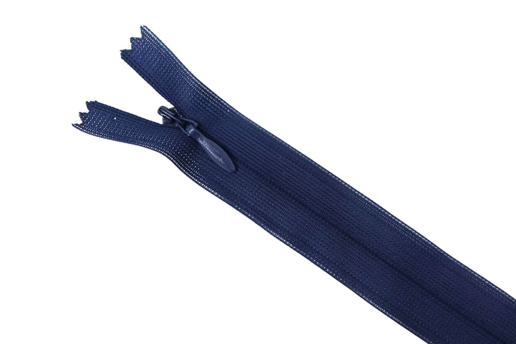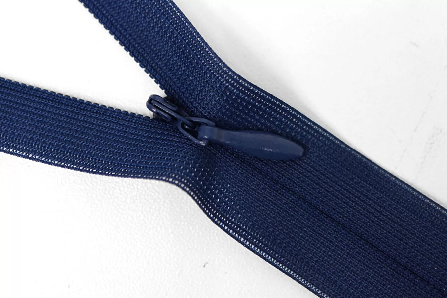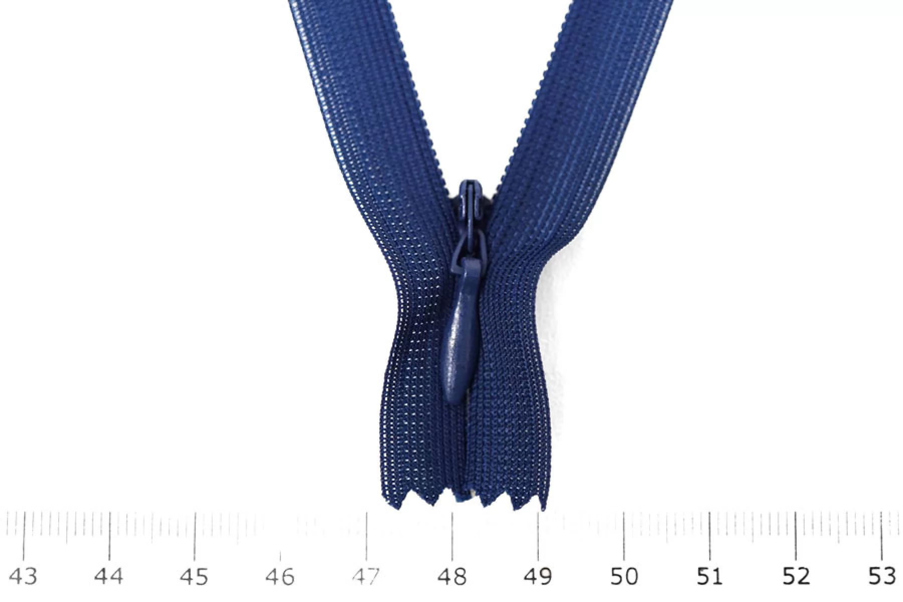 Потайная молния синего цвета от бренда UZ , длина 16см. Неразъемная. Зубцы пластиковые, слайдер и пуллер - металл. Ширина молнии 2,2 см. Ширина зубцов 4 мм.
