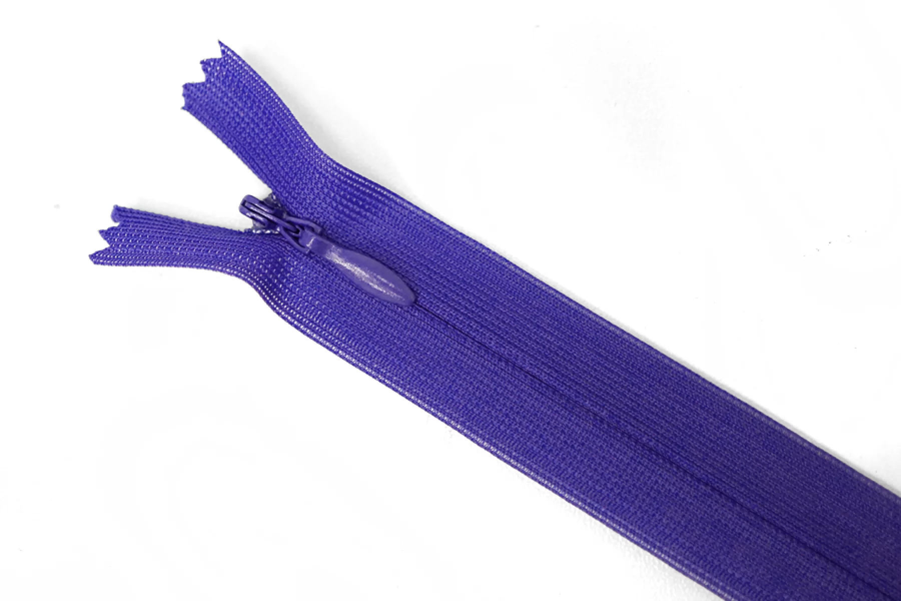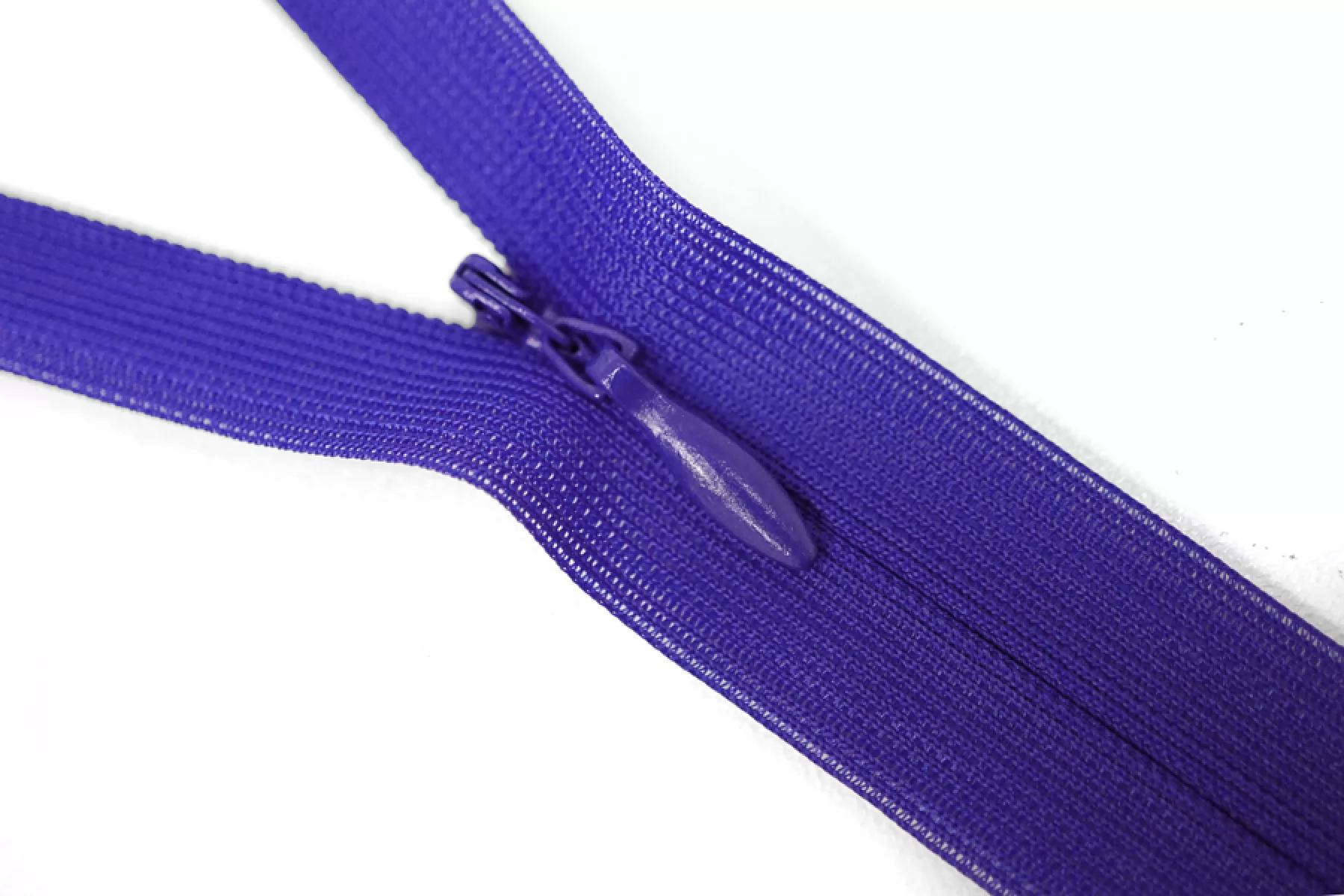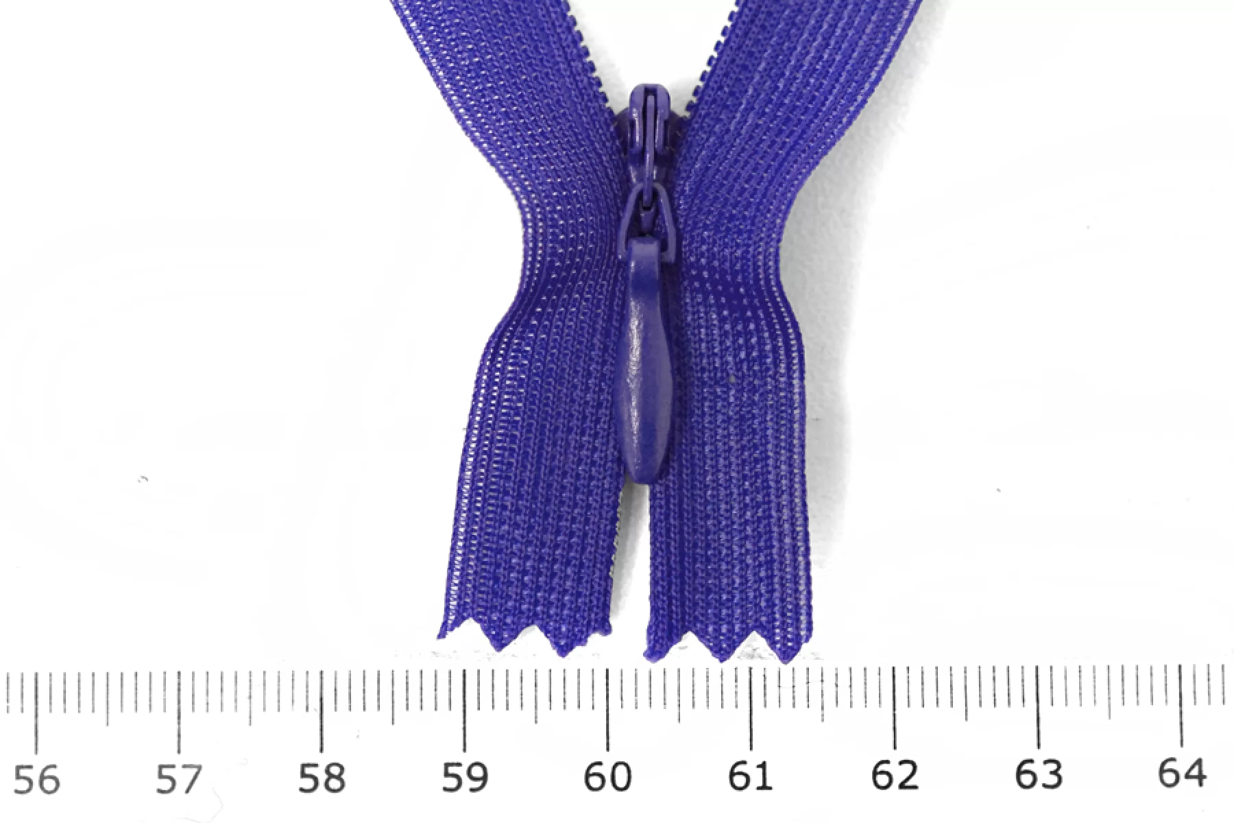 Потайная молния синего цвета от бренда UZ , длина 24 см. Неразъемная. Зубцы пластиковые, слайдер и пуллер - металл в цвет молнии. Ширина молнии 2,2 см. Ширина зубцов 4 мм.