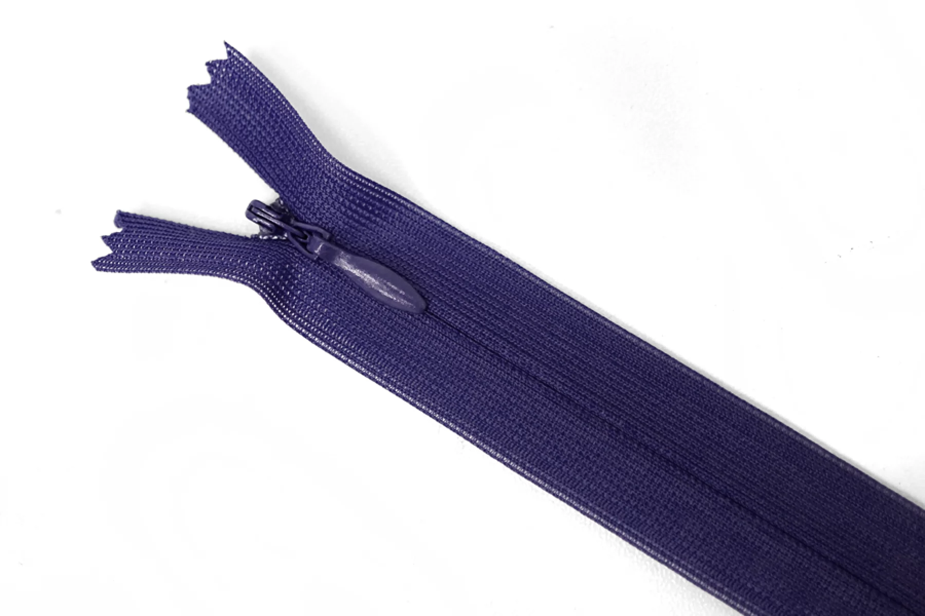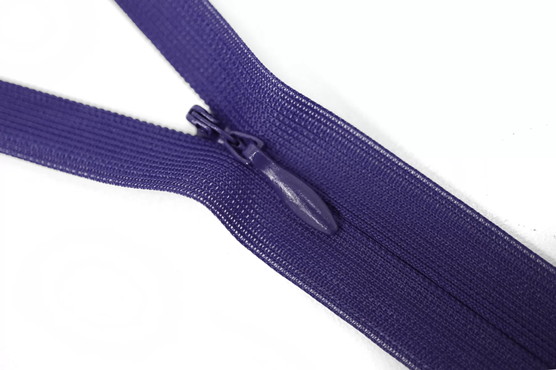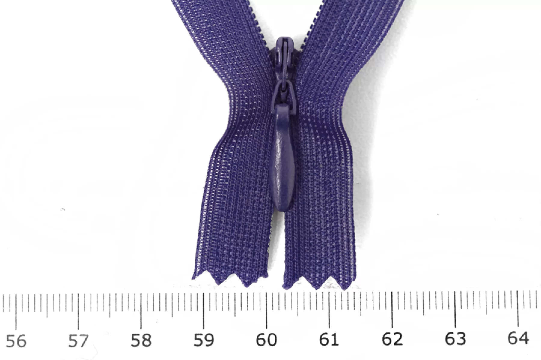 Потайная молния синего цвета от бренда UZ , длина 54 см. Неразъемная. Зубцы пластиковые, слайдер и пуллер - металл в цвет молнии. Ширина молнии 2,2 см. Ширина зубцов 4 мм.