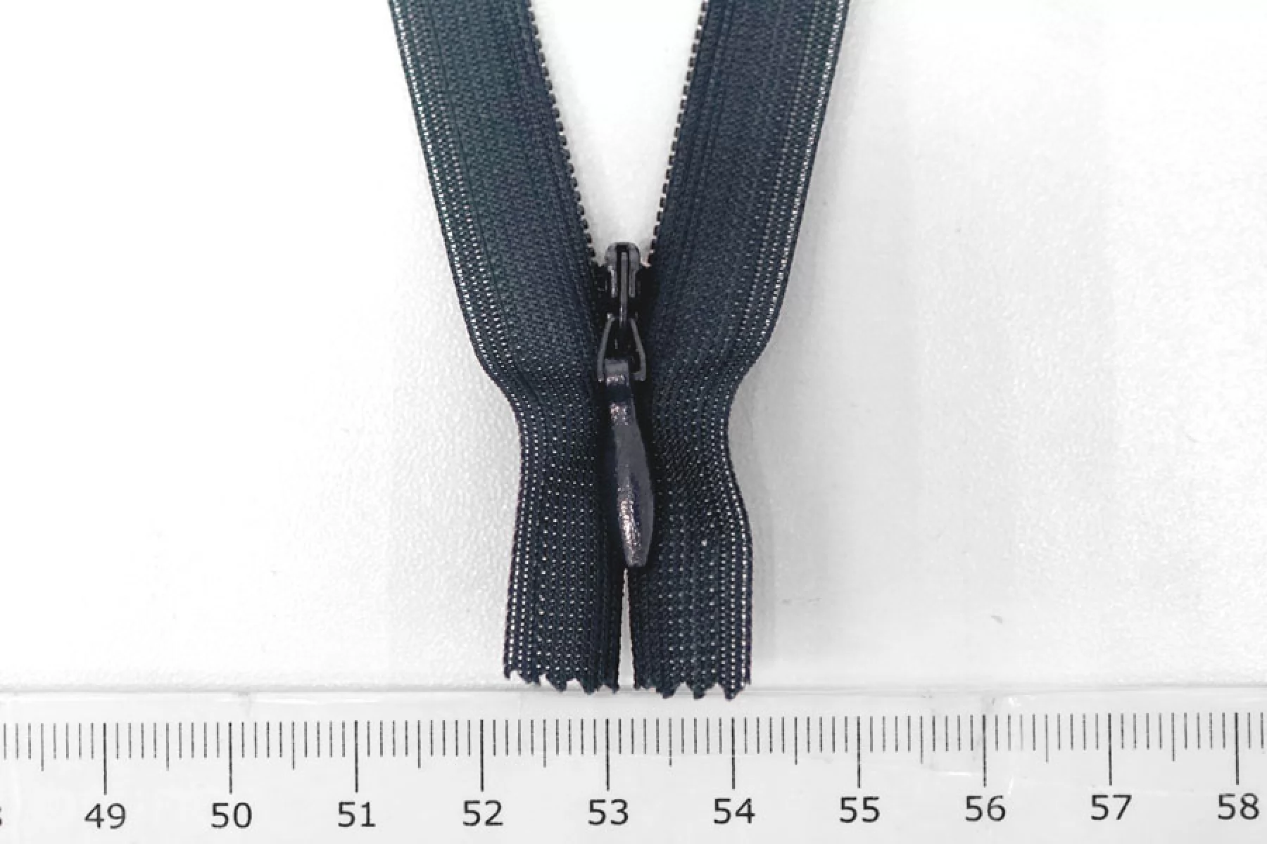 Потайная молния темно-синего цвета , длина 20 см. Неразъемная. Зубцы пластиковые, слайдер и пуллер - металл в цвет молнии. Ширина молнии 2,2 см. Ширина зубцов 4 мм.