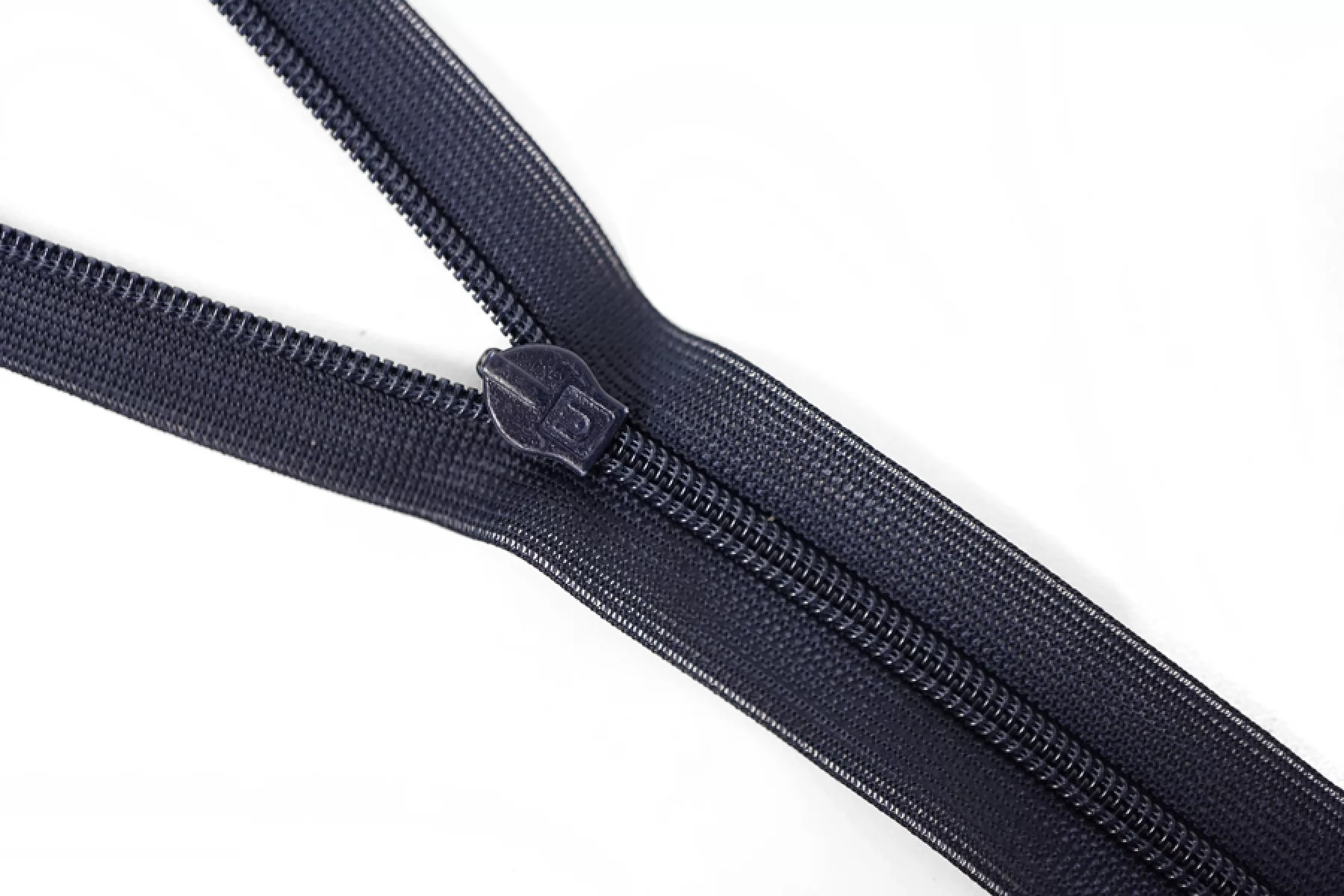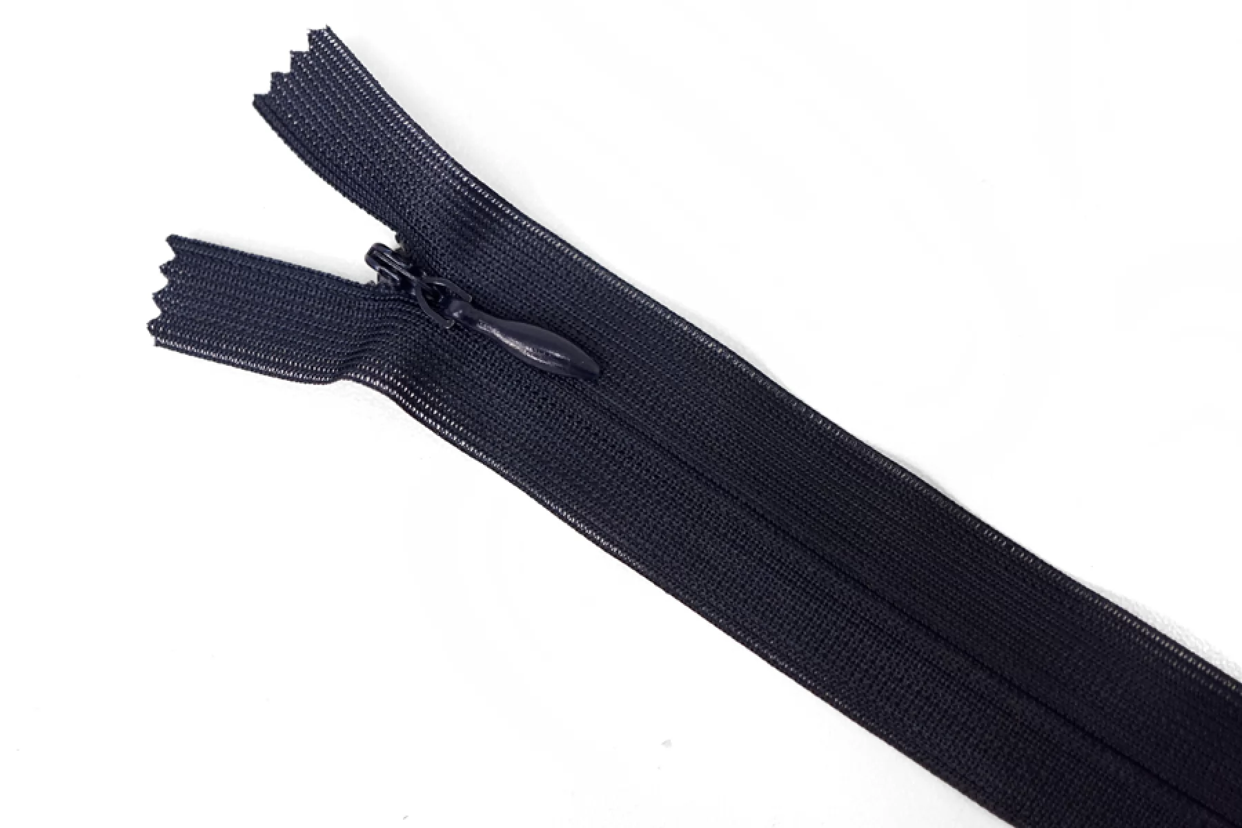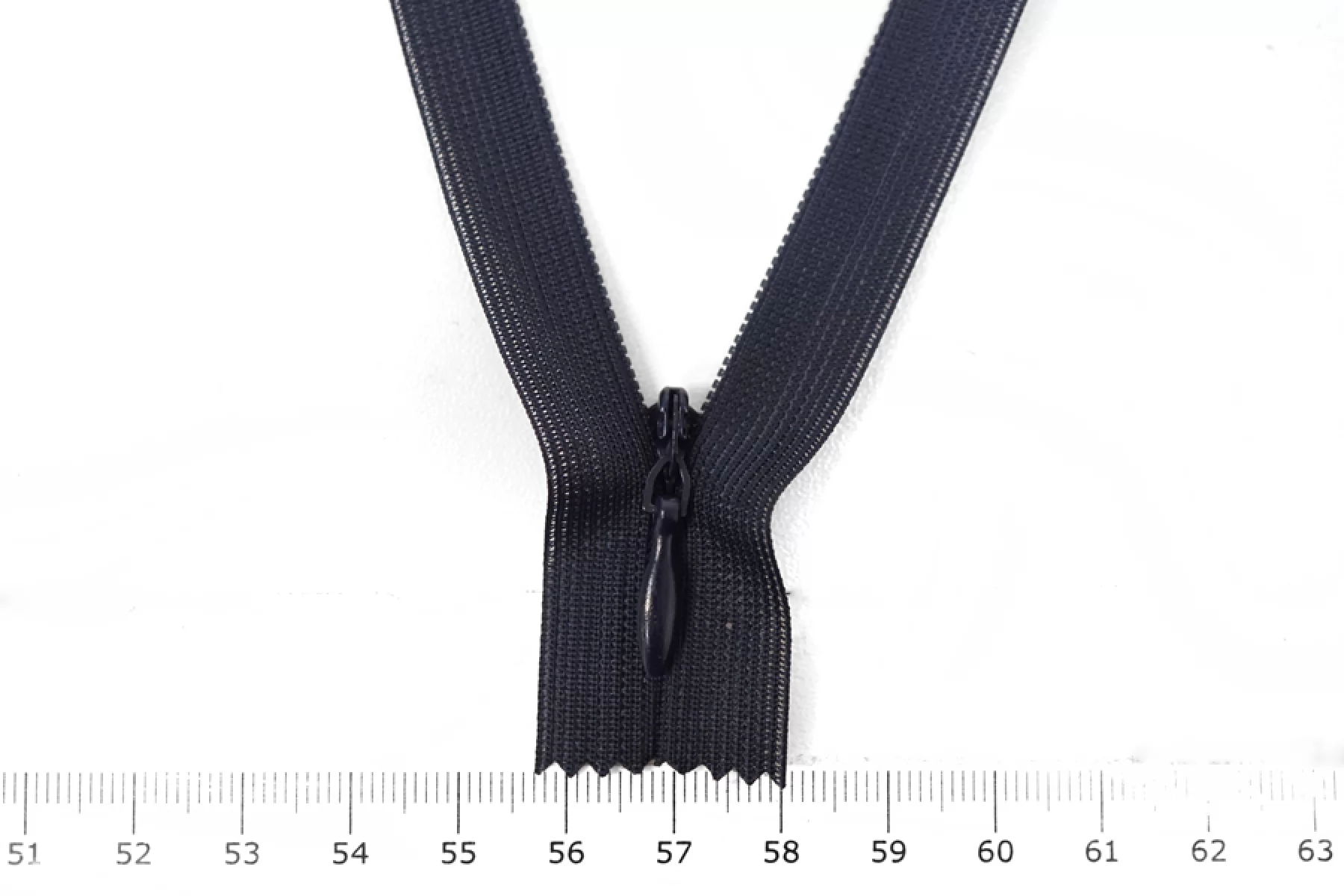 Потайная молния темно-синего цвета от бренда UZ , длина 55 см. Неразъемная. Зубцы пластиковые, слайдер и пуллер - металл в цвет молнии. Ширина молнии 2,2 см. Ширина зубцов 4 мм.