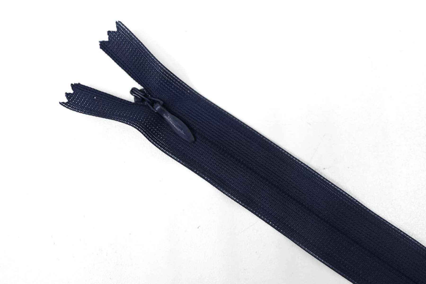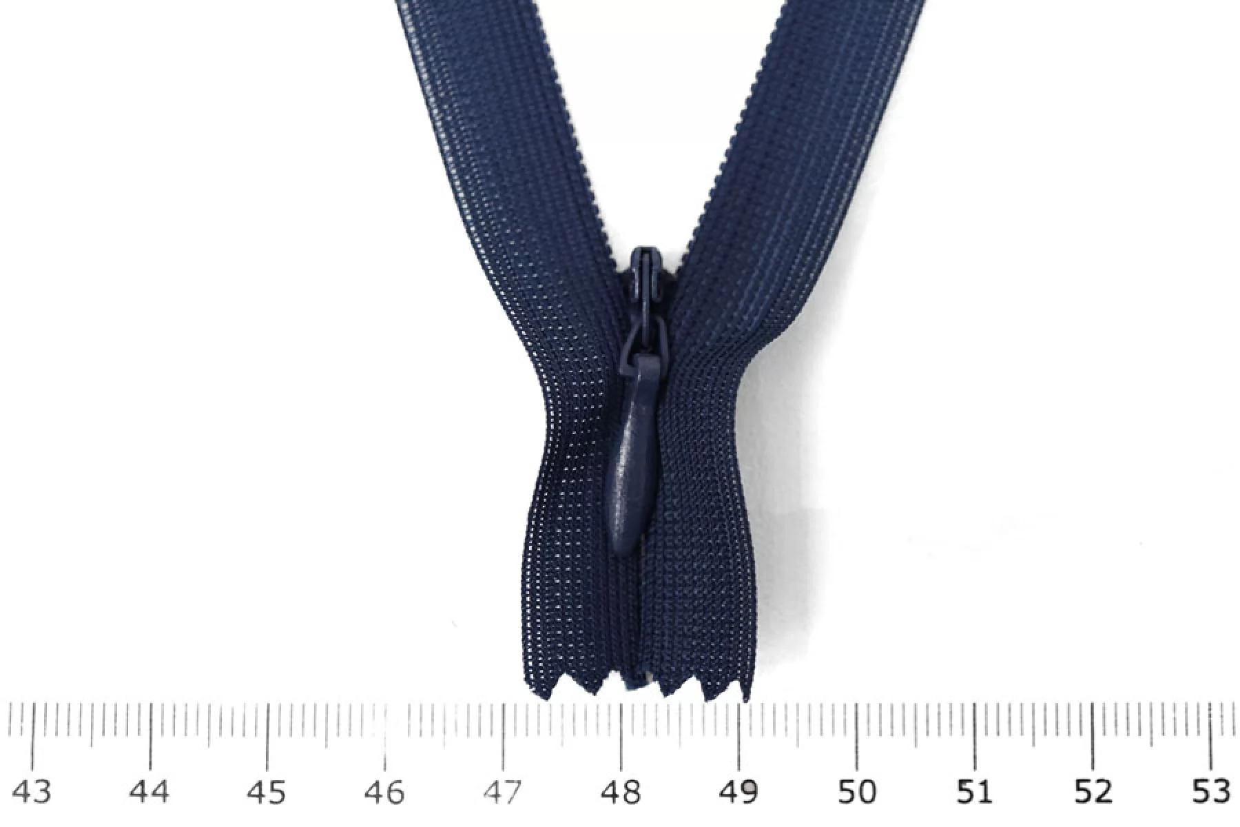 Потайная молния темно-синего цвета от бренда UZ , длина 56 см. Неразъемная. Зубцы пластиковые, слайдер и пуллер - металл. Ширина молнии 2,2 см. Ширина зубцов 4 мм.