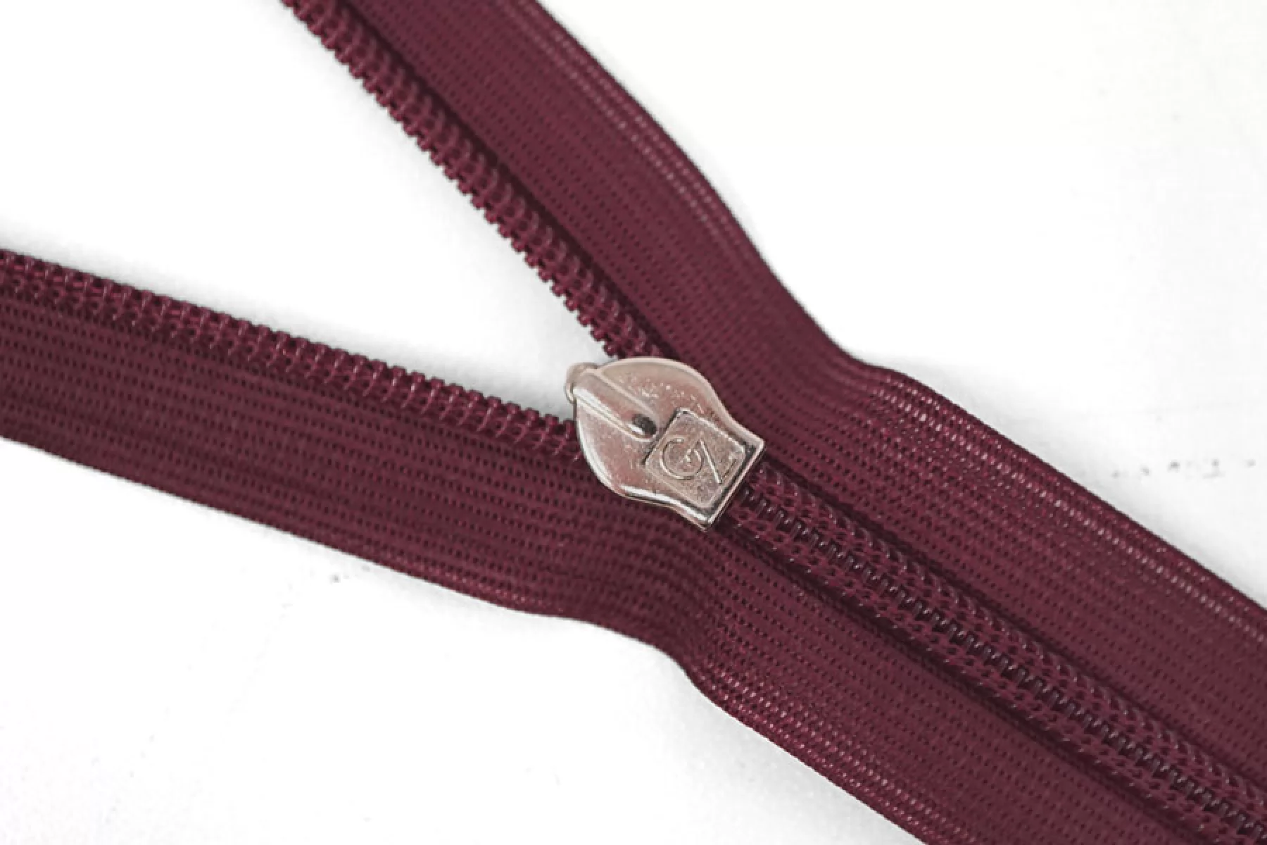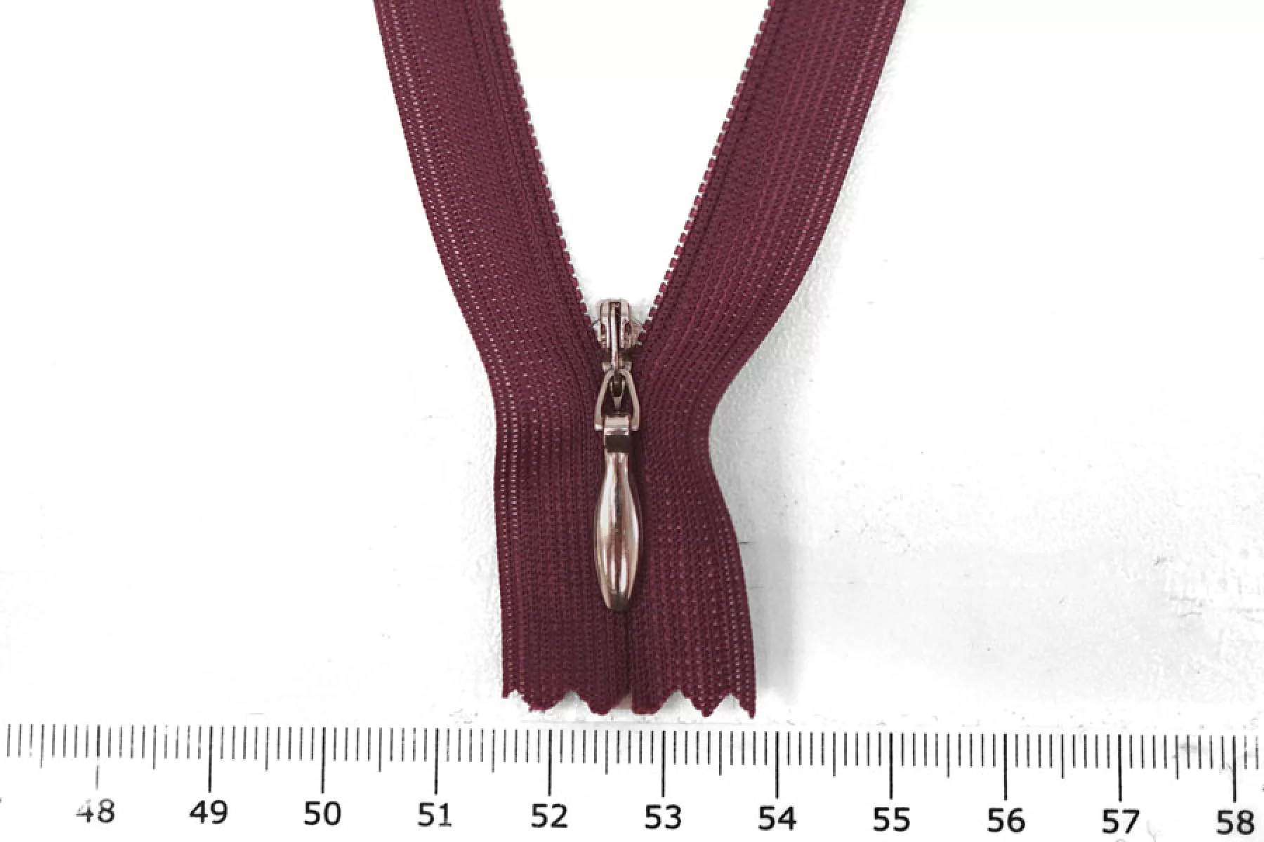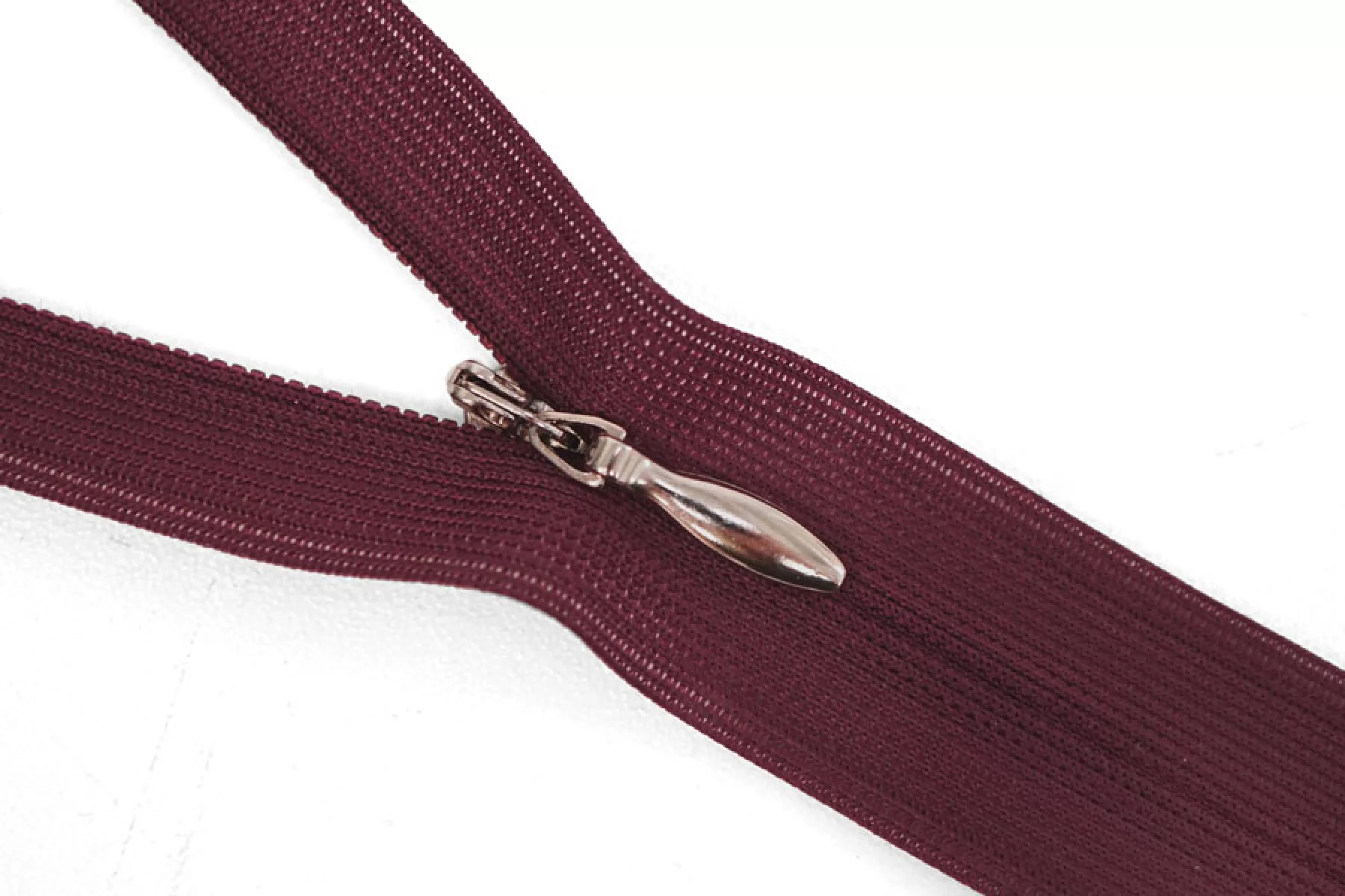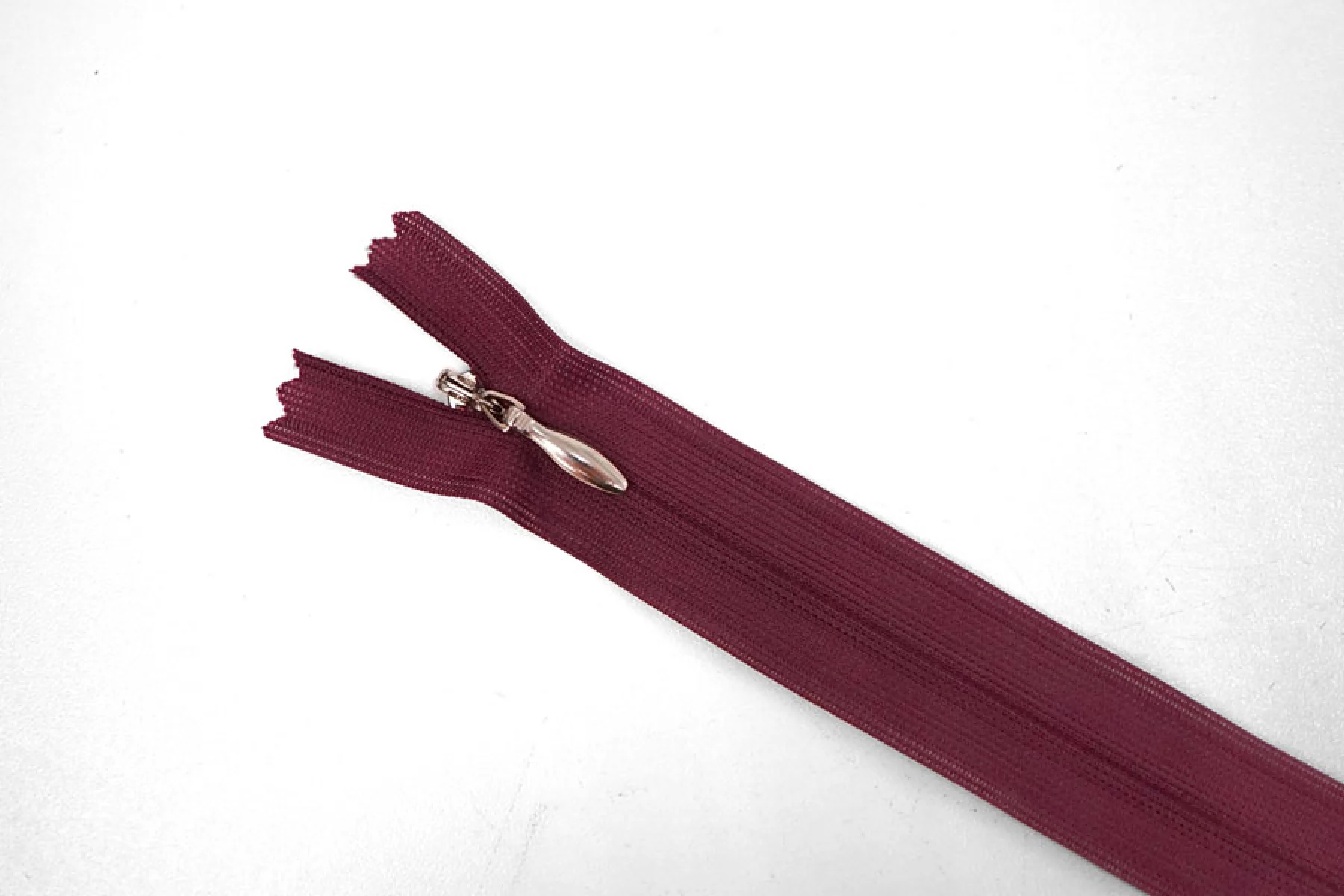 Потайная молния , бордового цвета от бренда GZ, длина 18 см. Неразъемная. Зубцы пластиковые, слайдер и пуллер металлические. Ширина молнии 2,2 см. Ширина зубцов 5 мм.