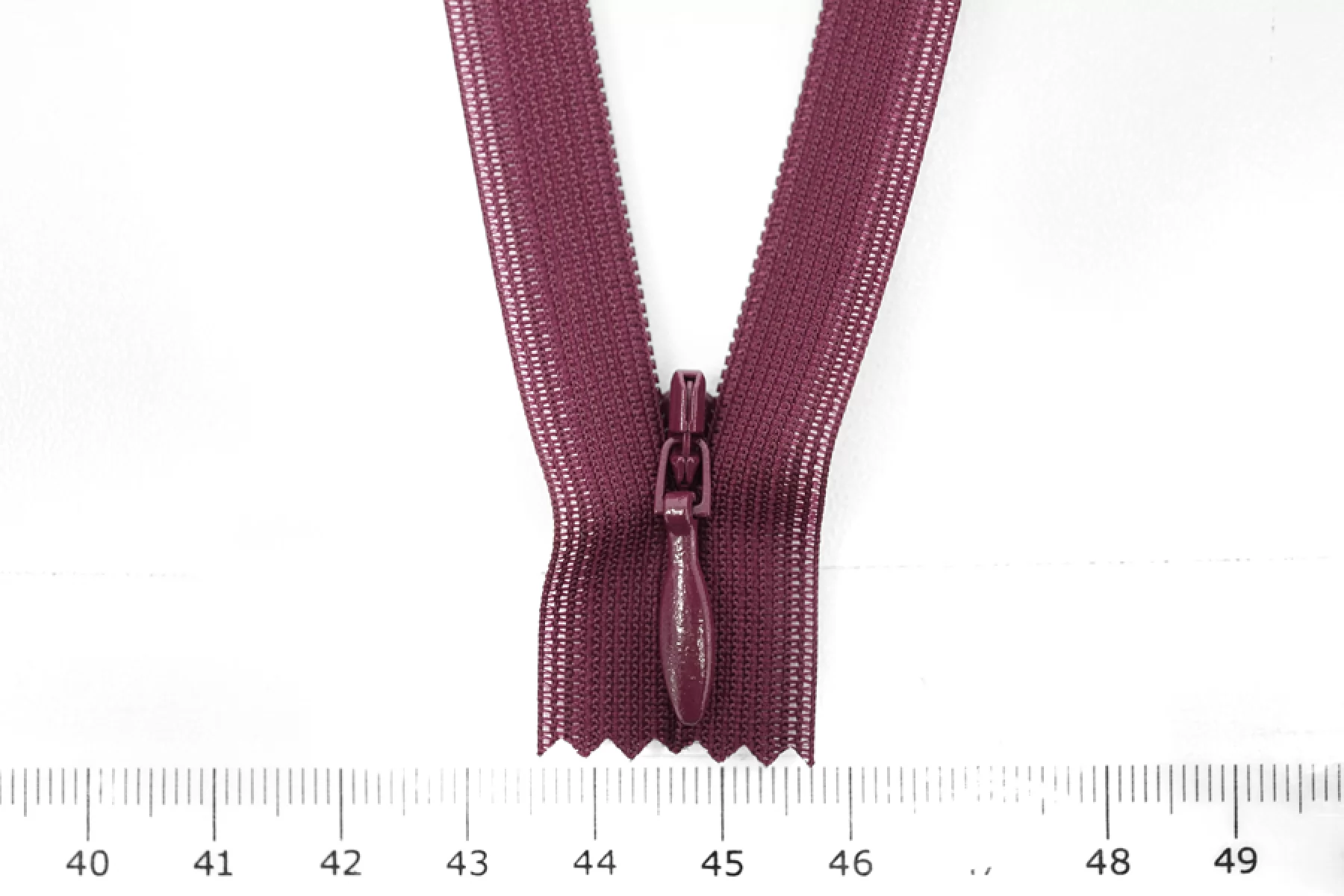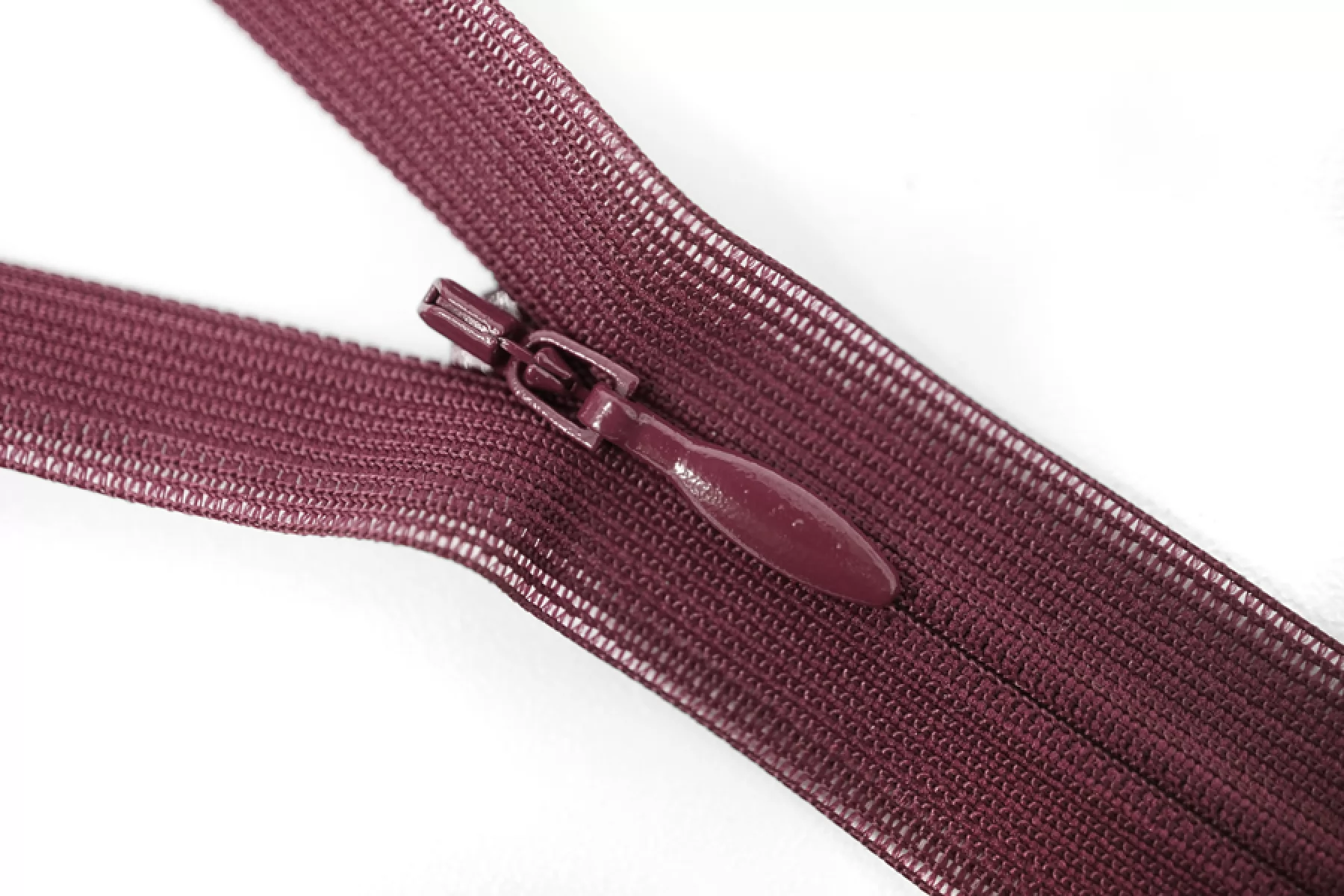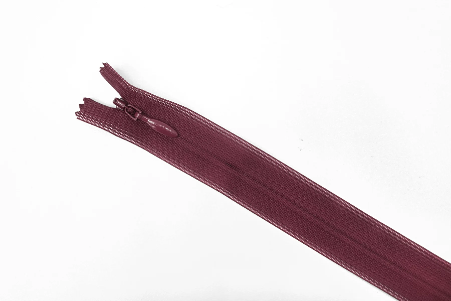 Потайная молния вишневого цвета от бренда YKK, длина 19,5 см. Неразъемная. Зубцы пластиковые, слайдер и пуллер металл вишневого цвета. Ширина молнии 2,1 см. Ширина зубцов 5 мм.