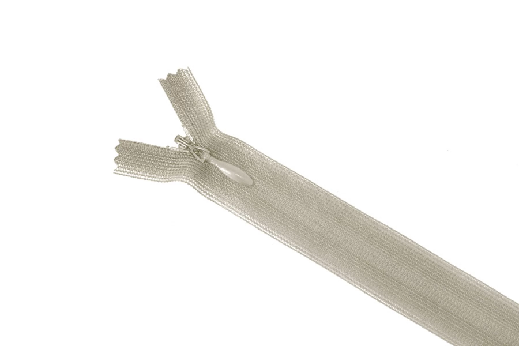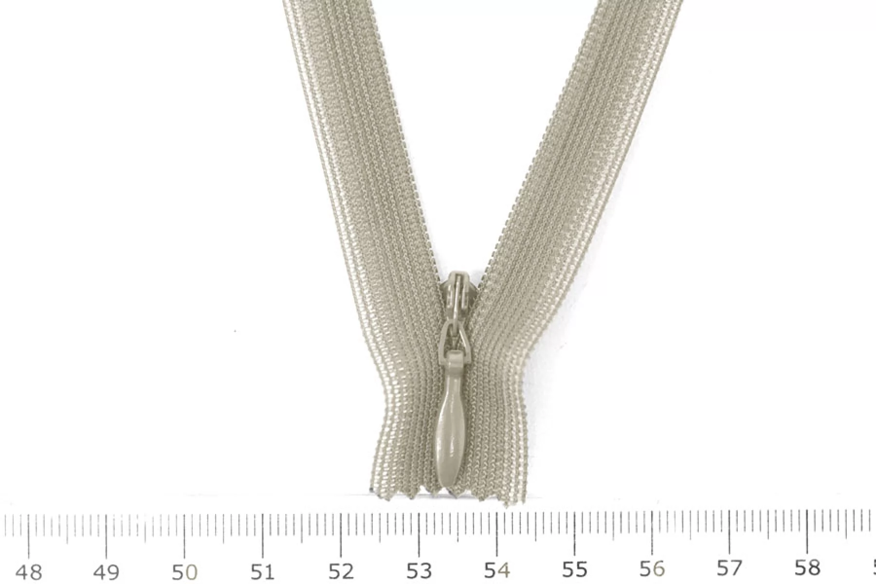 Потайная молния бежево-зеленого цвета , длина 19 см. Слайдер и пуллер - метал. в цвет молнии. Ширина молнии 2.2 см , ширина зубцов 4мм.