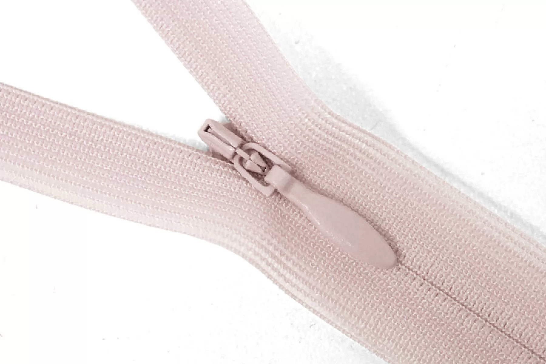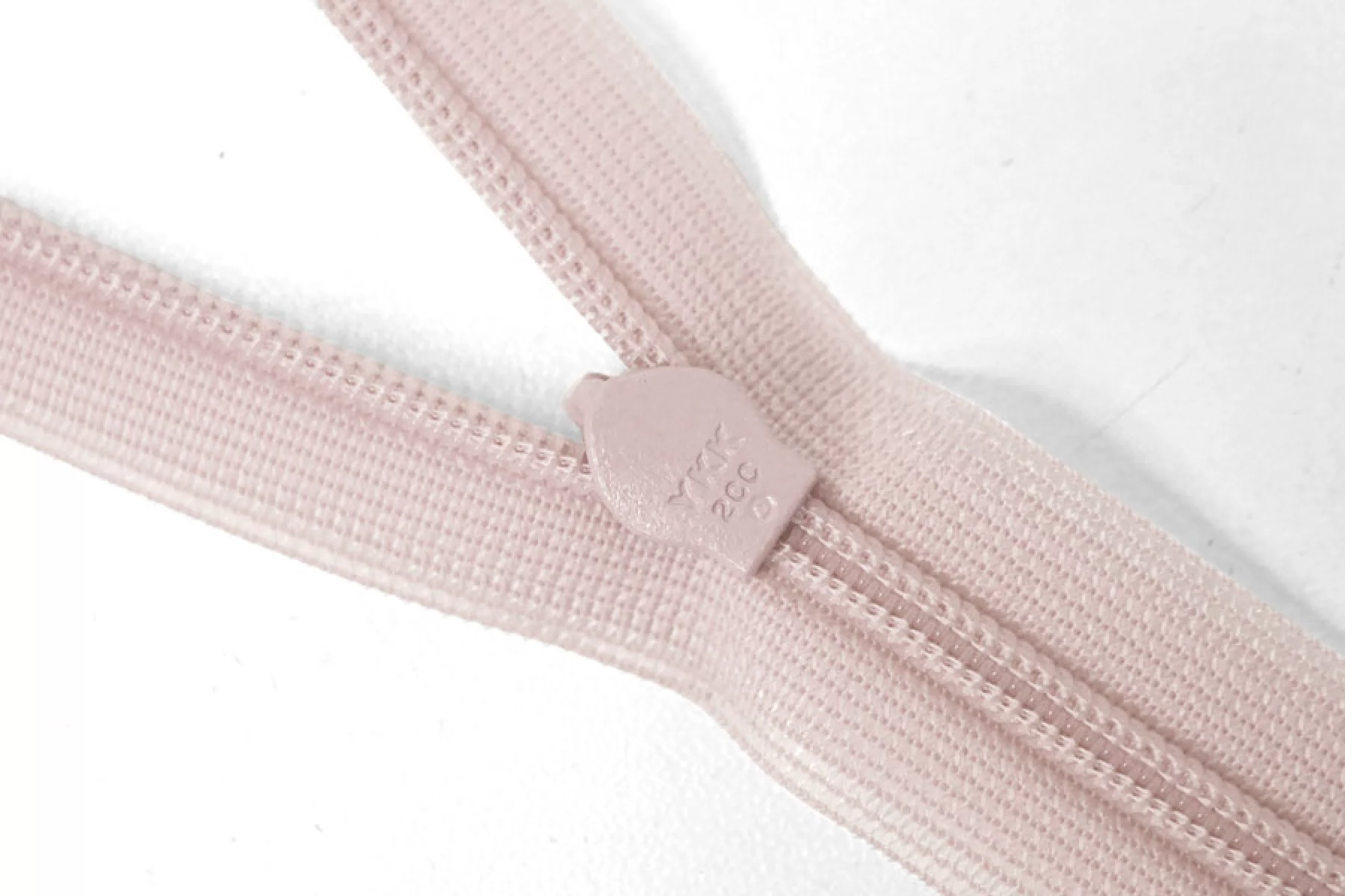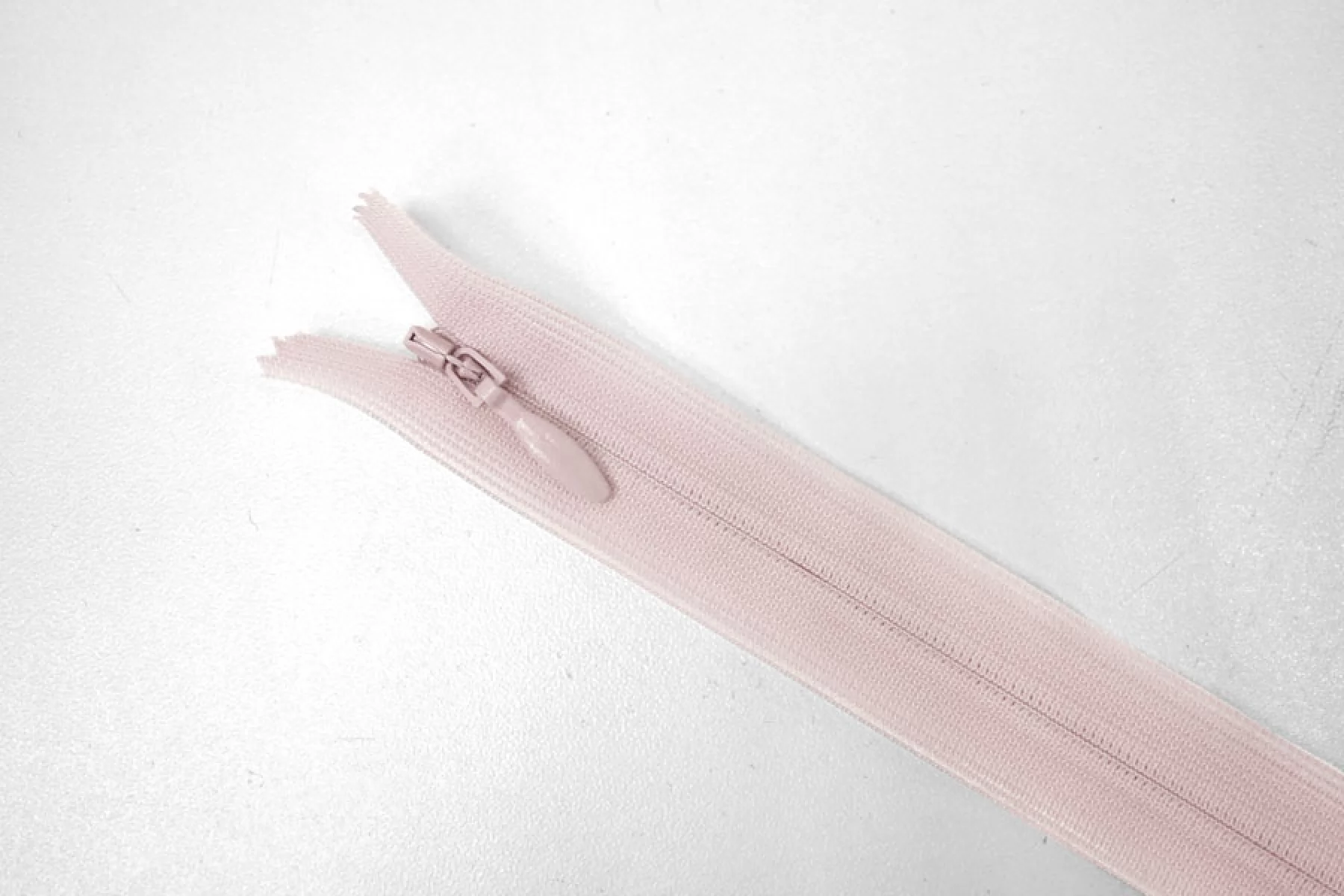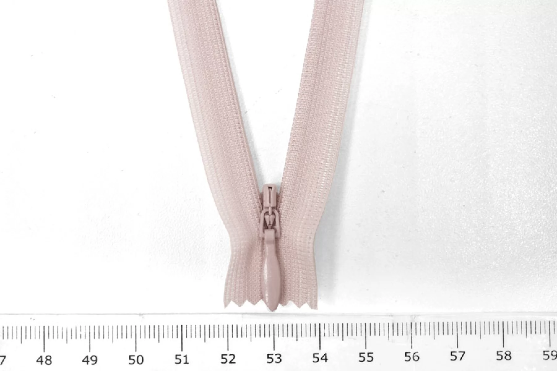 Потайная молния в бежевато- пудровом оттенке от бренда YKK , длина 65 см. Неразъемная. Зубцы пластиковые, слайдер и пуллер - металл. Ширина молнии 2,2 см. Ширина зубцов 4 мм.