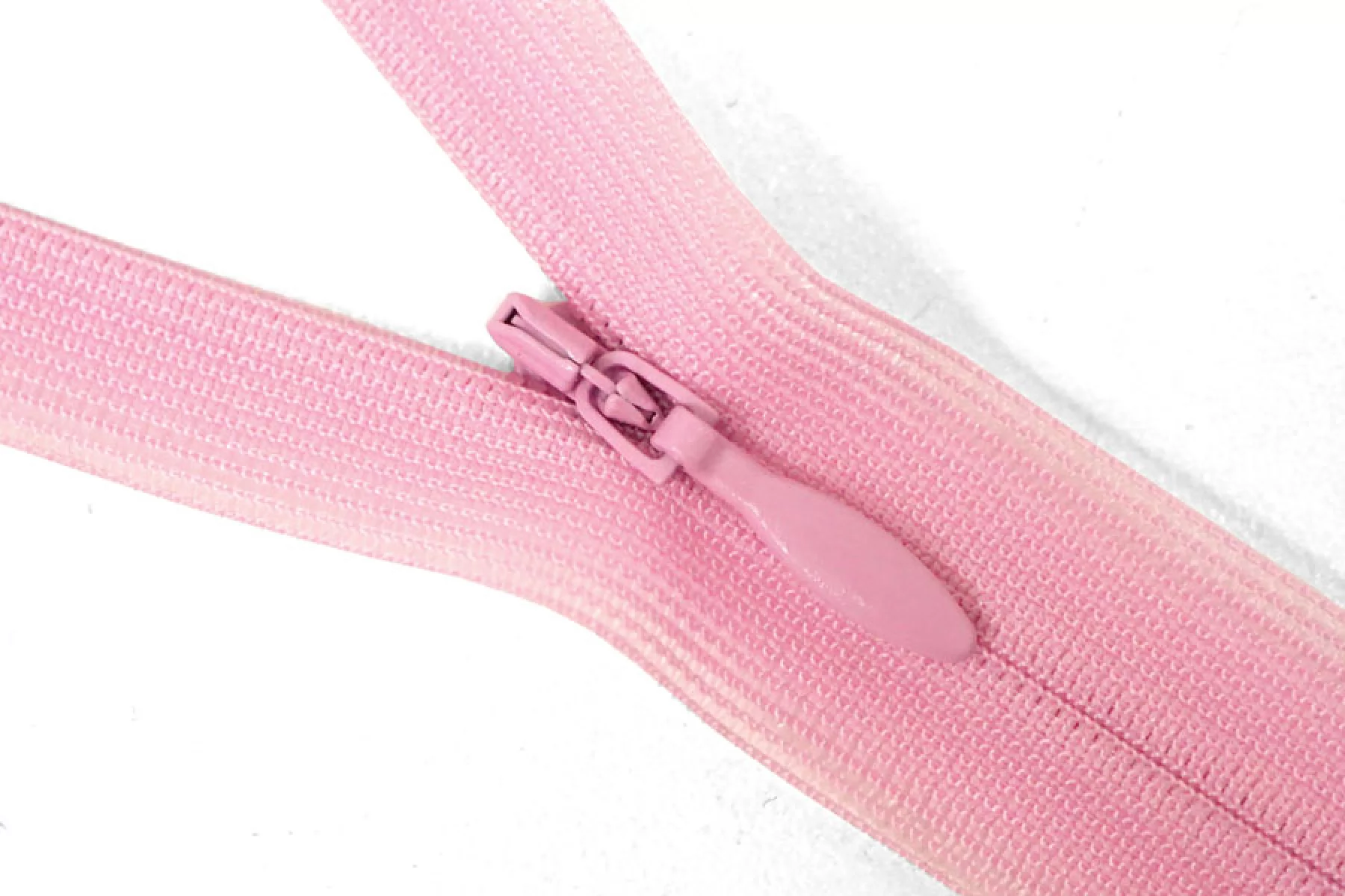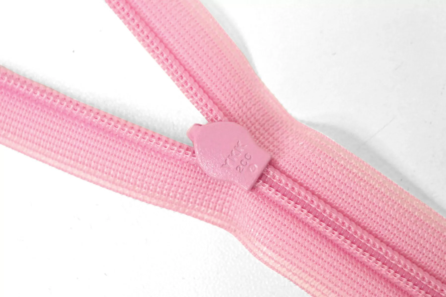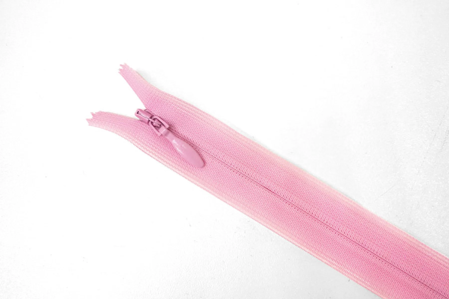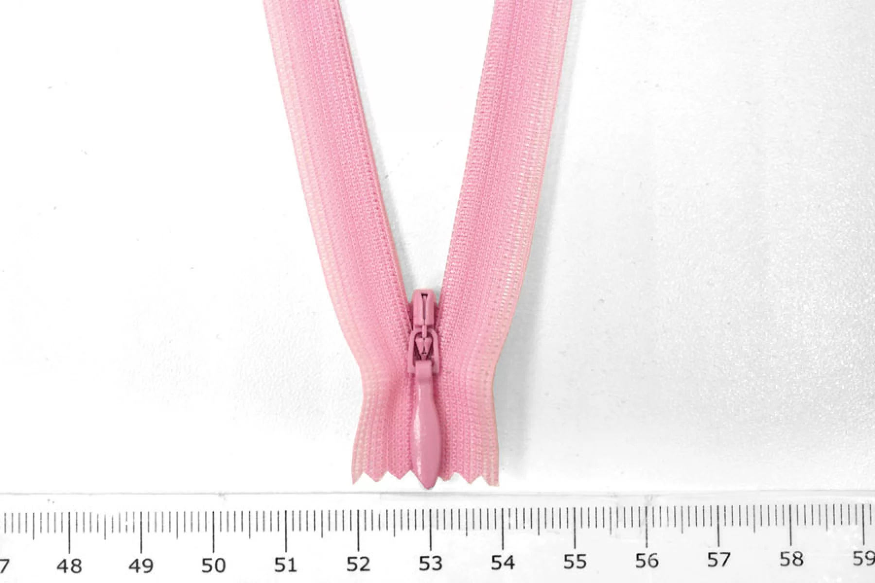 Потайная молния в розовом оттенке от бренда YKK , длина 64 см. Неразъемная. Зубцы пластиковые, слайдер и пуллер - металл. Ширина молнии 2,2 см. Ширина зубцов 4 мм.