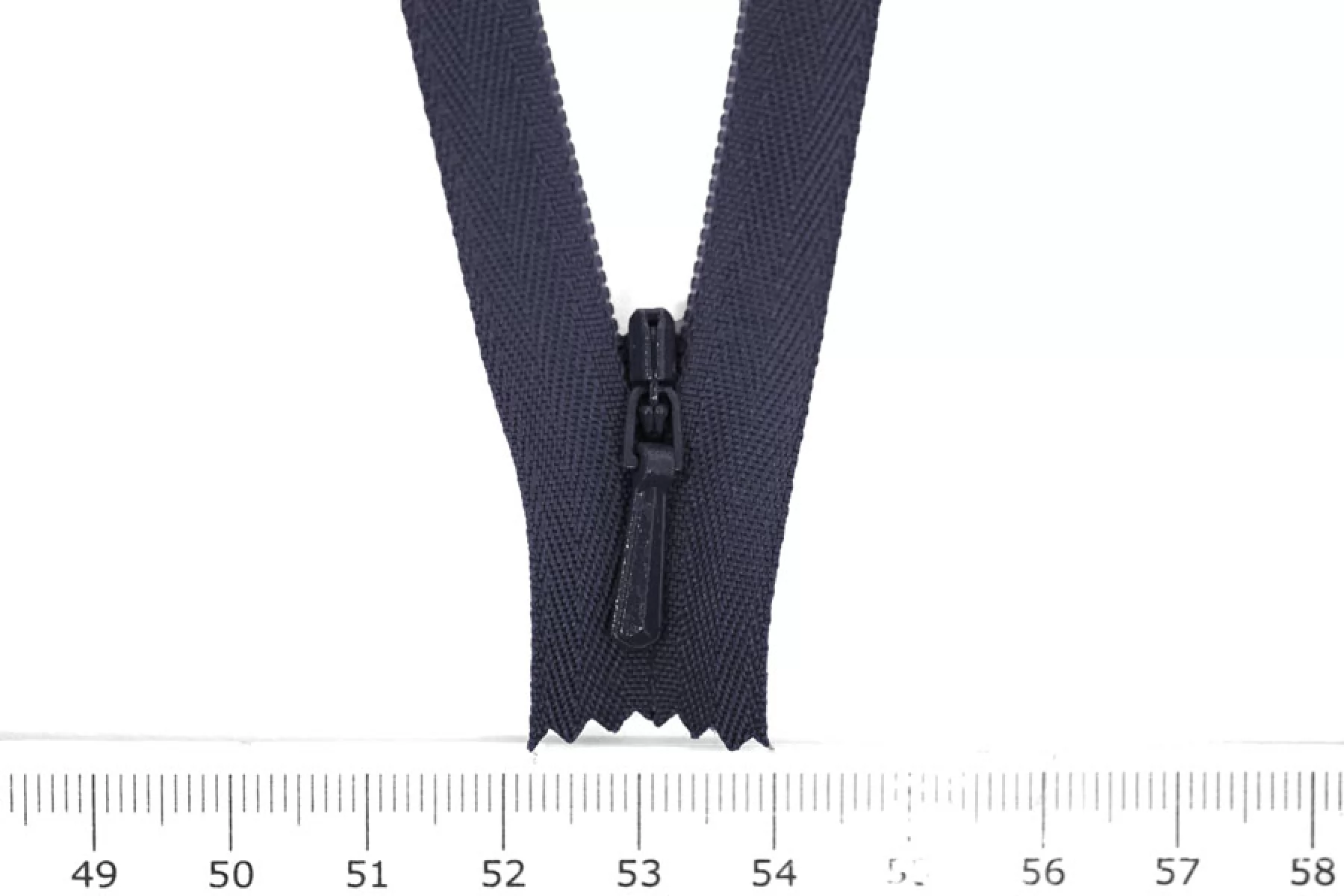 Потайная молния темно-синего цвета , длина 22 см. Неразъемная. Зубцы пластиковые, слайдер и пуллер - металл в цвет молнии. Ширина молнии 2,2 см. Ширина зубцов 4 мм.