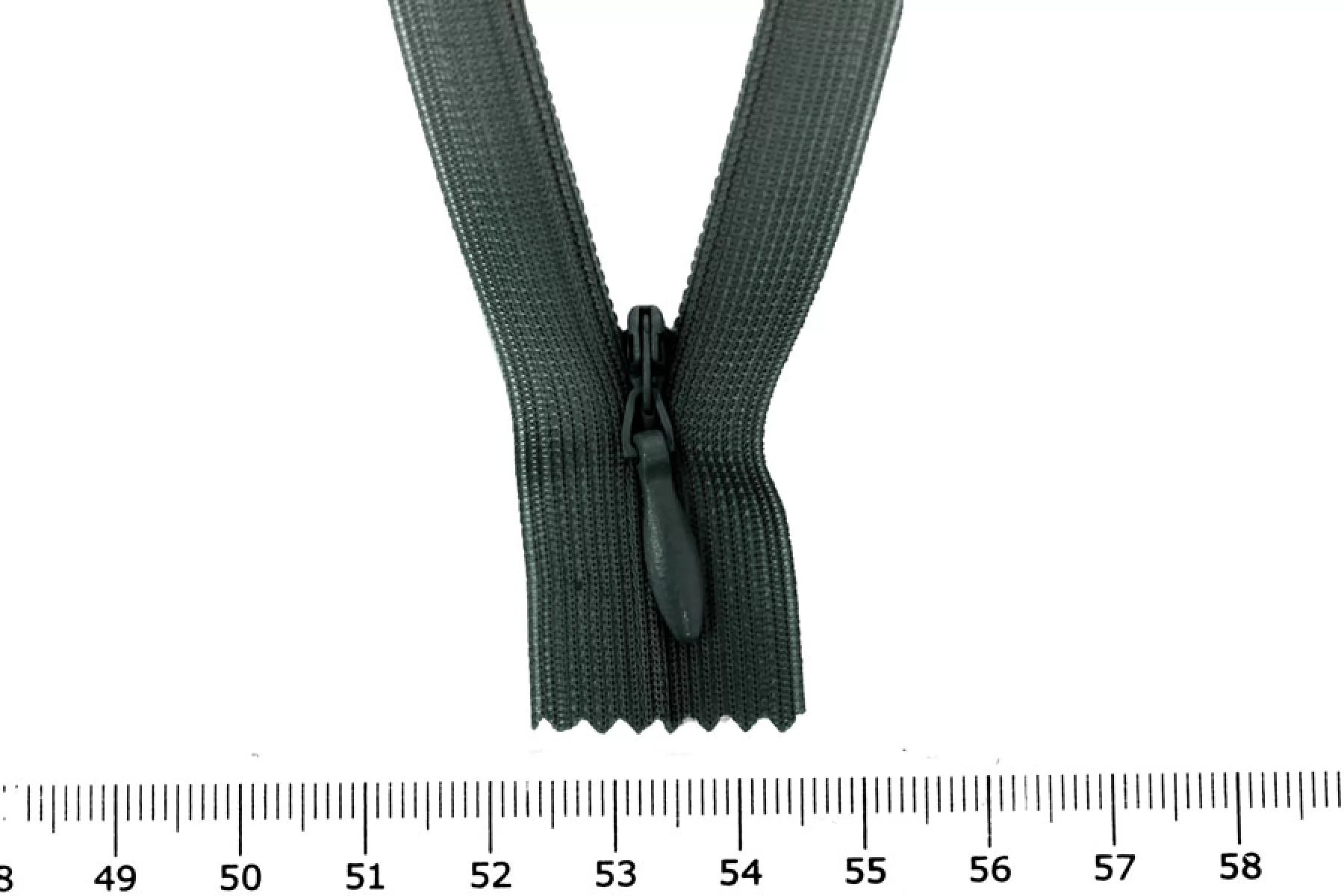 Потайная молния темно-зеленого цвета , длина 18 см. Слайдер и пуллер - метал. в цвет молнии. Ширина молнии 2.2 см , ширина зубцов 4мм.