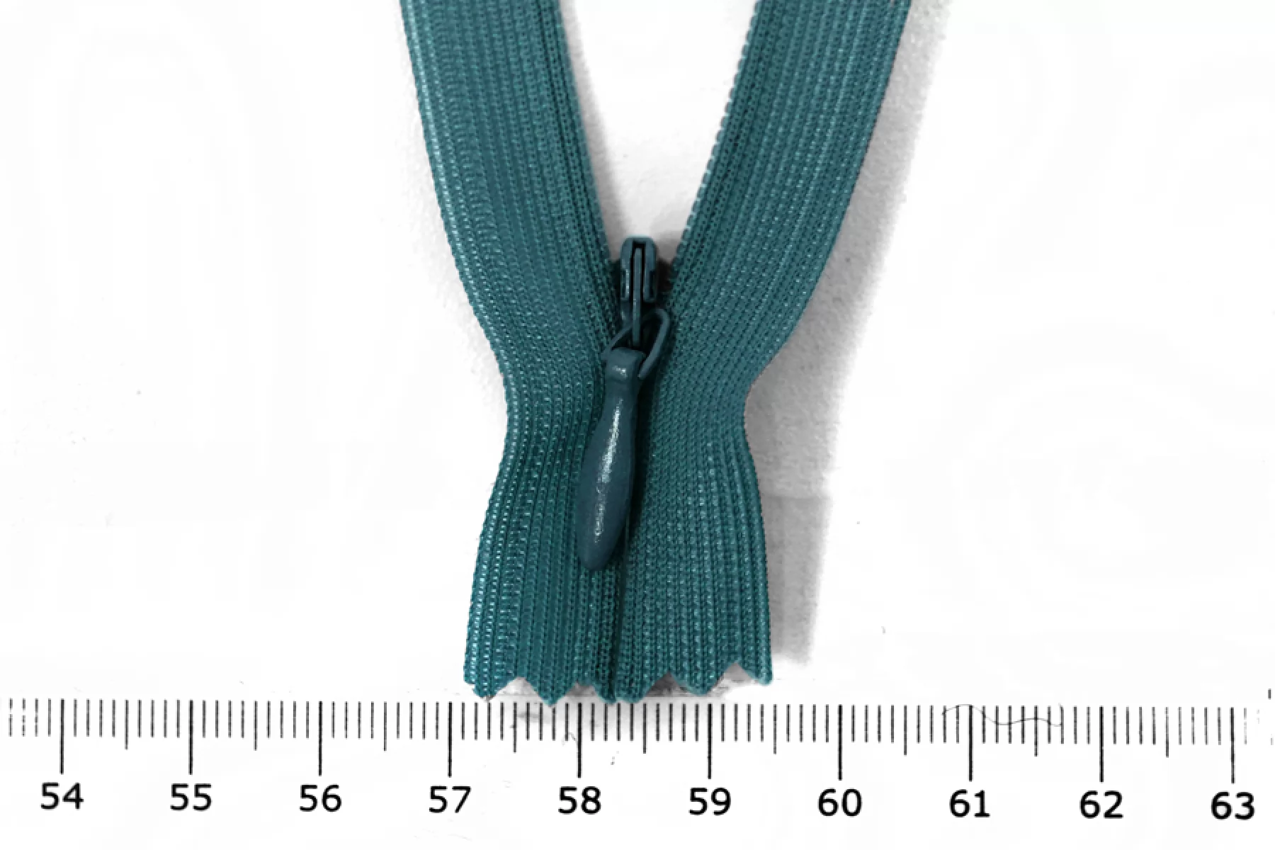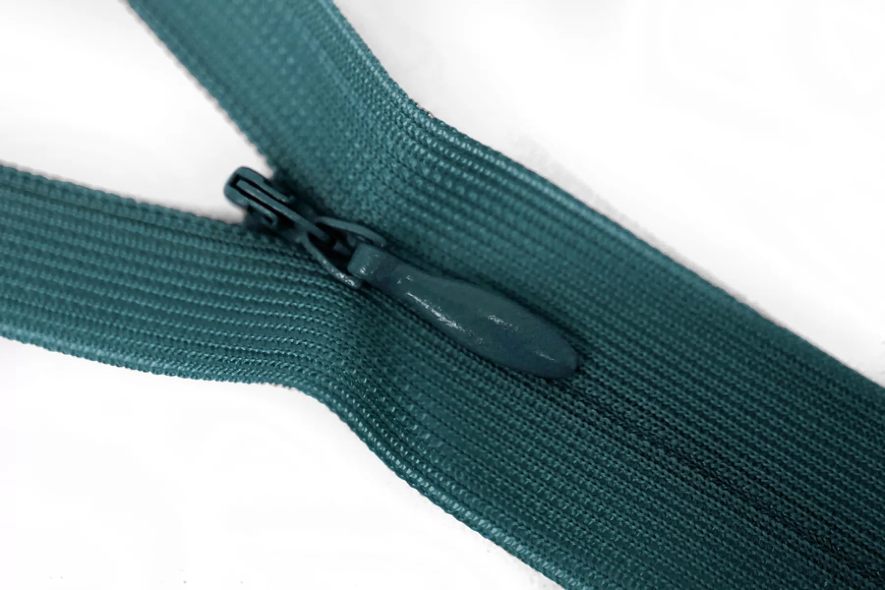 Потайная молния зеленого цвета , длина 18 см. Слайдер и пуллер - метал. в цвет молнии. Ширина молнии 2.2 см , ширина зубцов 4мм.