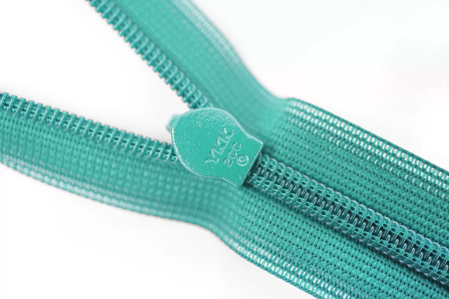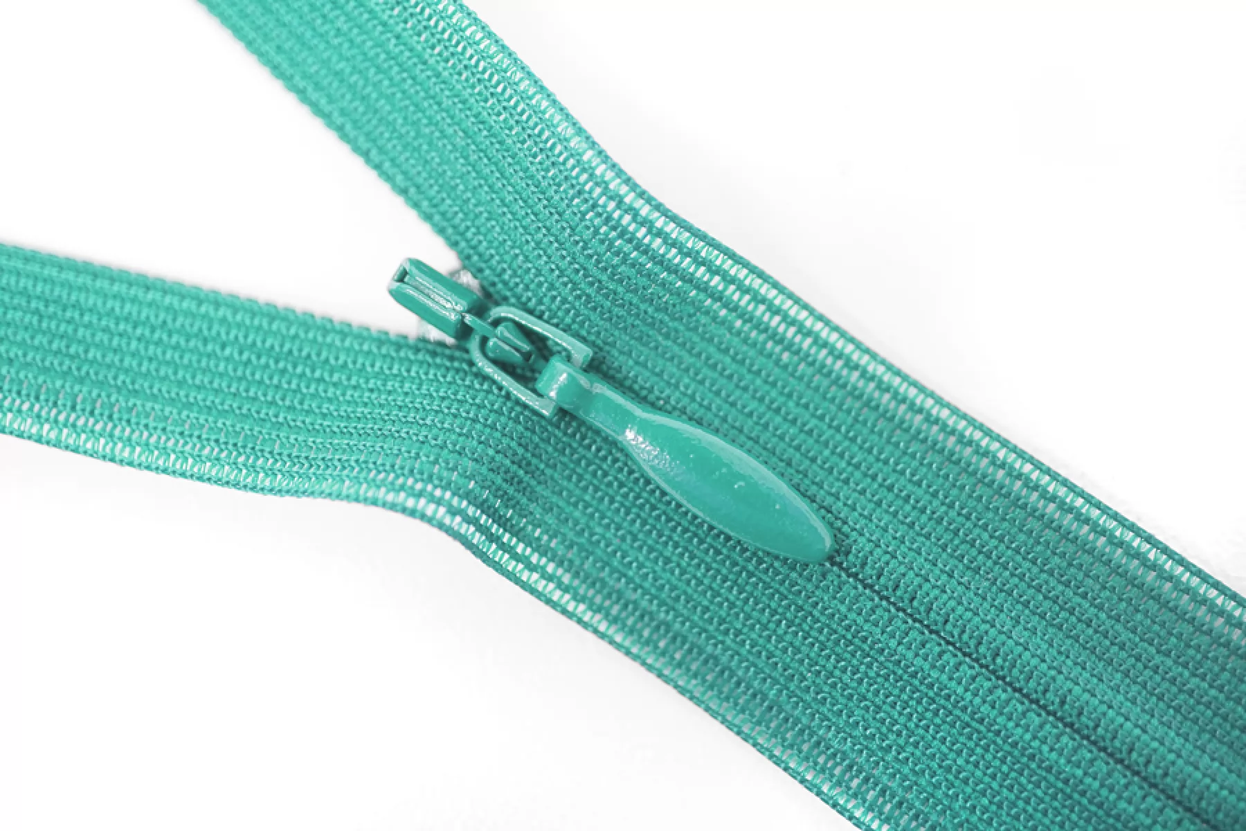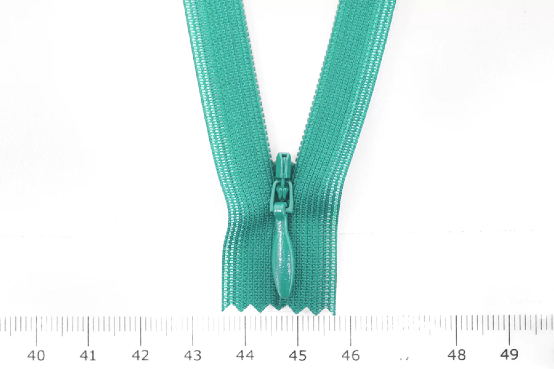 Потайная молния зелено-бирюзового оттенка от бренда YKK , длина 42 см. Неразъемная. Зубцы пластиковые, слайдер и пуллер - металл. Ширина молнии 1,8 см. Ширина зубцов 4 мм.