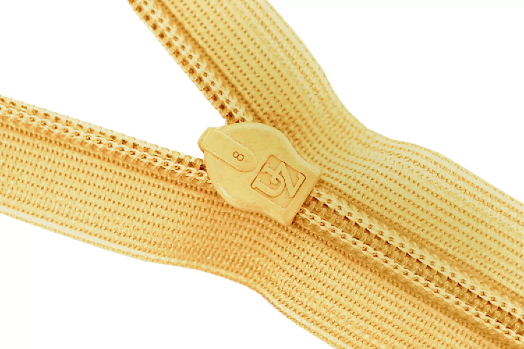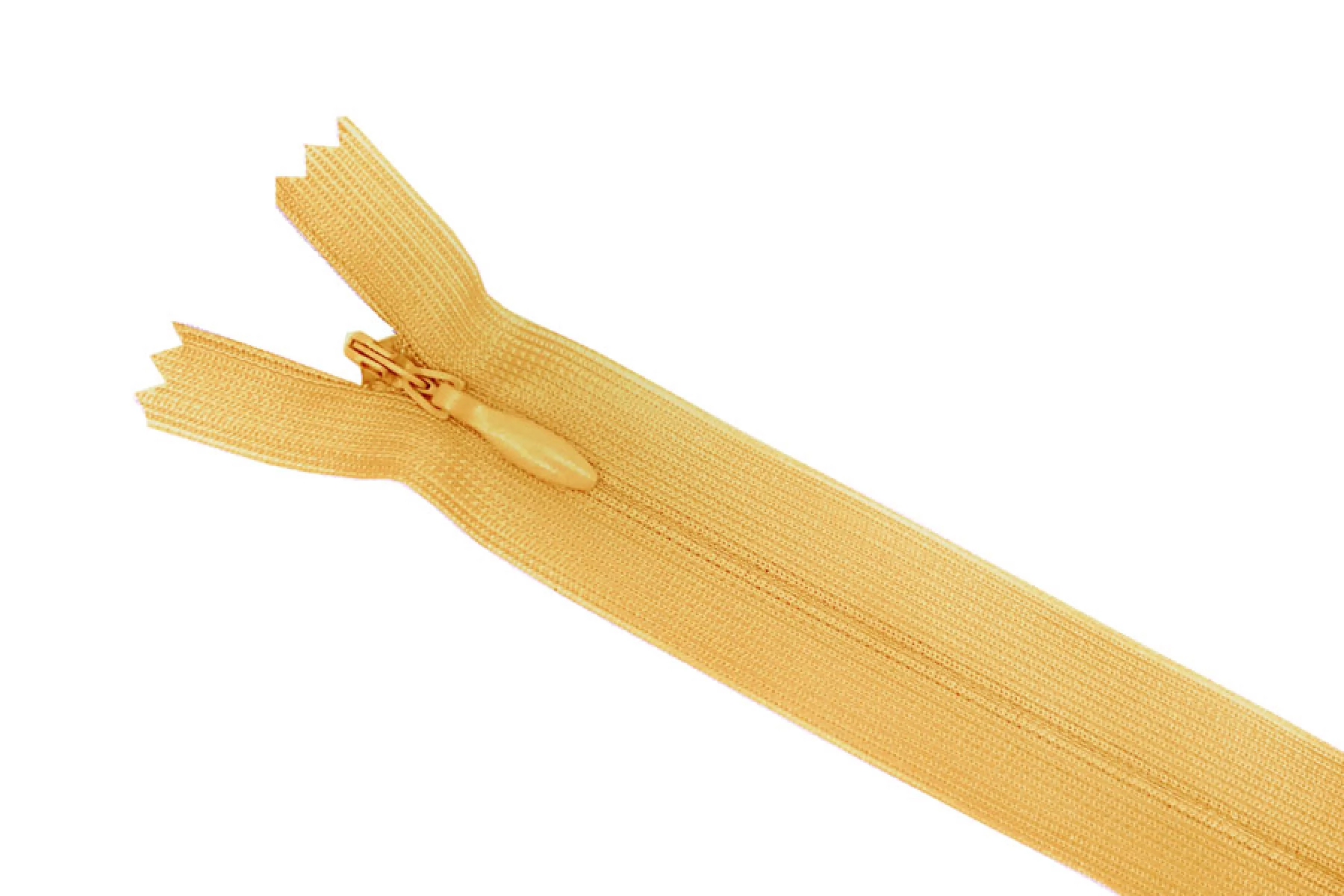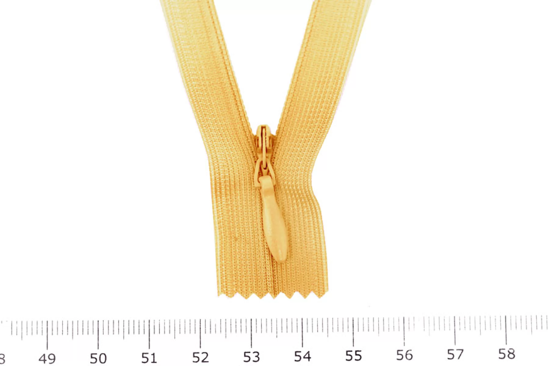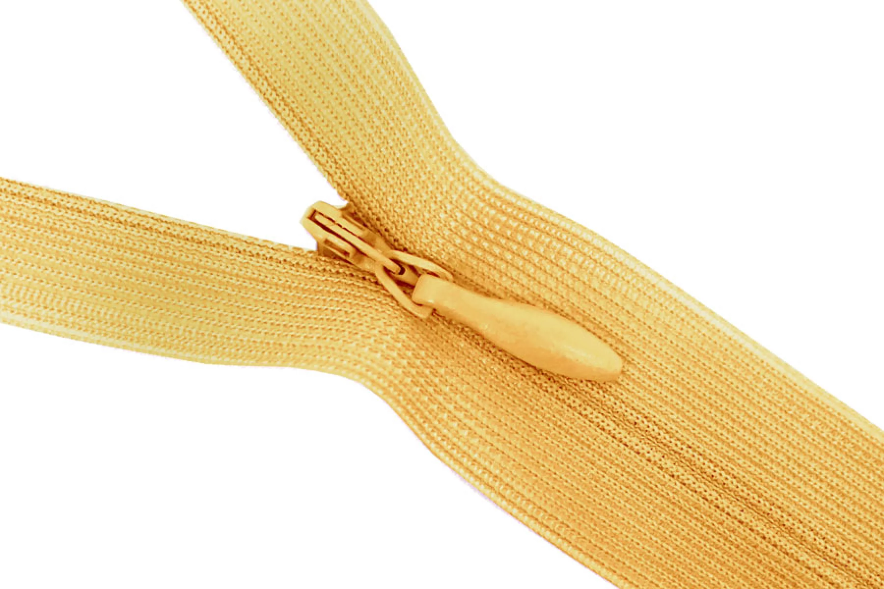 Потайная молния желтого оттенка , длина 20 см. Неразъемная. Зубцы пластиковые, слайдер и пуллер - металл. Ширина молнии 2 см. Ширина зубцов 4 мм.