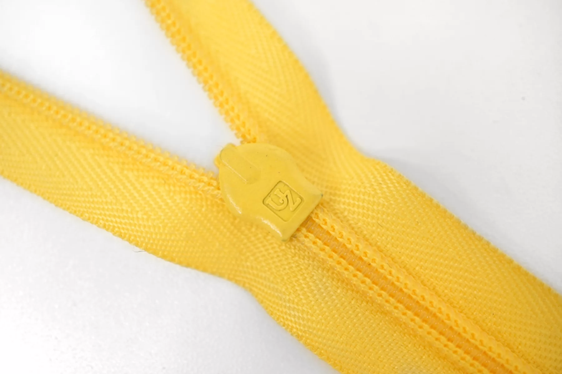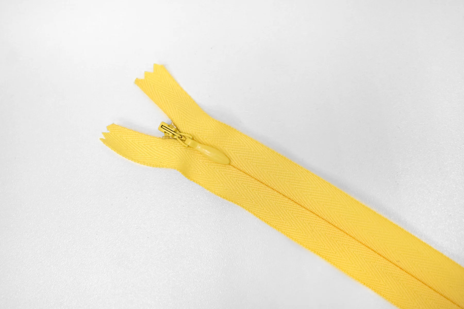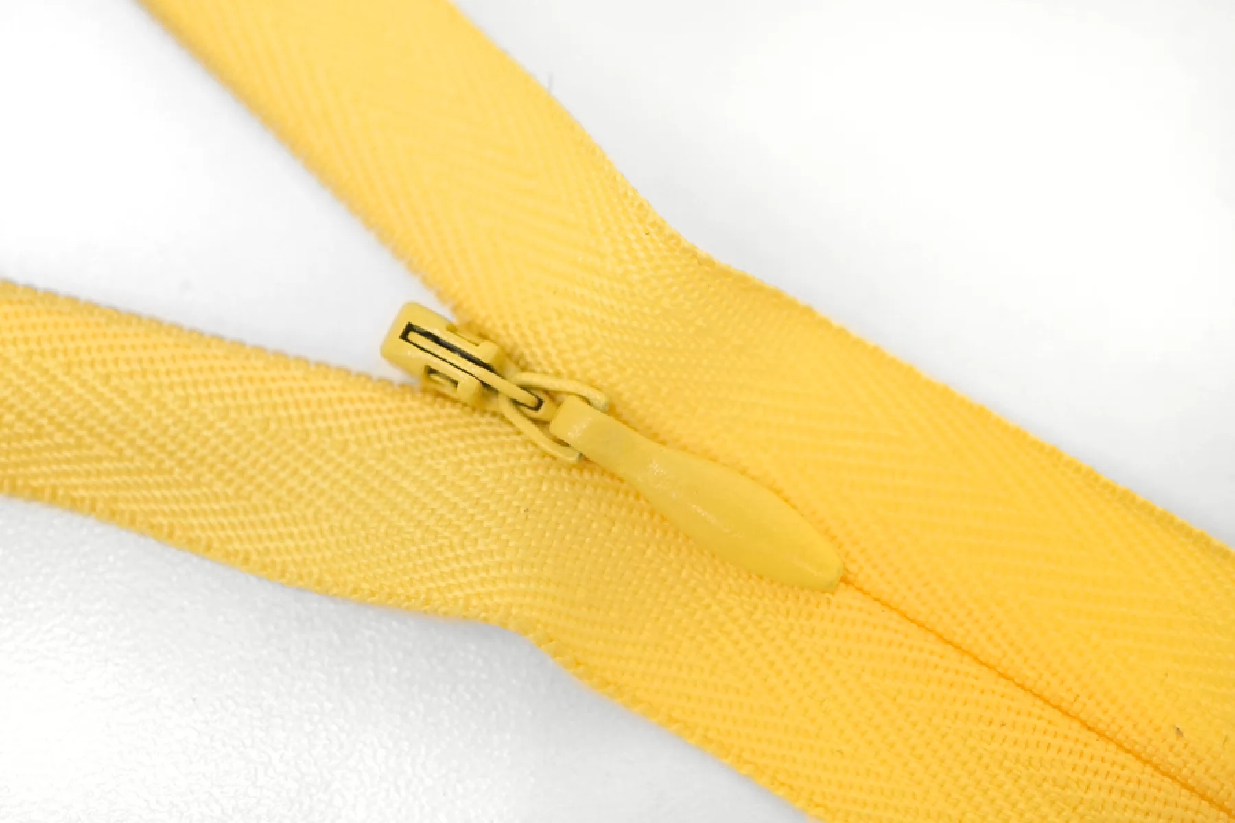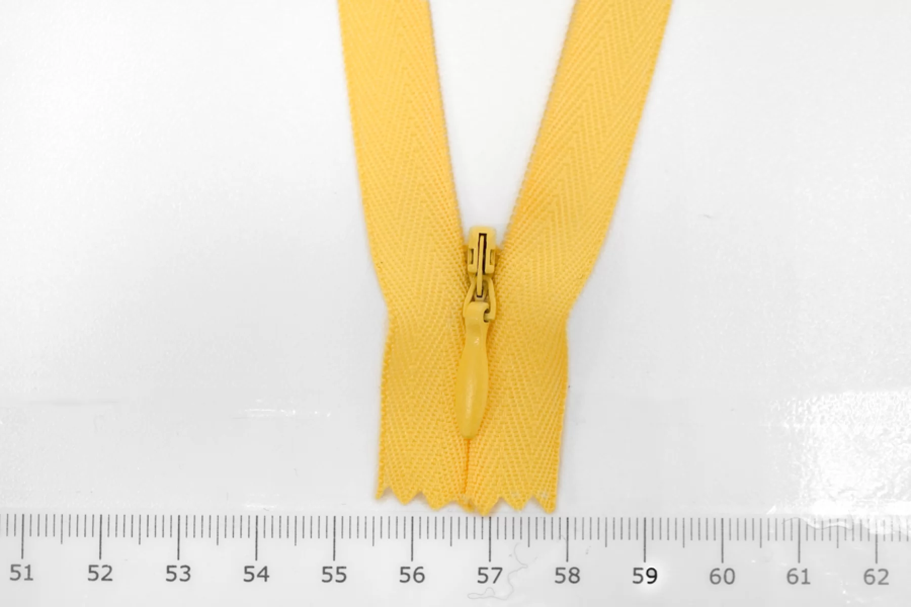 Потайная молния желтого цвета от бренда UZ, длина 50 см. Неразъемная. Зубцы пластиковвые, слайдер и пуллер металл желтого цвета. Ширина молнии 2,3 см. Ширина зубцов 5 мм.