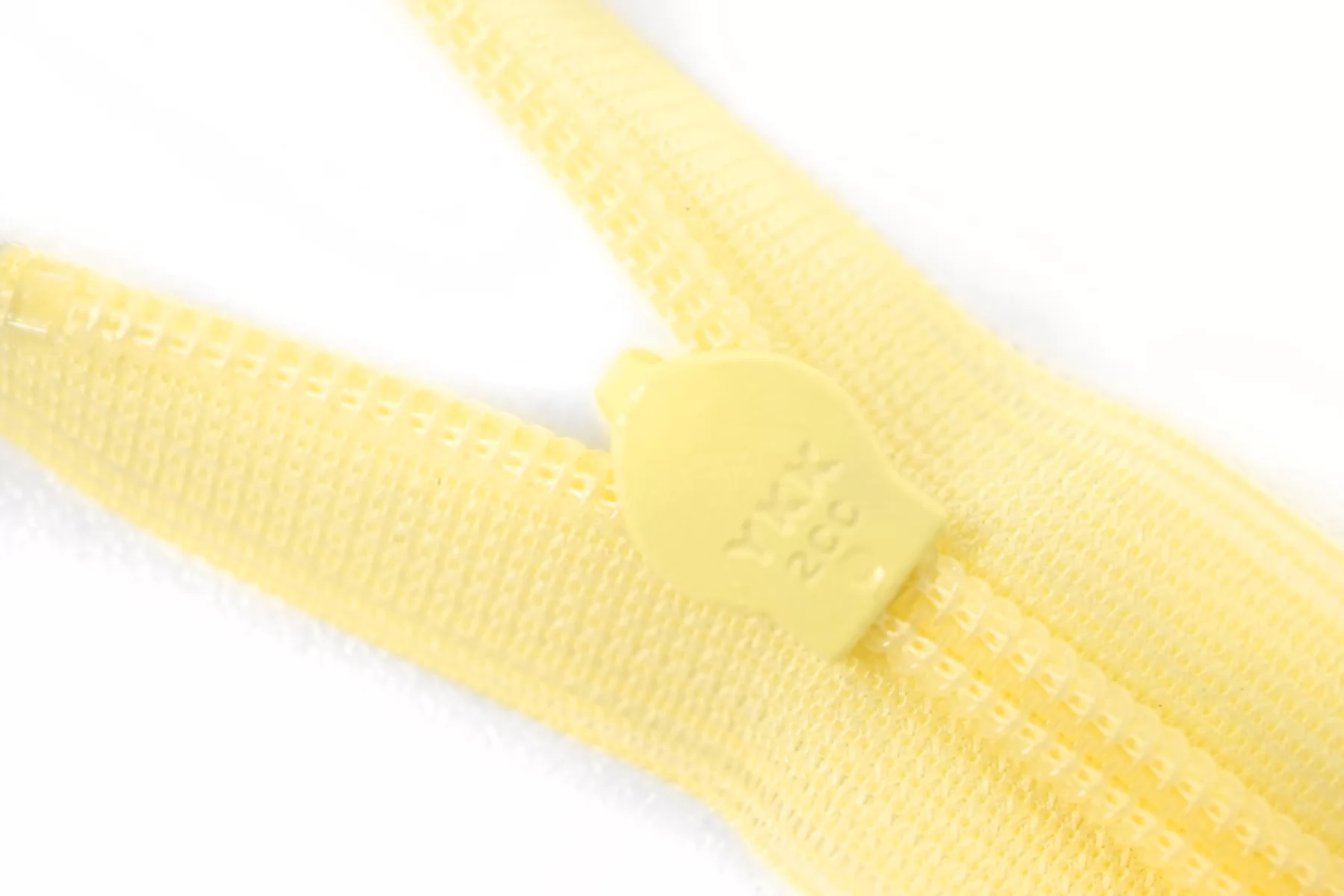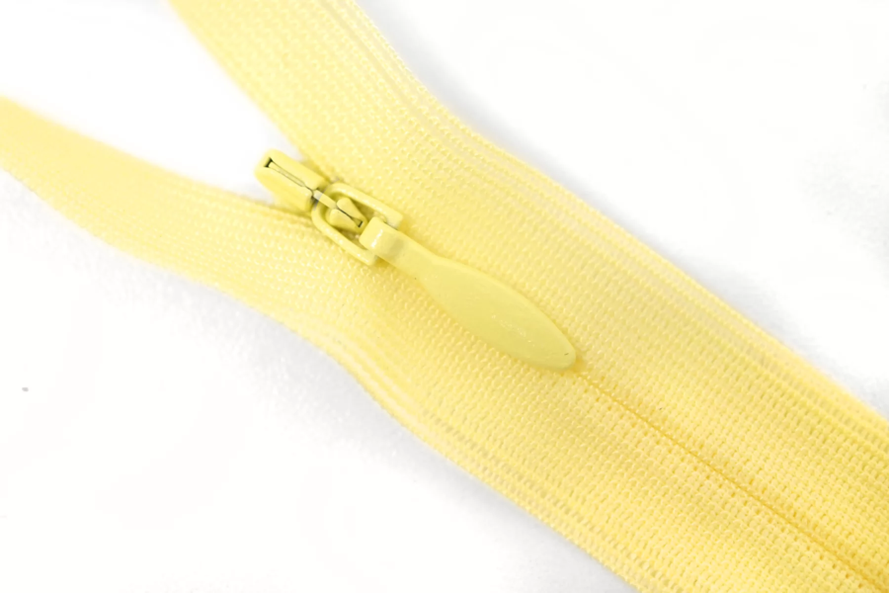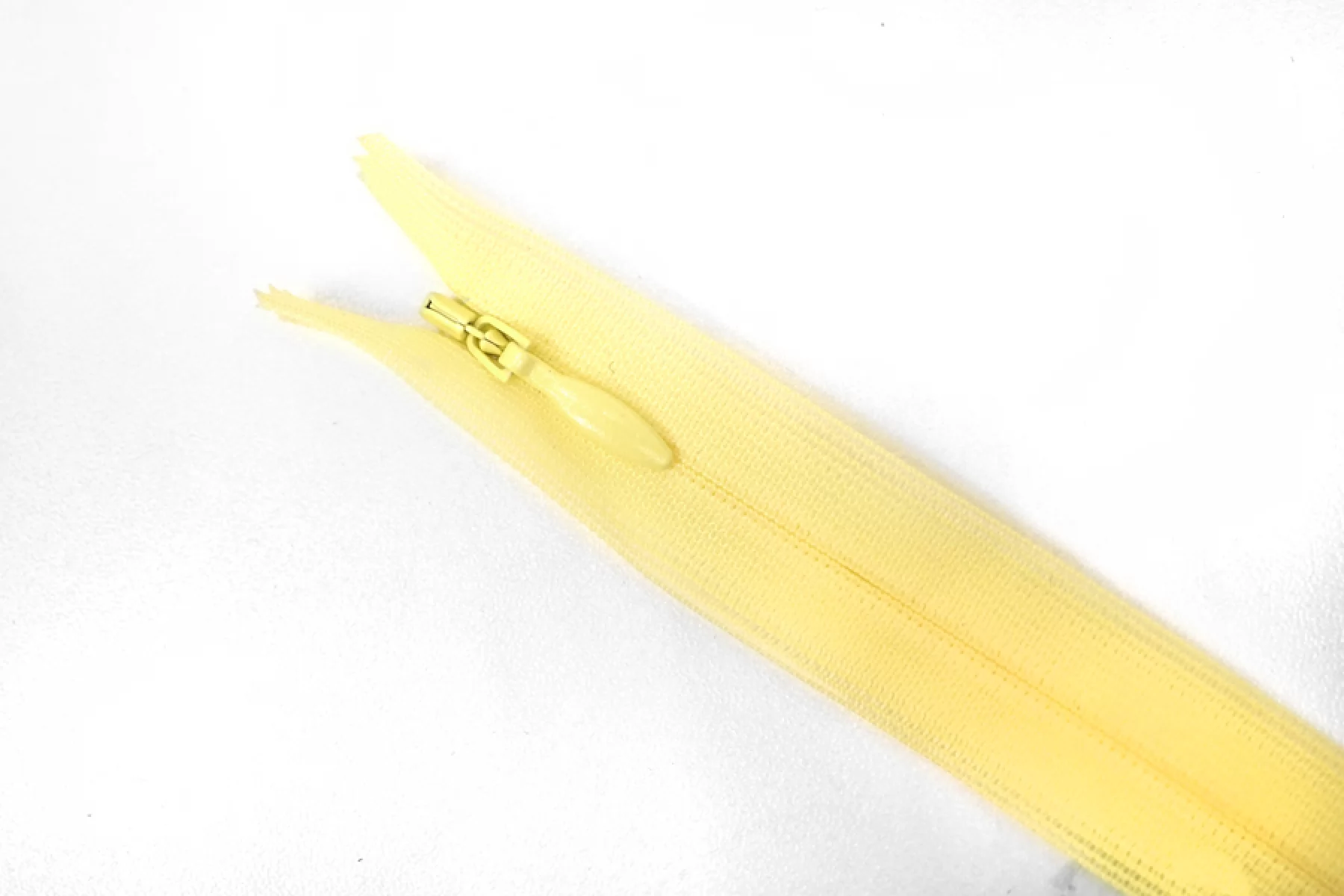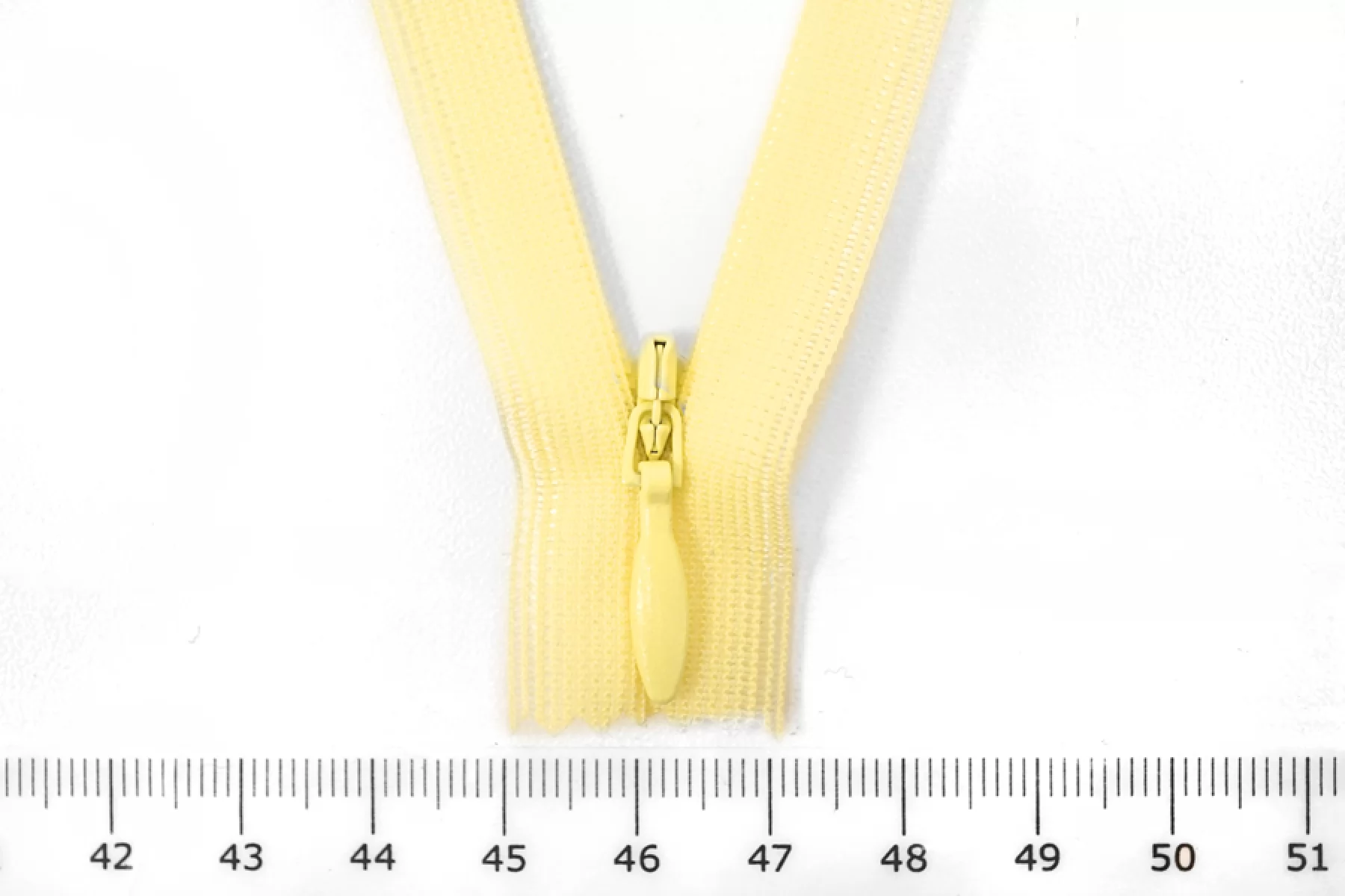Потайная молния желтого оттенка от бренда YKK , длина 50 см. Неразъемная. Зубцы пластиковые, слайдер и пуллер - металл. Ширина молнии 2 см. Ширина зубцов 4 мм.