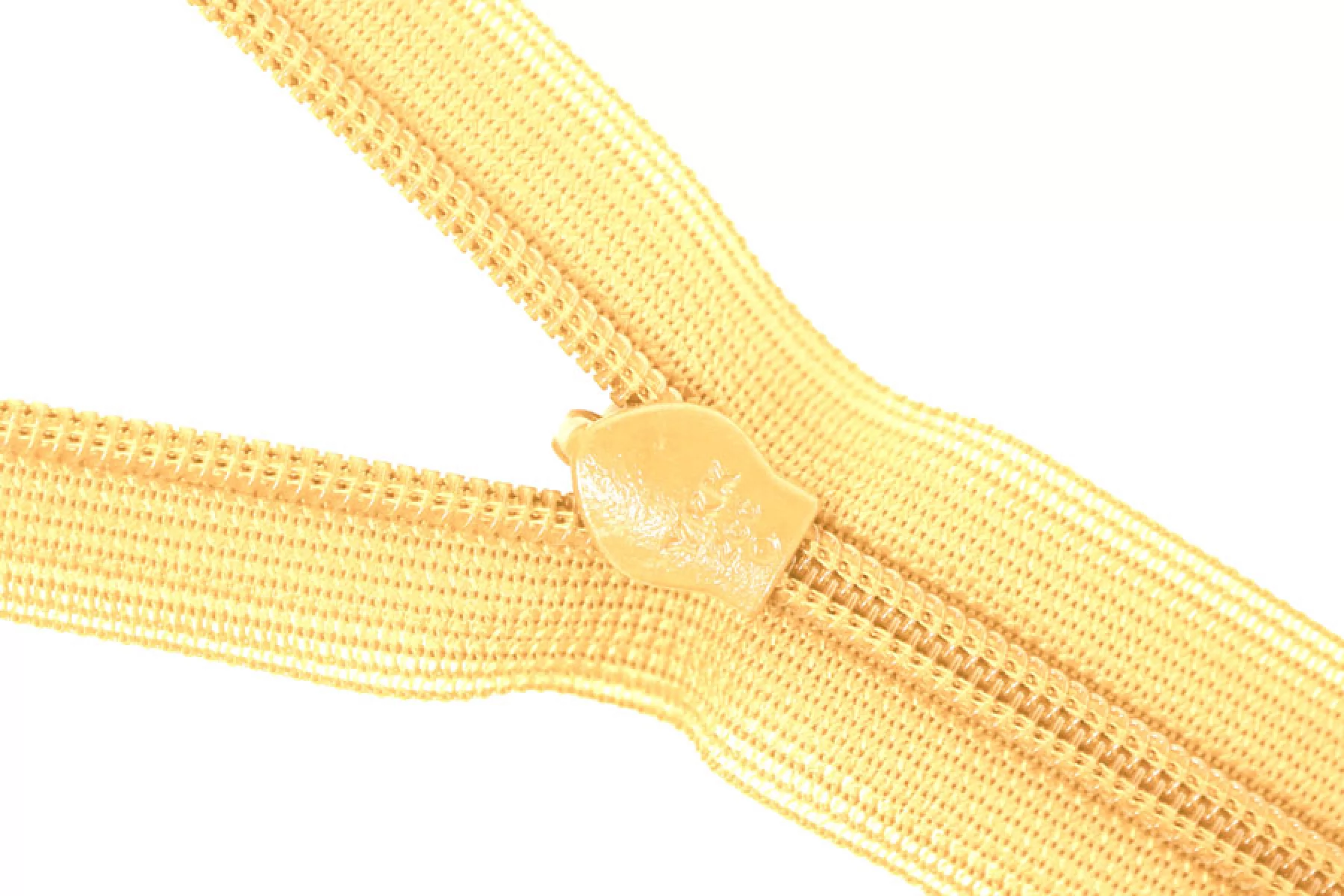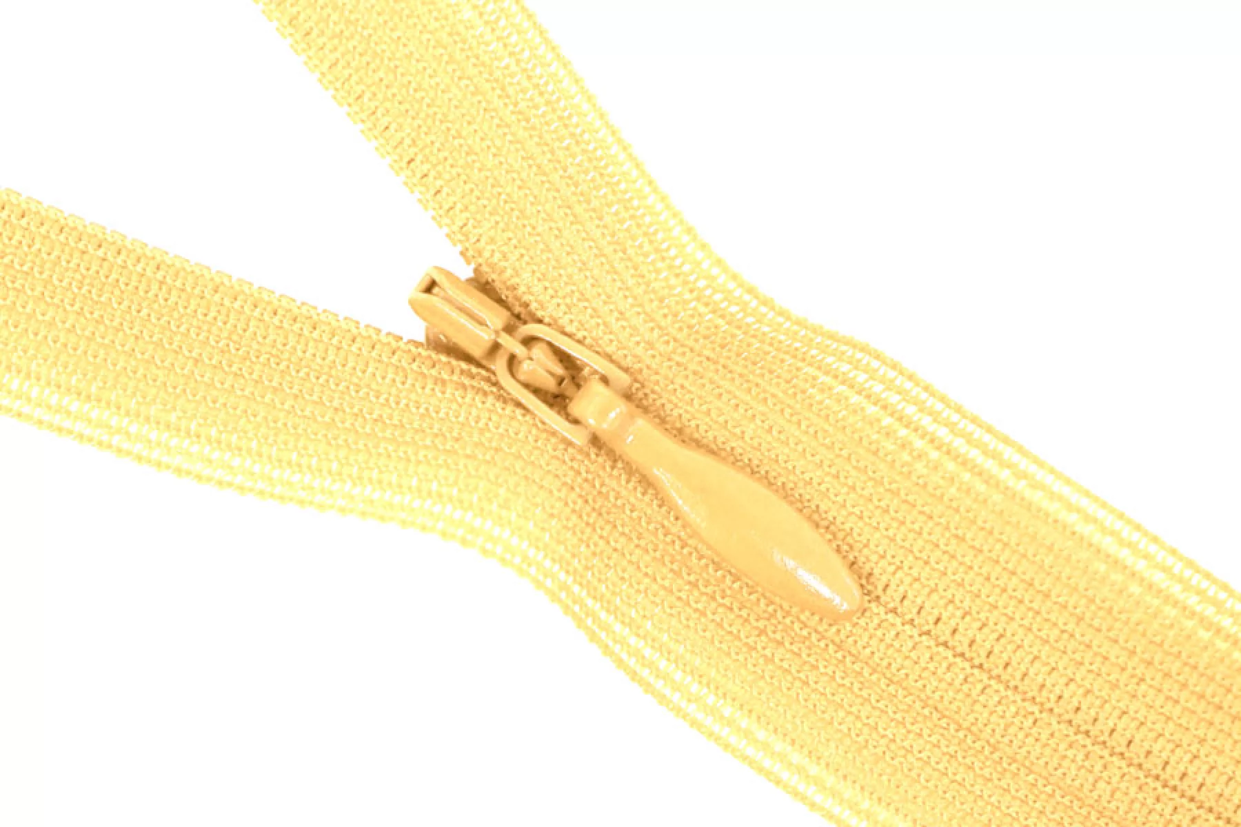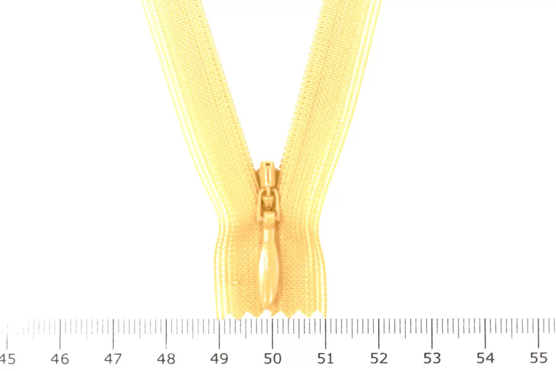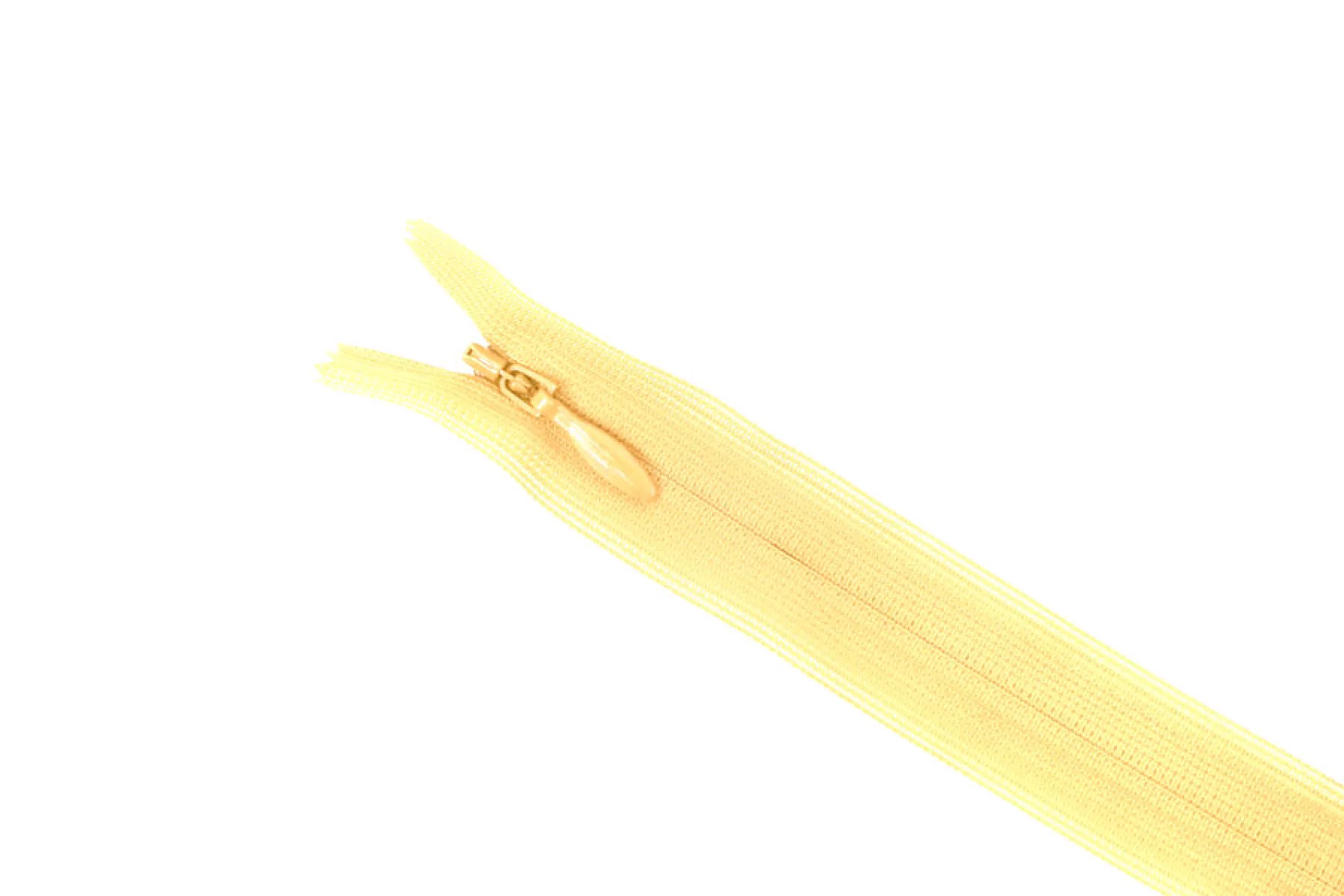 Потайная молния желтого оттенка от бренда YKK , длина 65 см. Неразъемная. Зубцы пластиковые, слайдер и пуллер - металл. Ширина молнии 2 см. Ширина зубцов 4 мм.