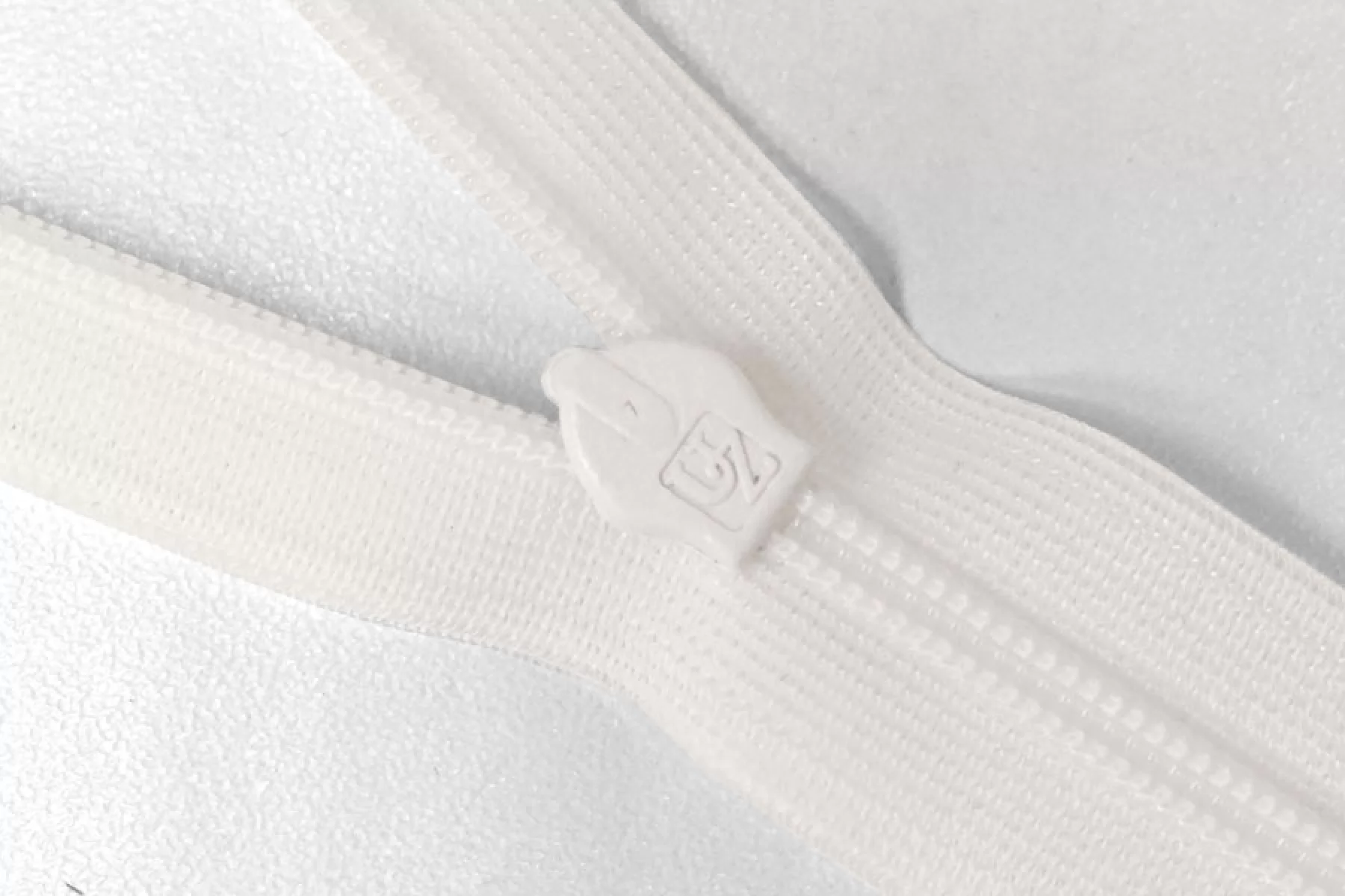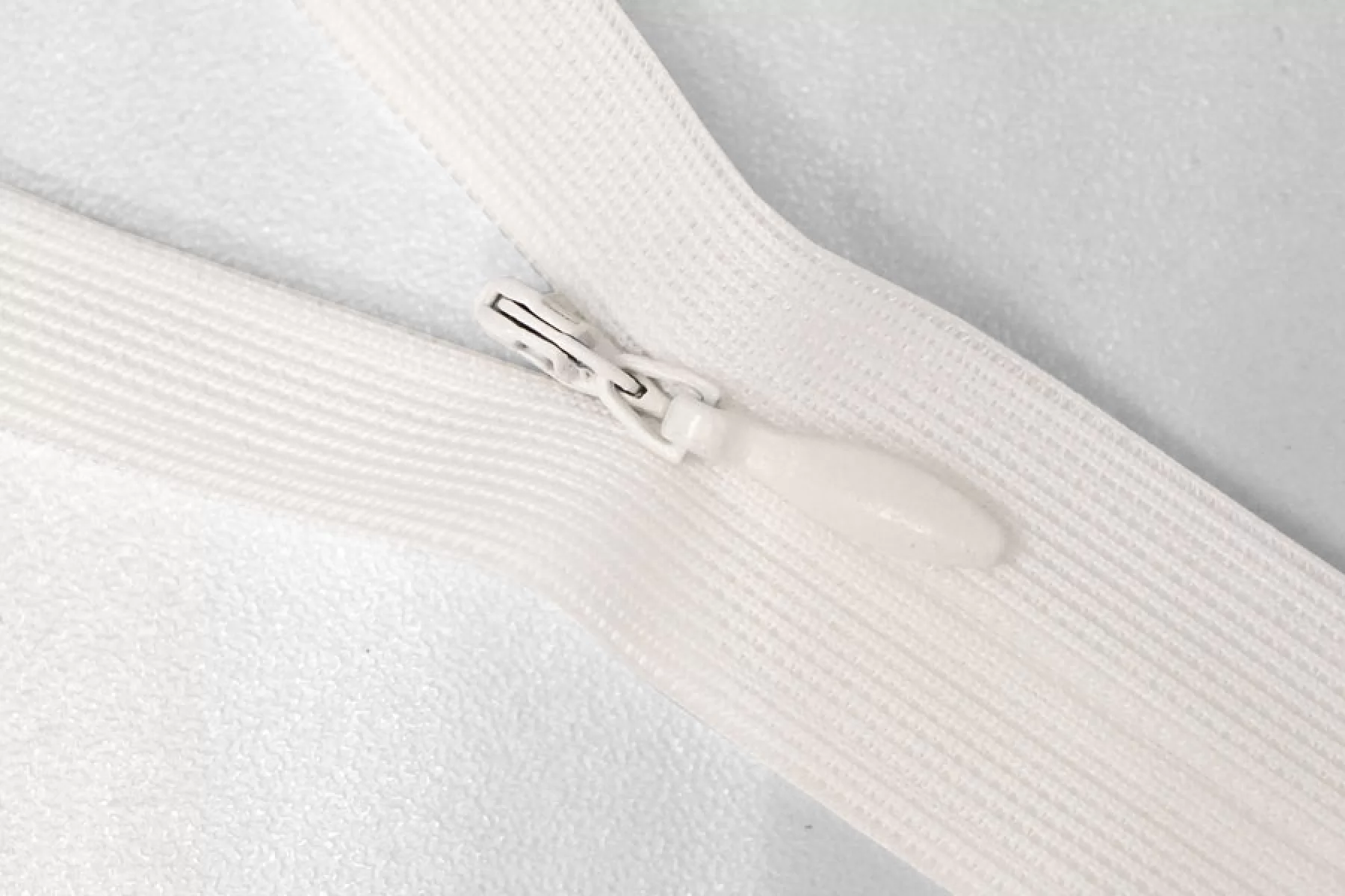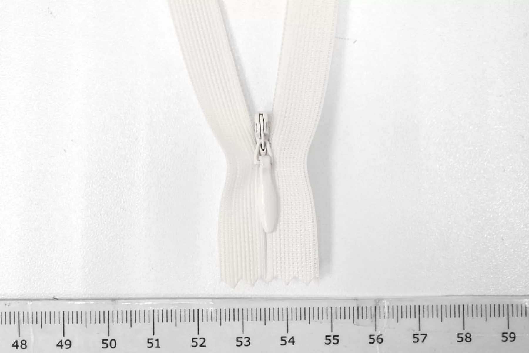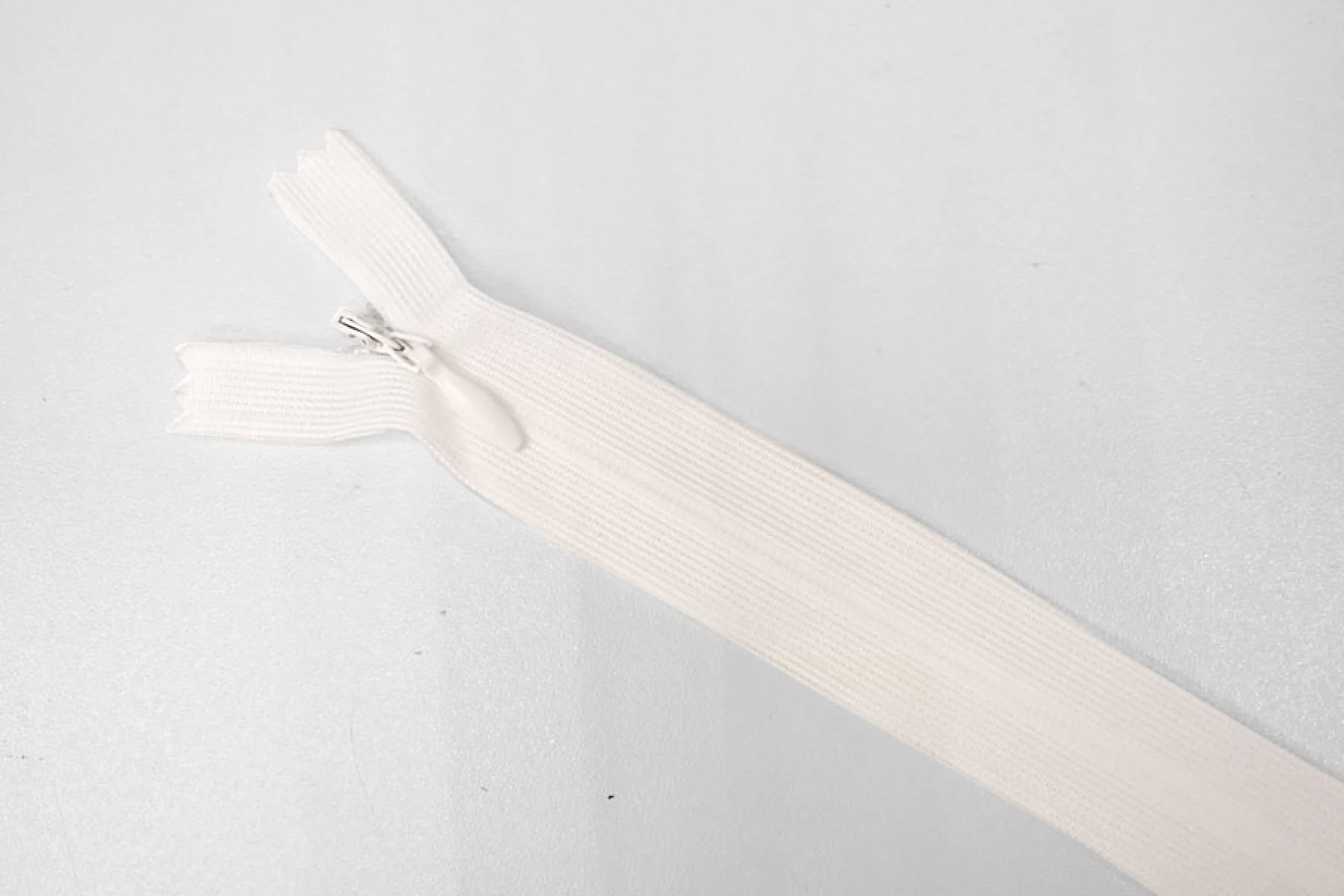 Потайная молния белого цвета, длина 25 см. Неразъемная. Зубцы пластиковые, слайдер и пуллер - металл.