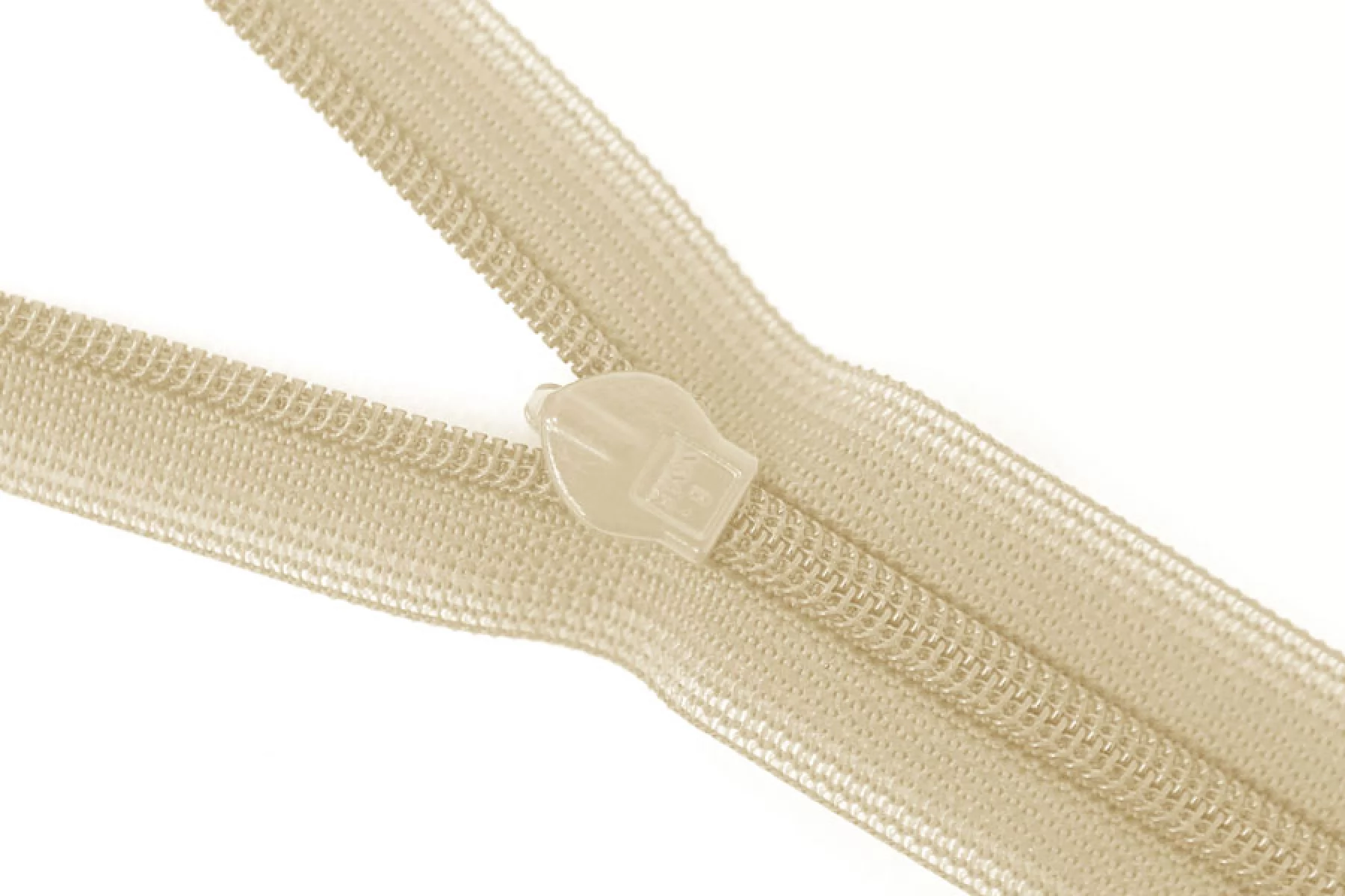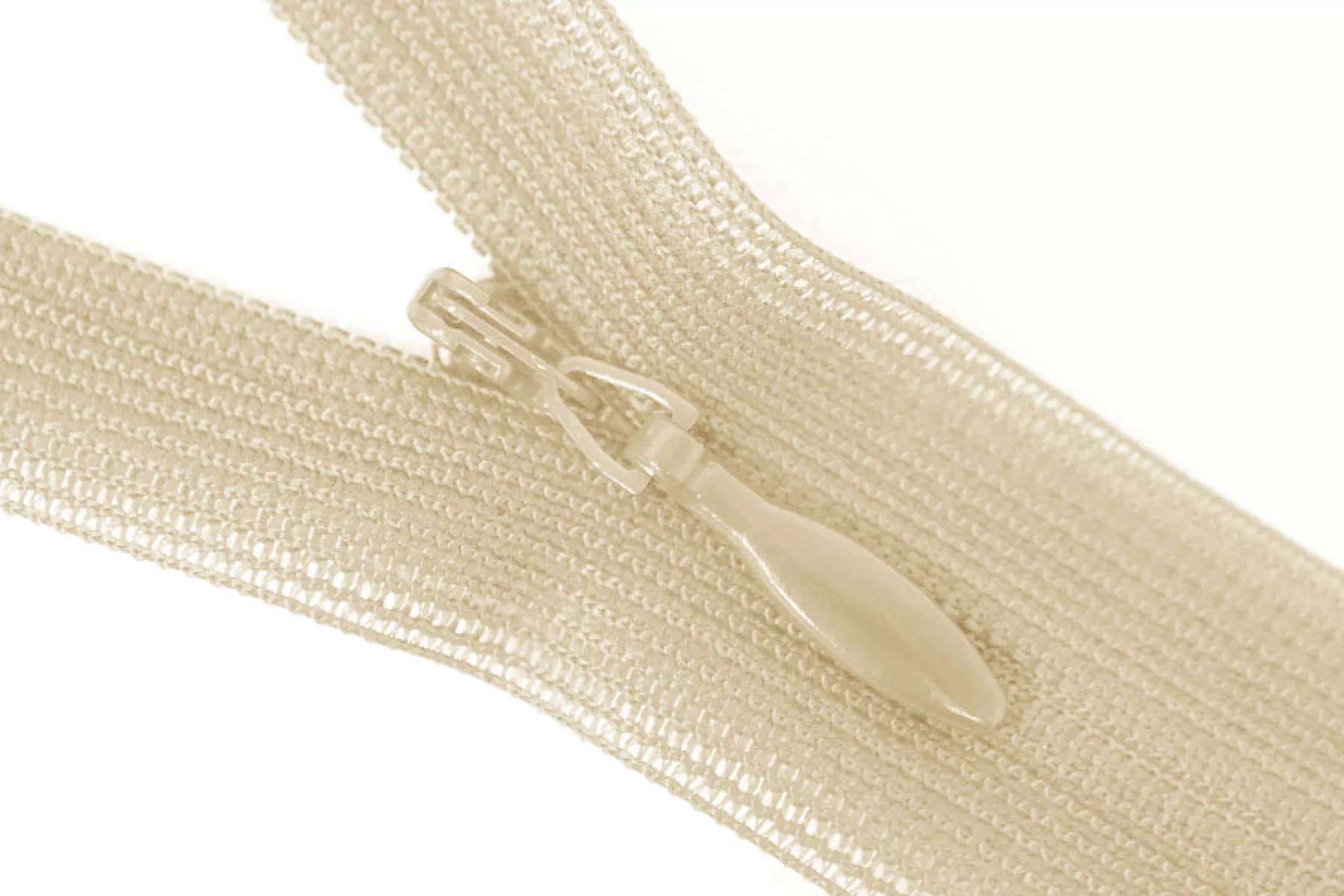 Потайная молния бежевого цвета, длина 17 см. Неразъемная. Зубцы пластиковые, слайдер и пуллер - металл.