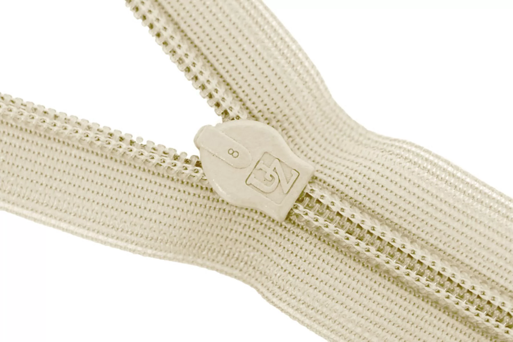 Потайная молния бежевого цвета, длина 17 см. Неразъемная. Зубцы пластиковые, слайдер и пуллер - металл.