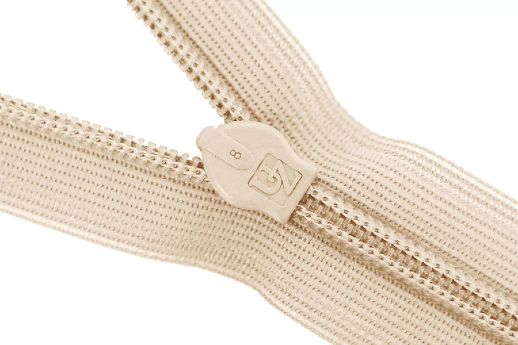 Потайная молния бежевого цвета, длина 19 см. Неразъемная. Зубцы пластиковые, слайдер и пуллер - металл.