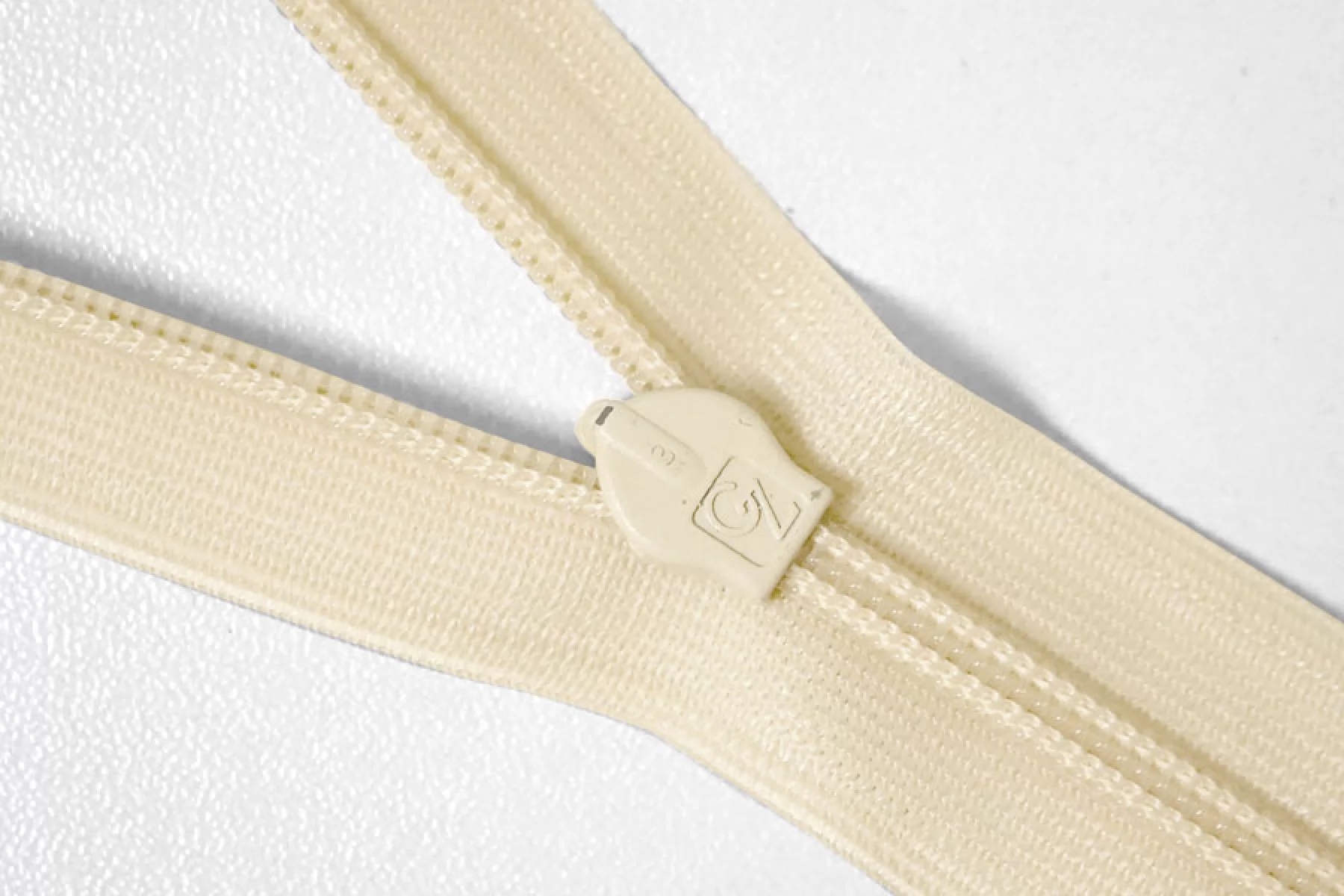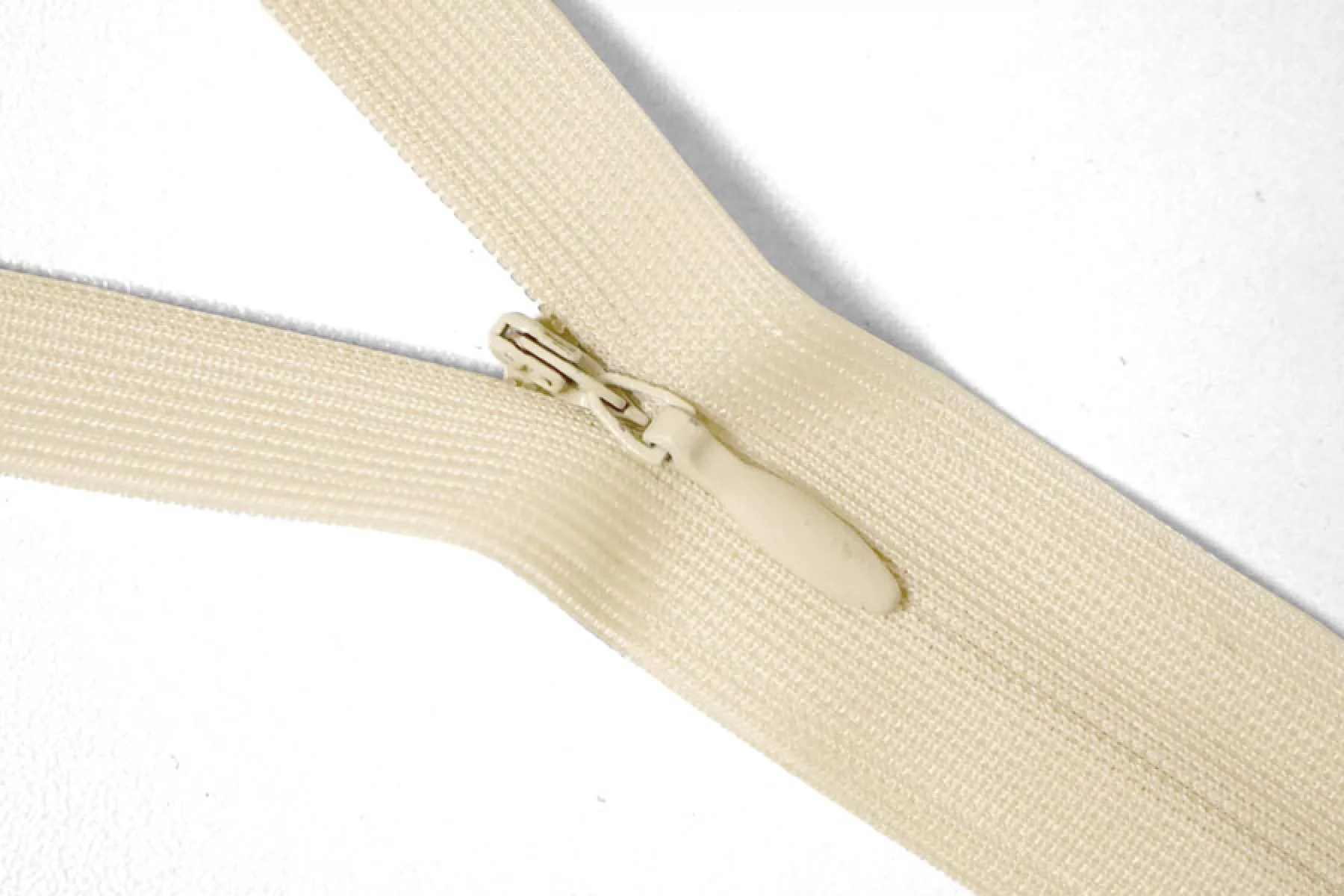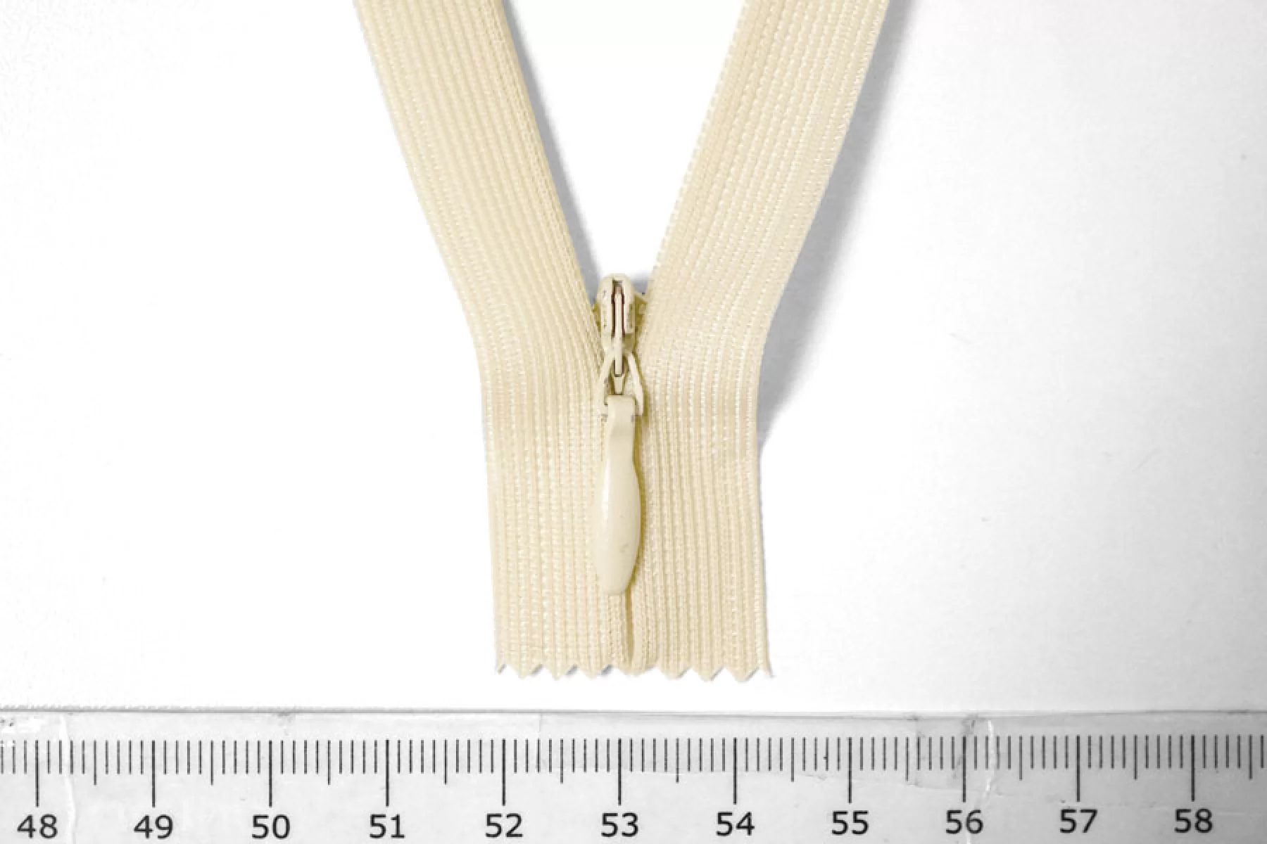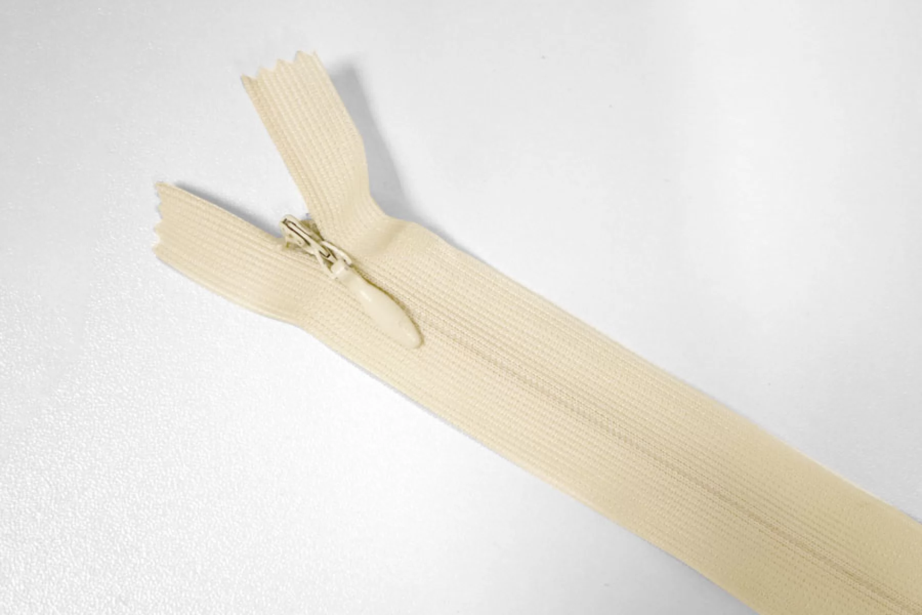 Потайная молния бежевого цвета, длина 21 см. Неразъемная. Зубцы пластиковые, слайдер и пуллер - металл.