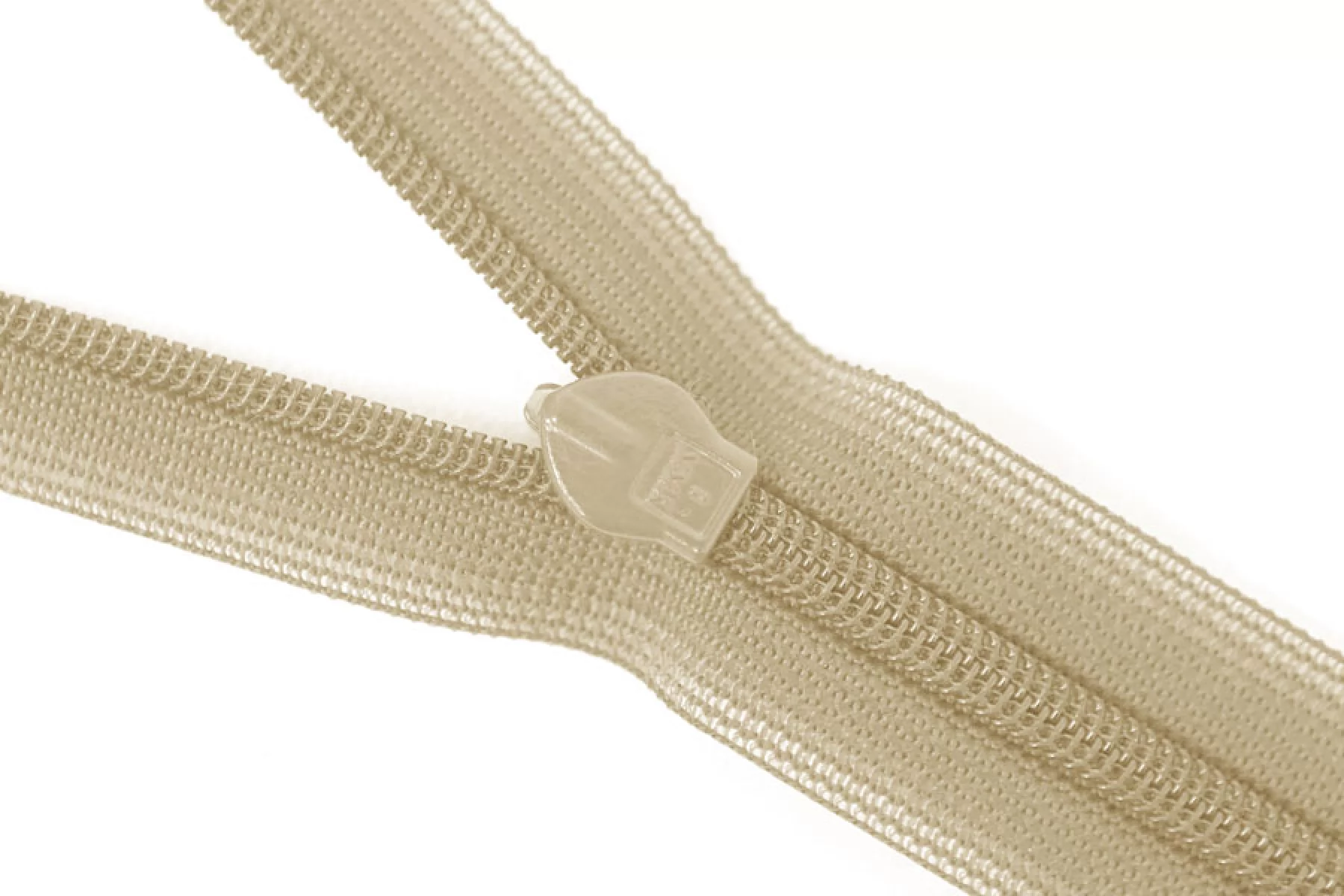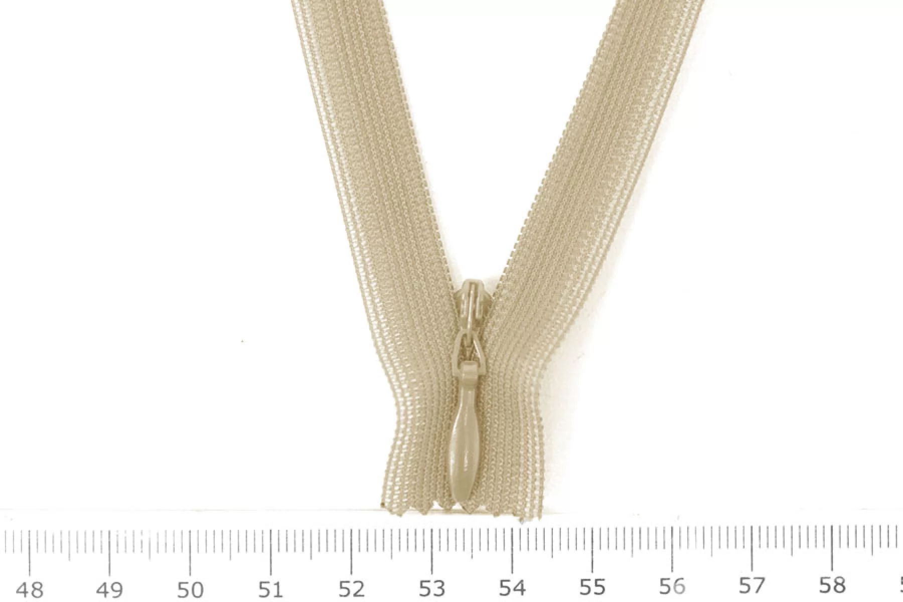 Потайная молния бежевого цвета, длина 28 см. Неразъемная. Зубцы пластиковые, слайдер и пуллер - металл.