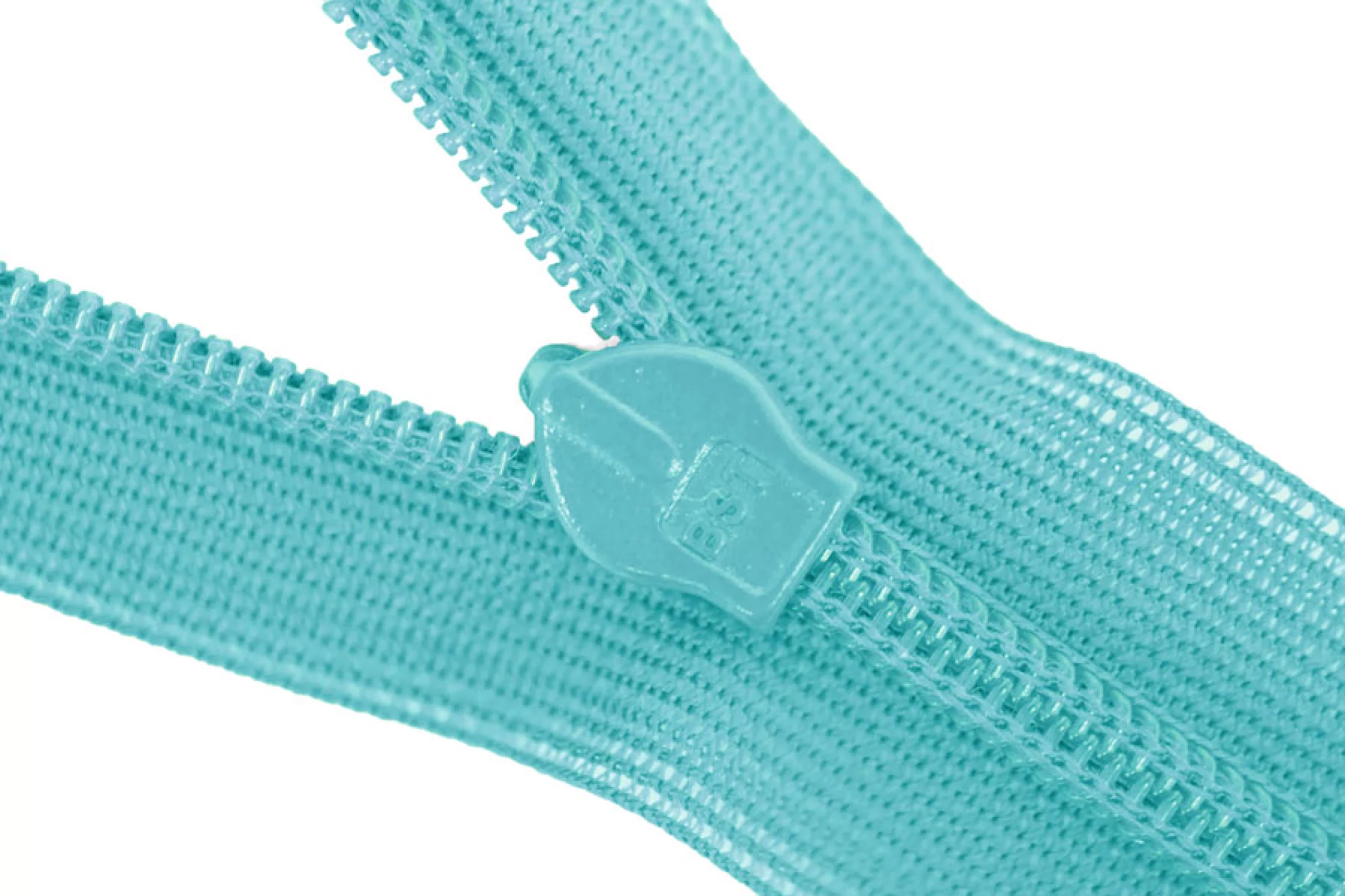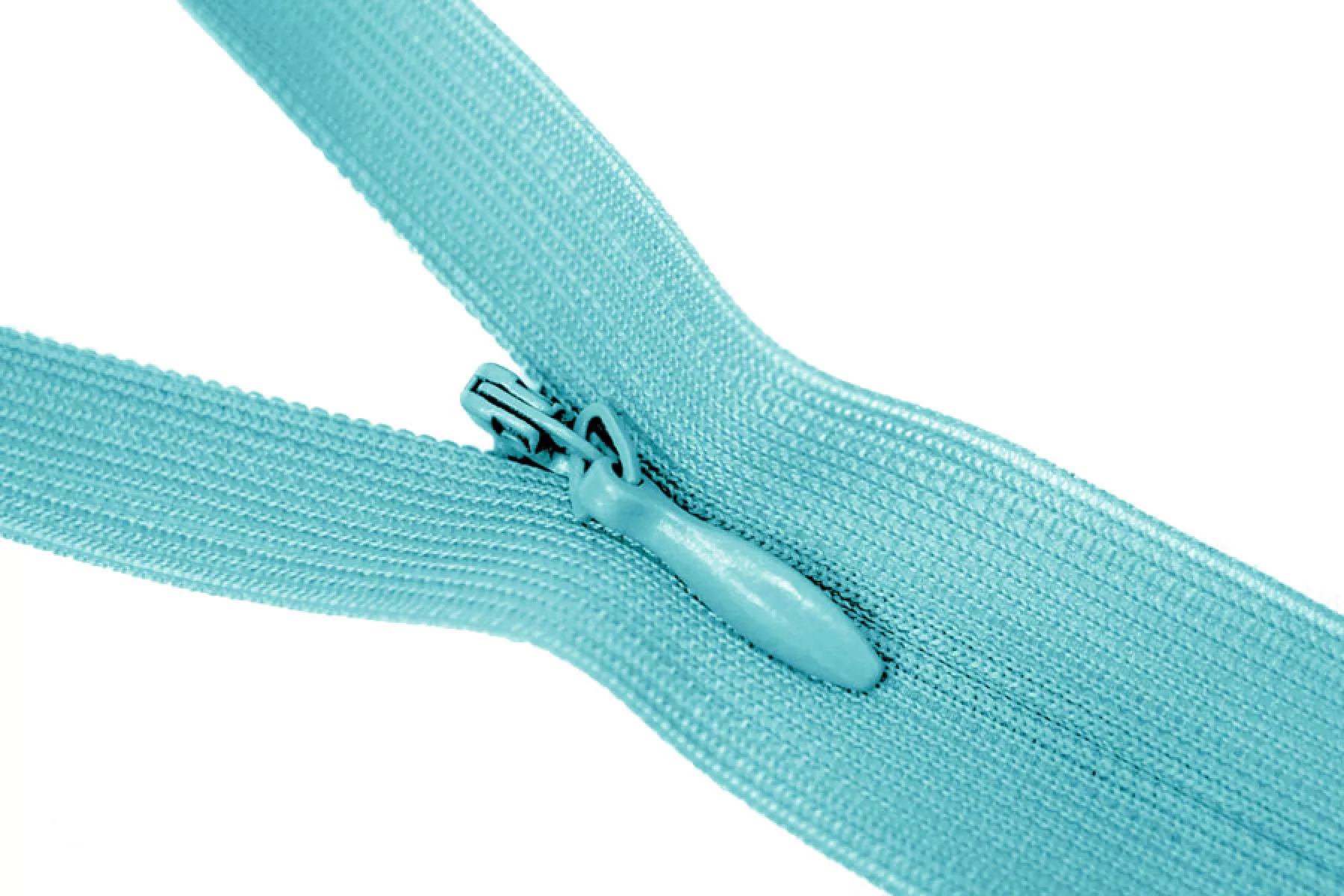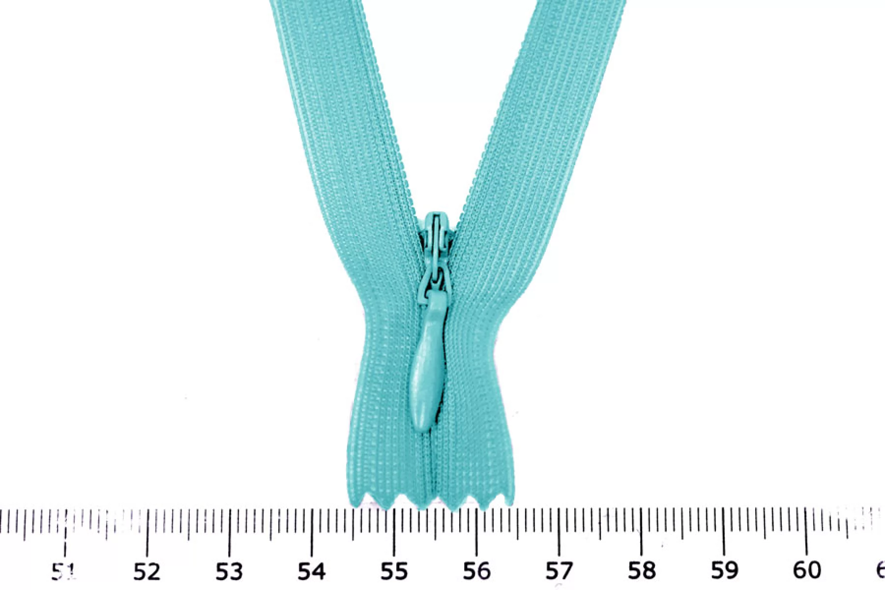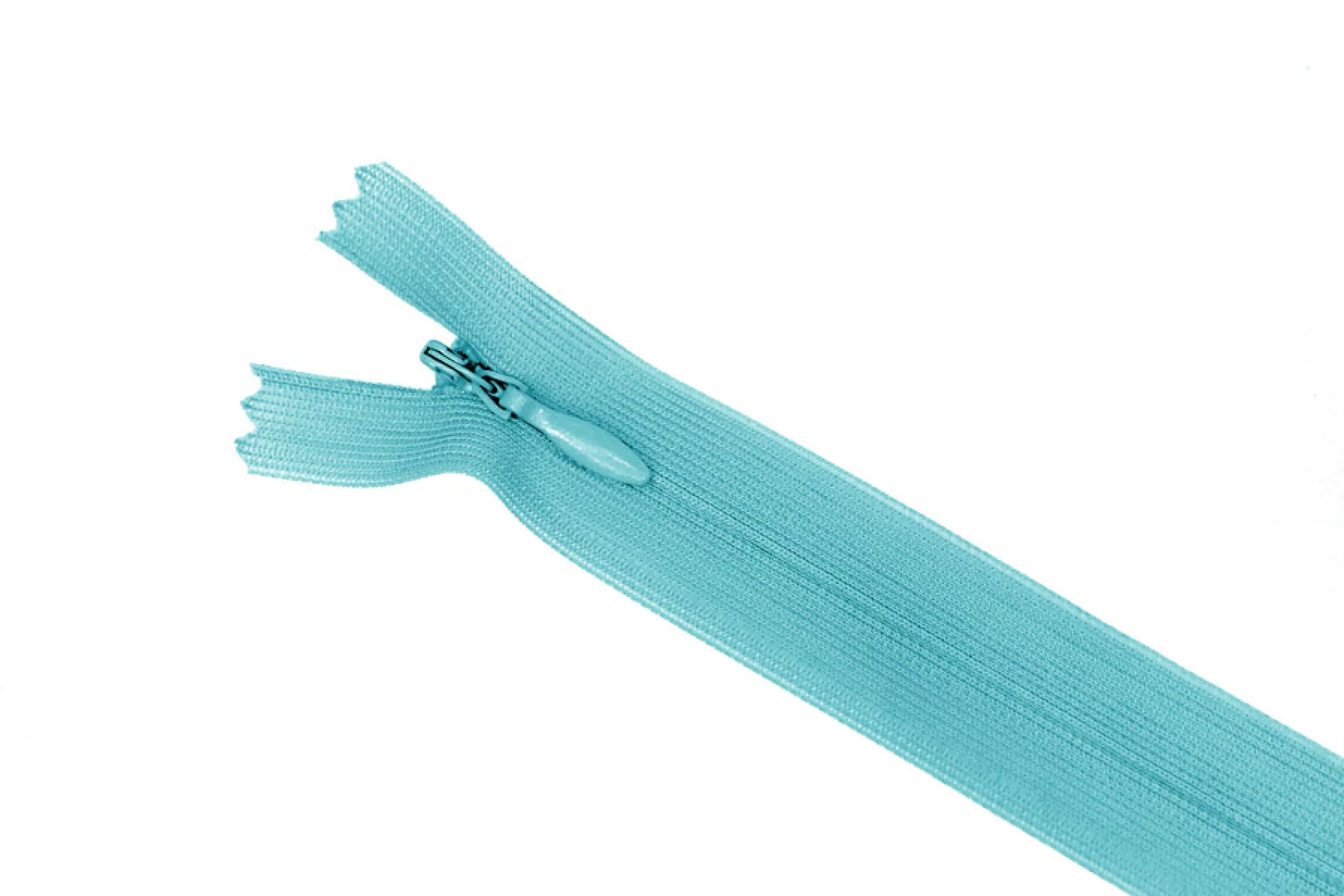 Потайная молния бирюзового цвета, длина 20 см. Неразъемная. Зубцы пластиковые, слайдер и пуллер - металл.