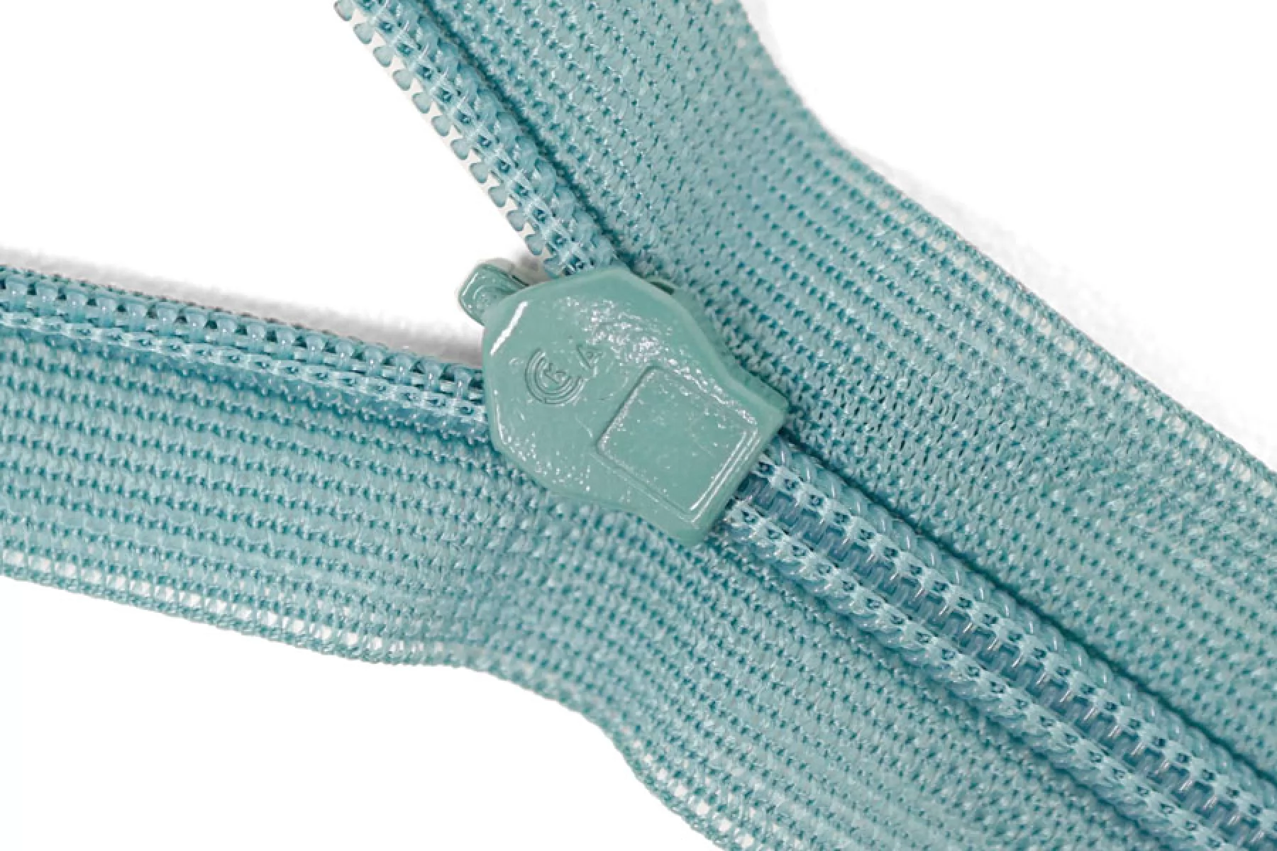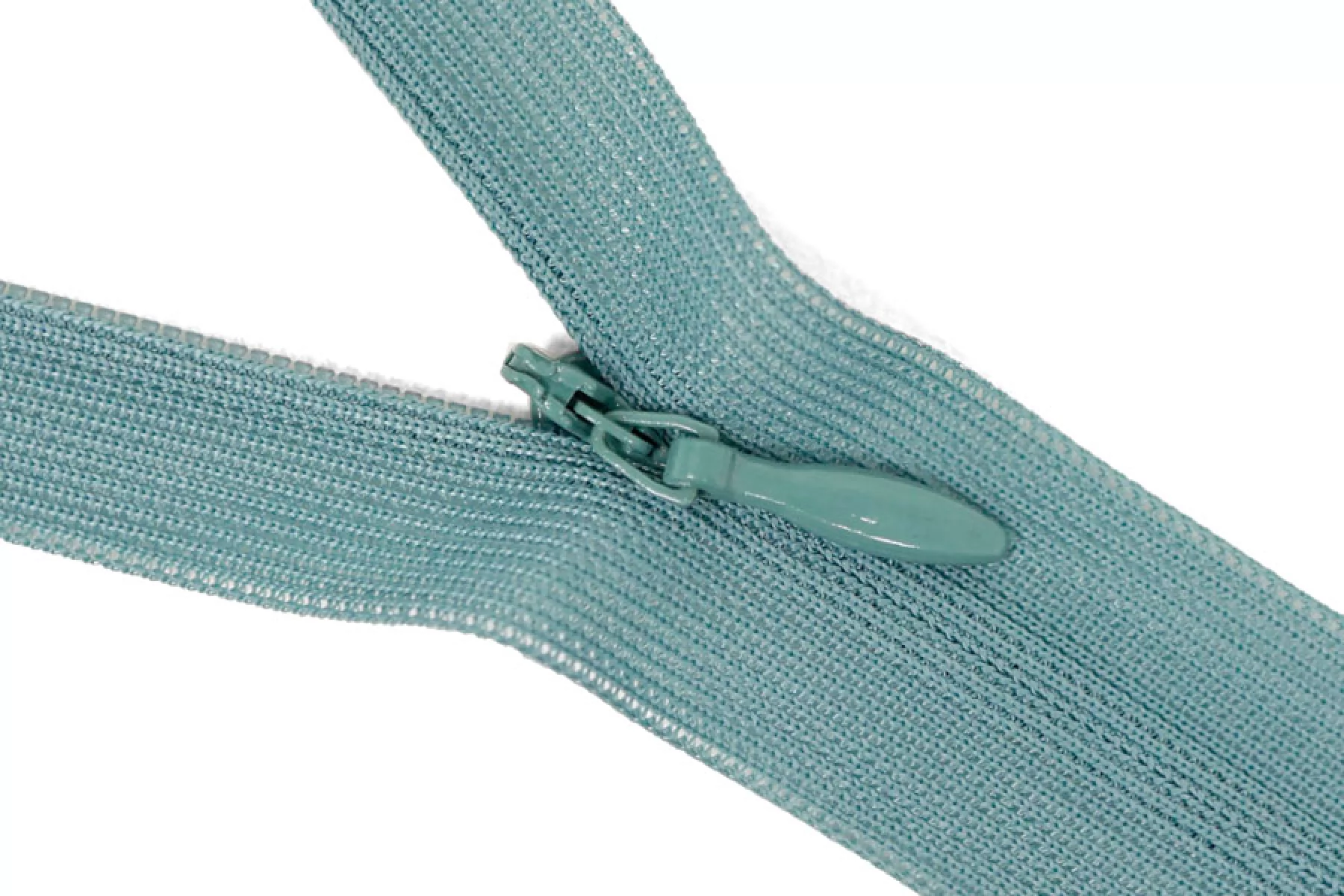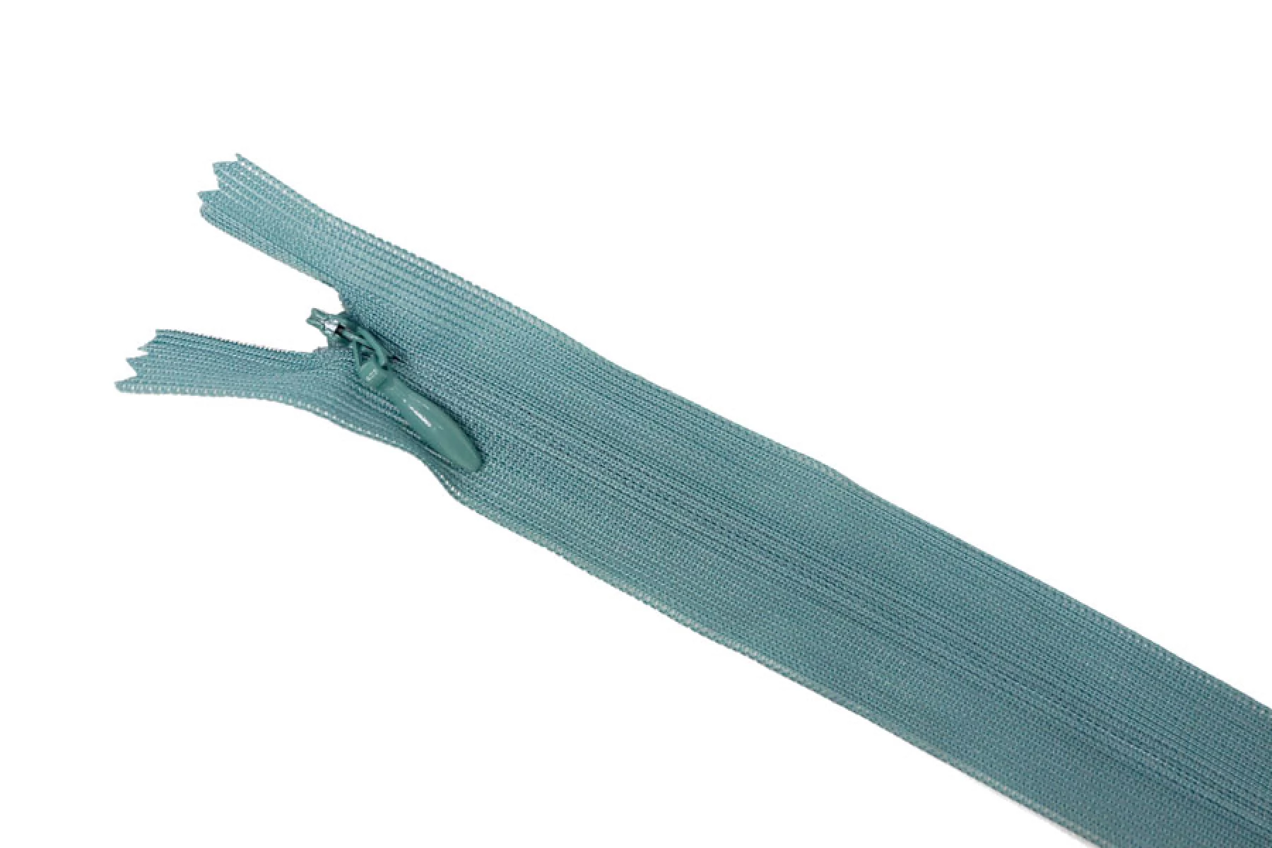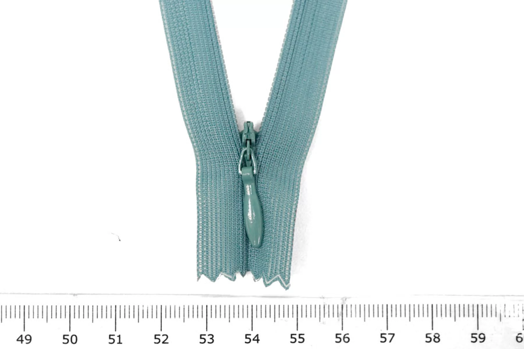 Потайная молния бирюзового цвета, длина 61 см. Неразъемная. Зубцы пластиковые, слайдер и пуллер - металл.