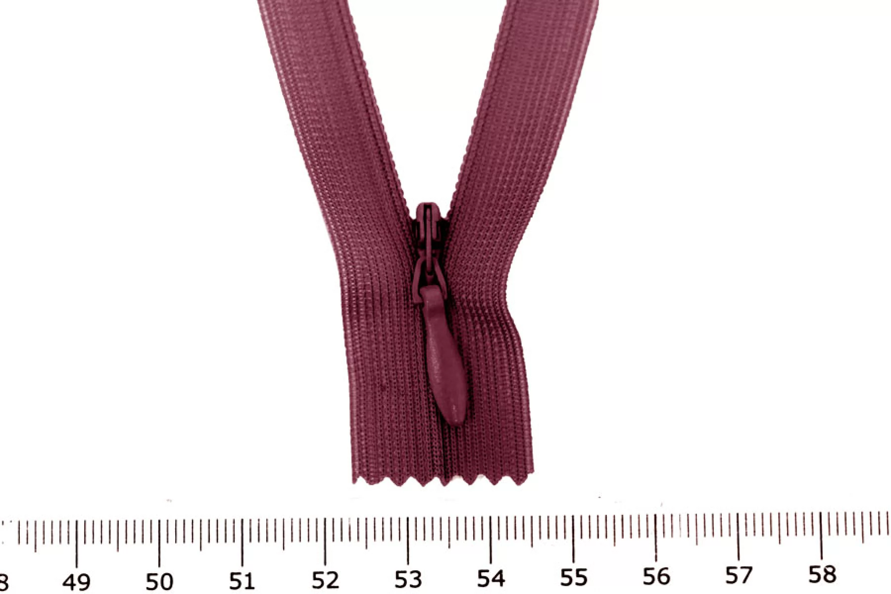Потайная молния бордового цвета, длина 16 см. Неразъемная. Зубцы пластиковые, слайдер и пуллер - металл. Ширина молнии 2 см. Ширина зубцов 4 мм.