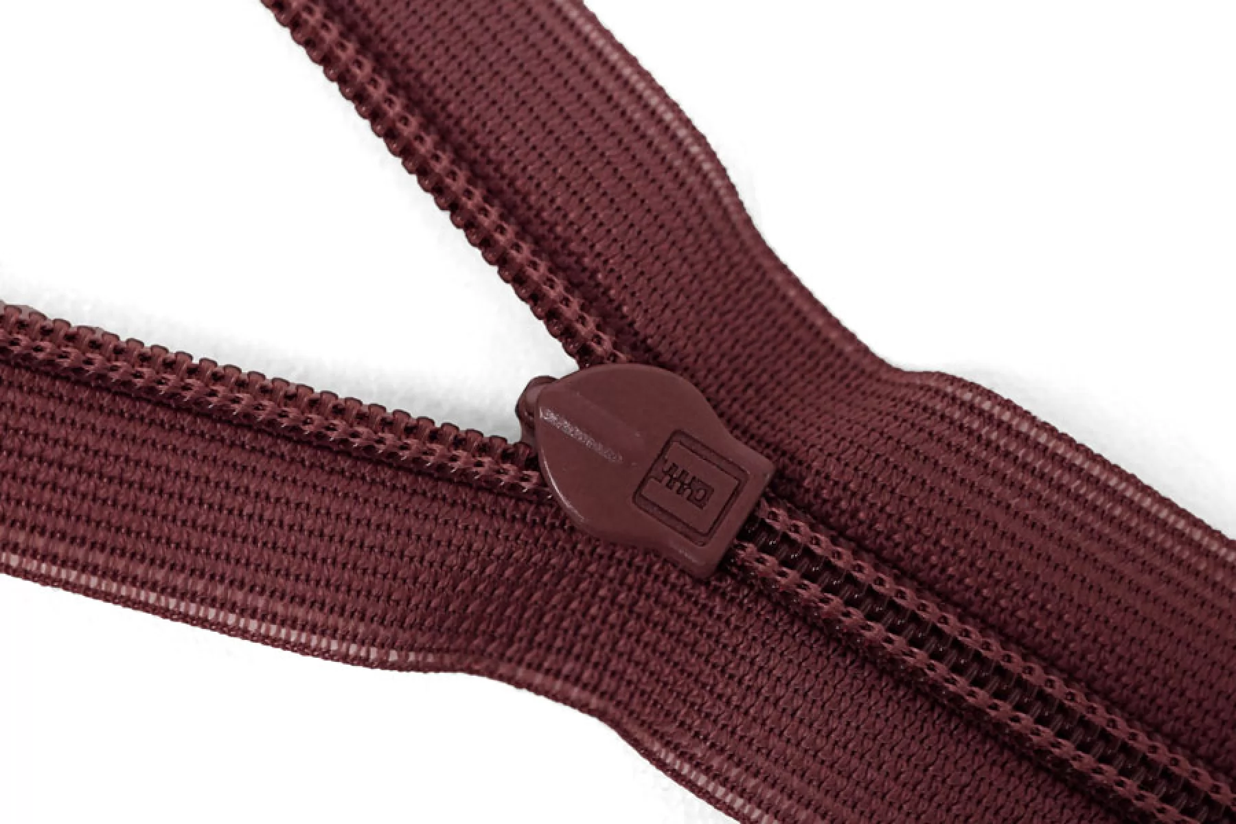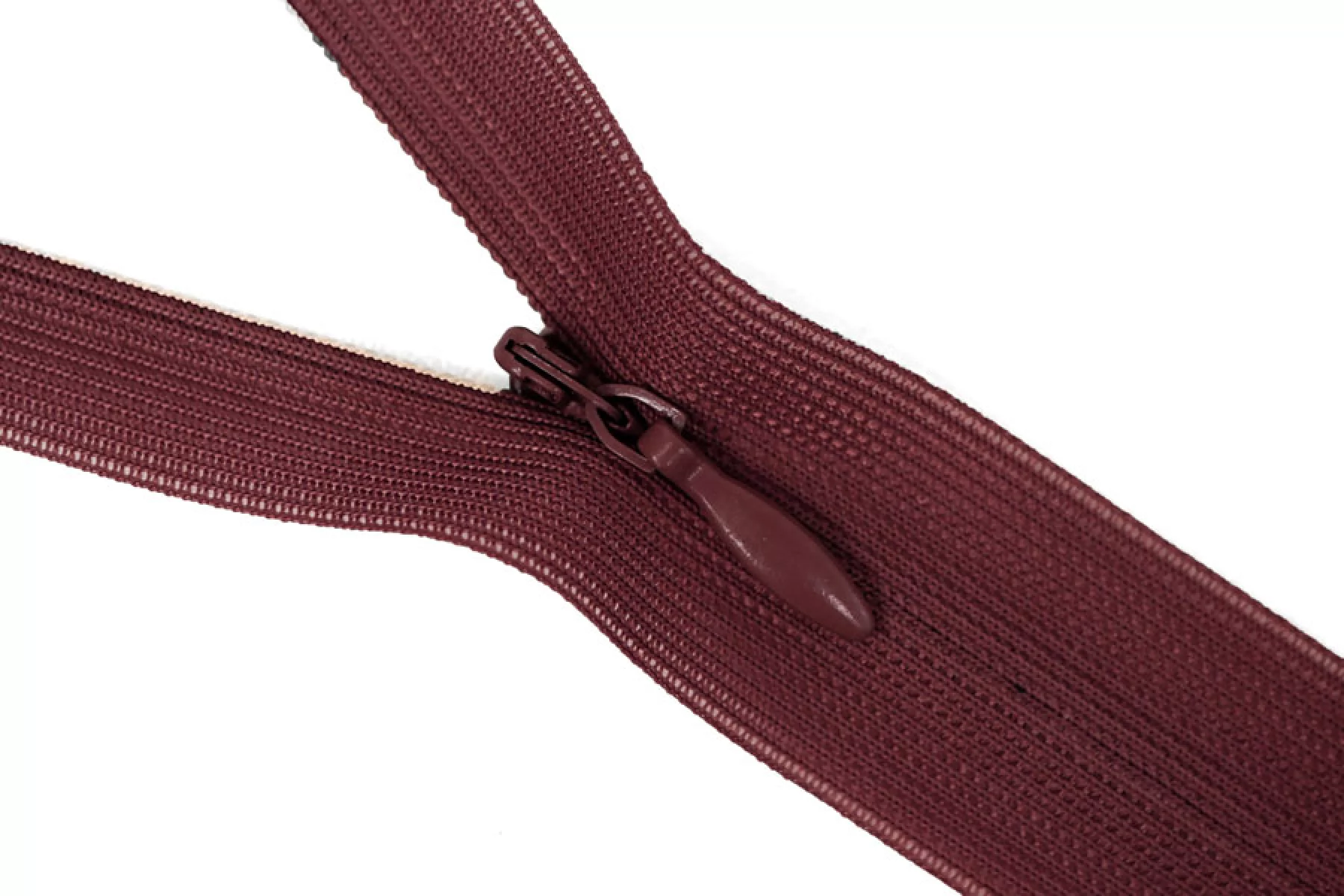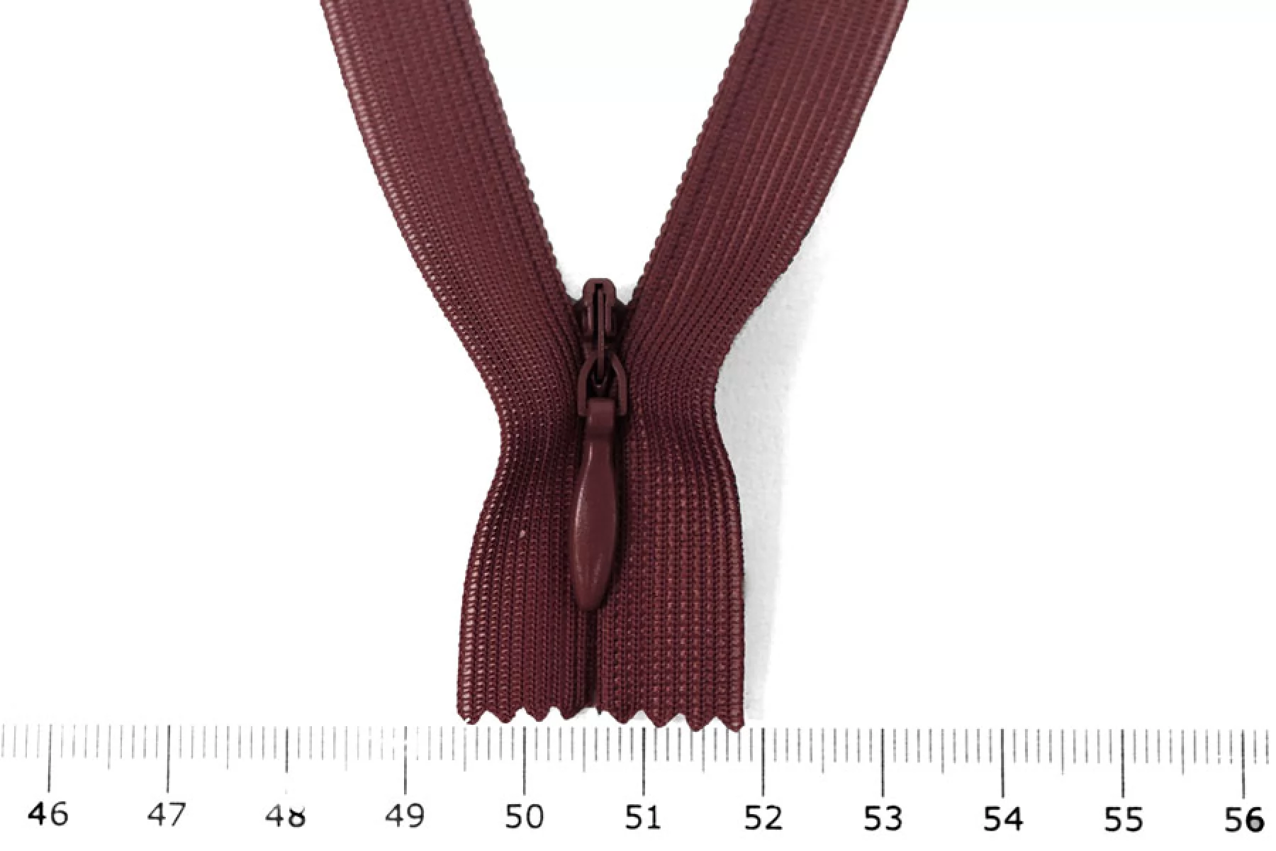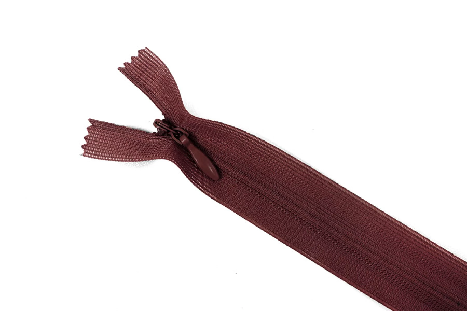 Потайная молния бордового цвета, длина 20 см. Неразъемная. Зубцы пластиковые, слайдер и пуллер - металл. Ширина молнии 2 см. Ширина зубцов 4 мм.
