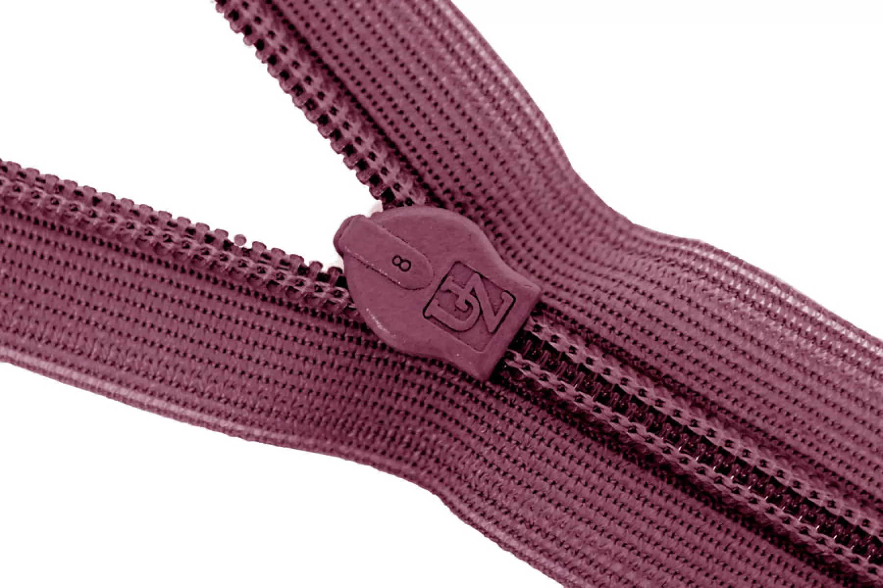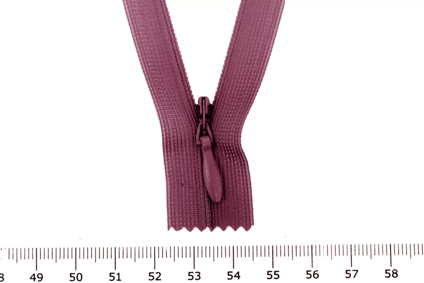 Потайная молния бордового цвета, длина 20 см. Неразъемная. Зубцы пластиковые, слайдер и пуллер - металл. Ширина молнии 2 см. Ширина зубцов 4 мм.
