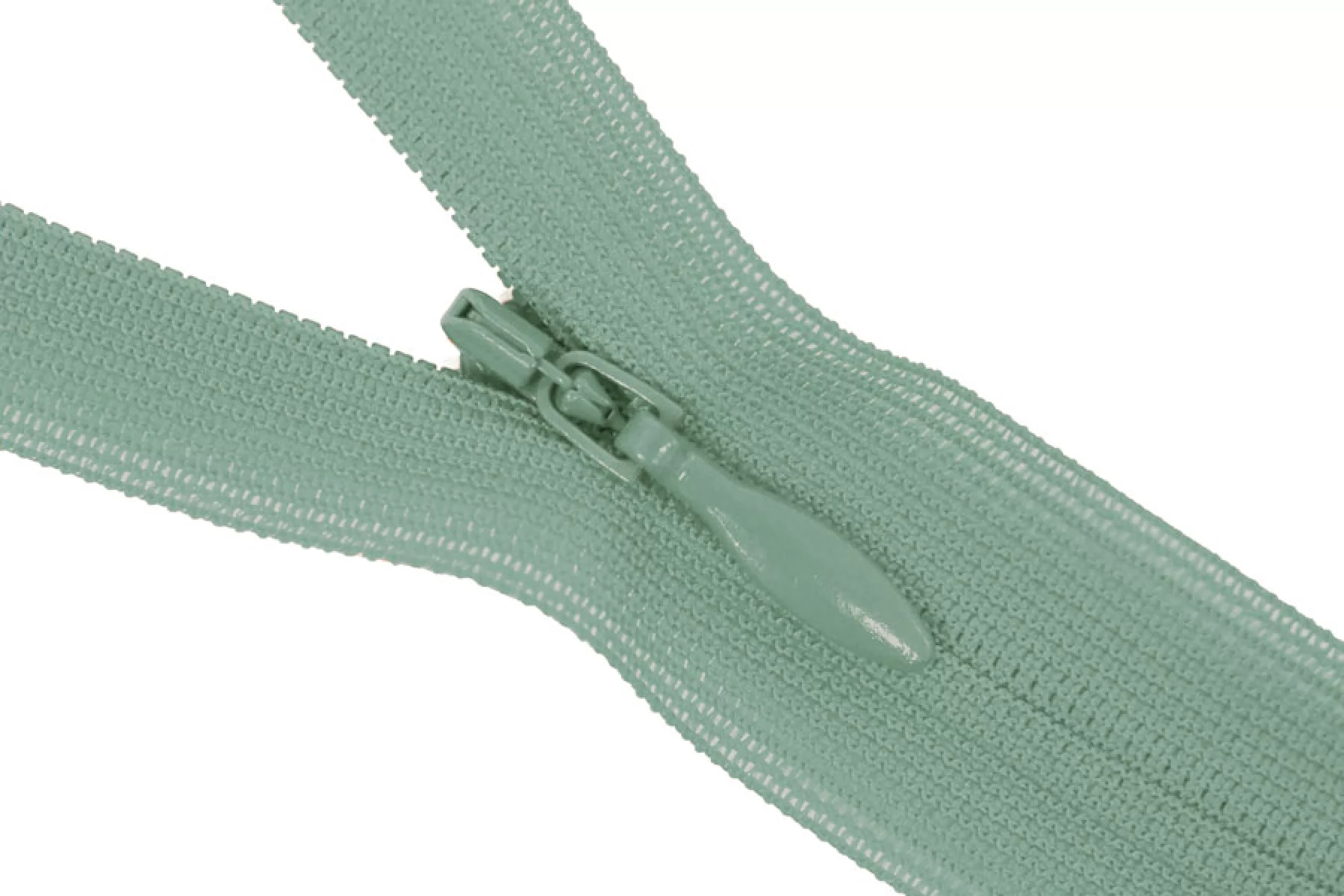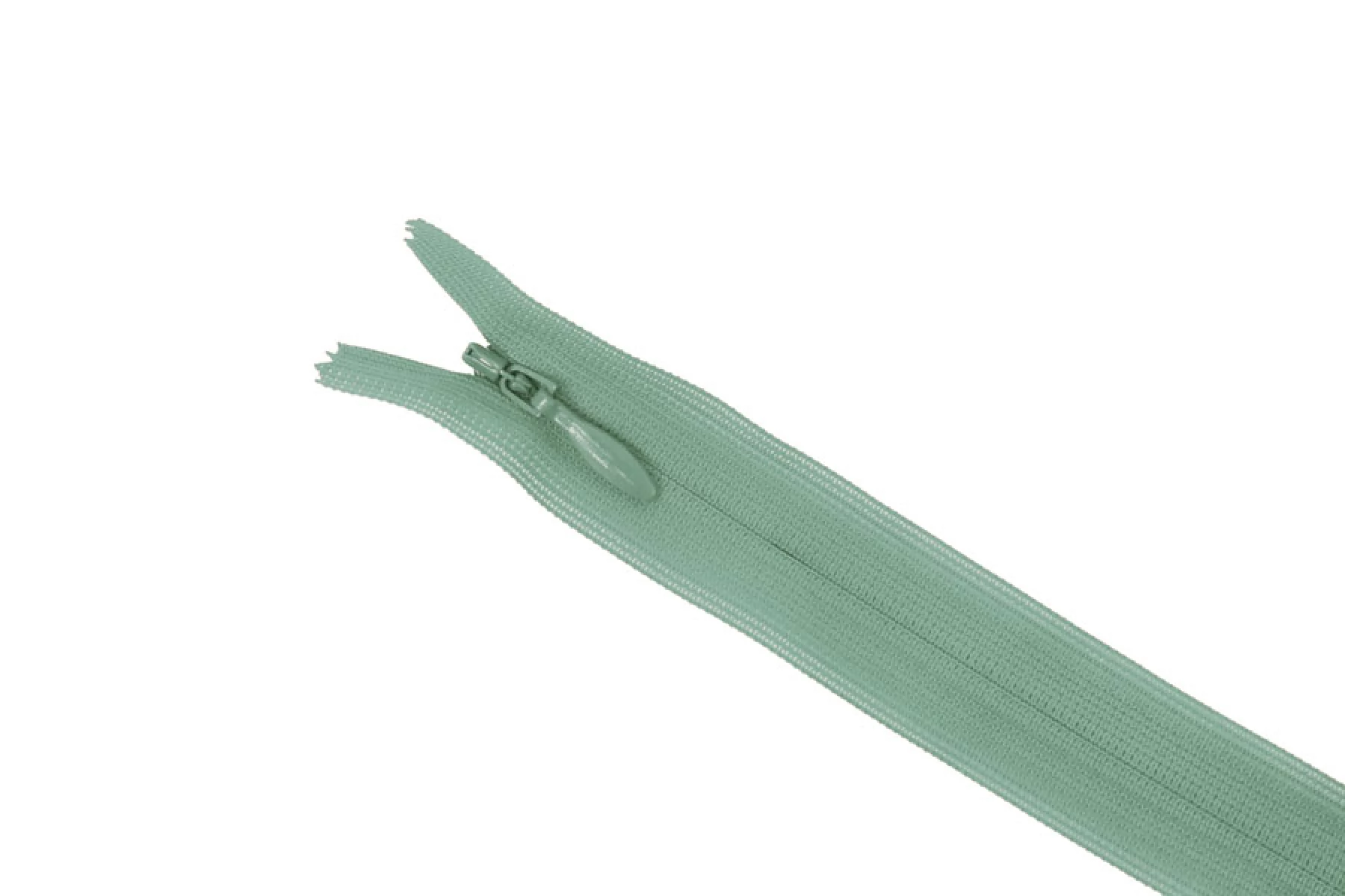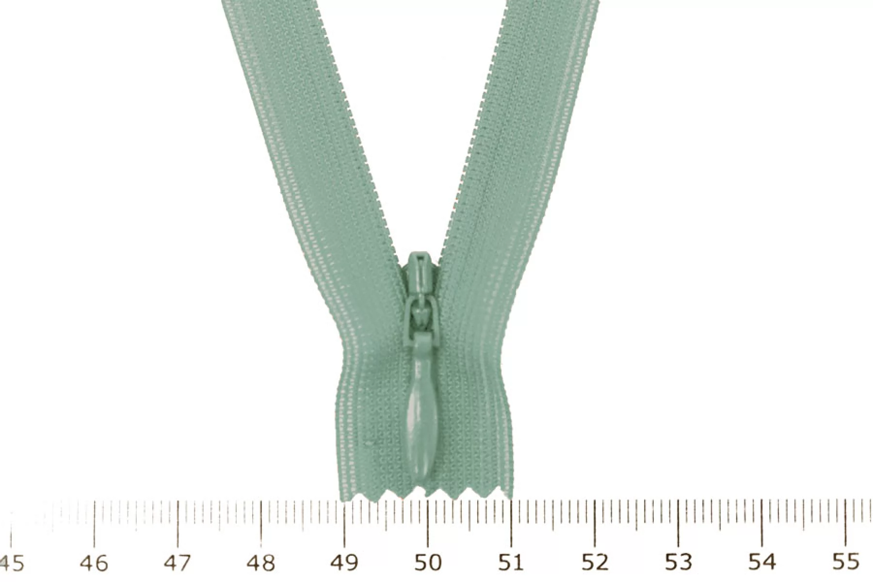 Молния потайная фисташковая, длина 68 см. Слайдер и пуллер - метал. в цвет молнии. Ширина молнии 2.2 см , ширина зубцов 4мм.