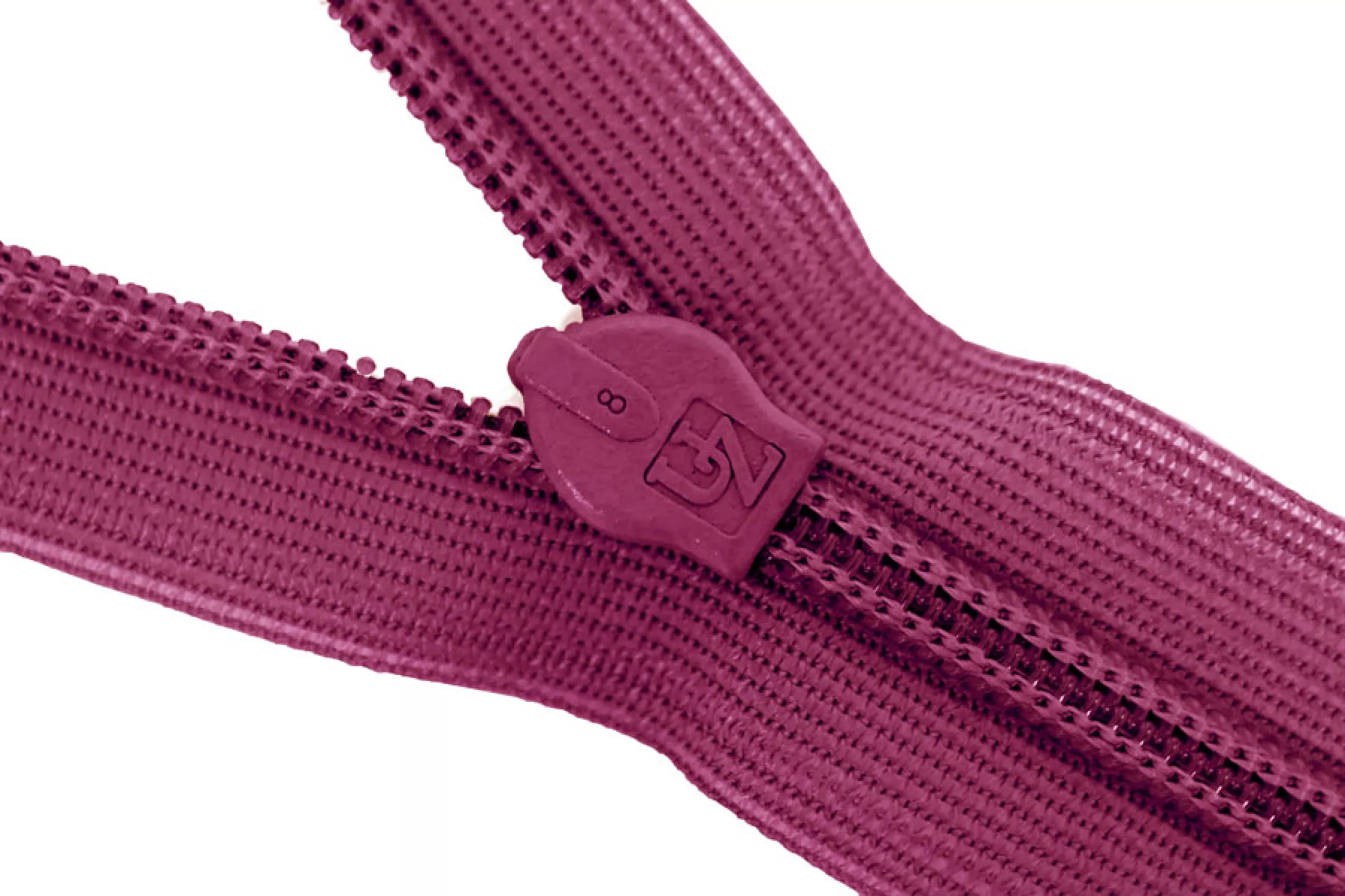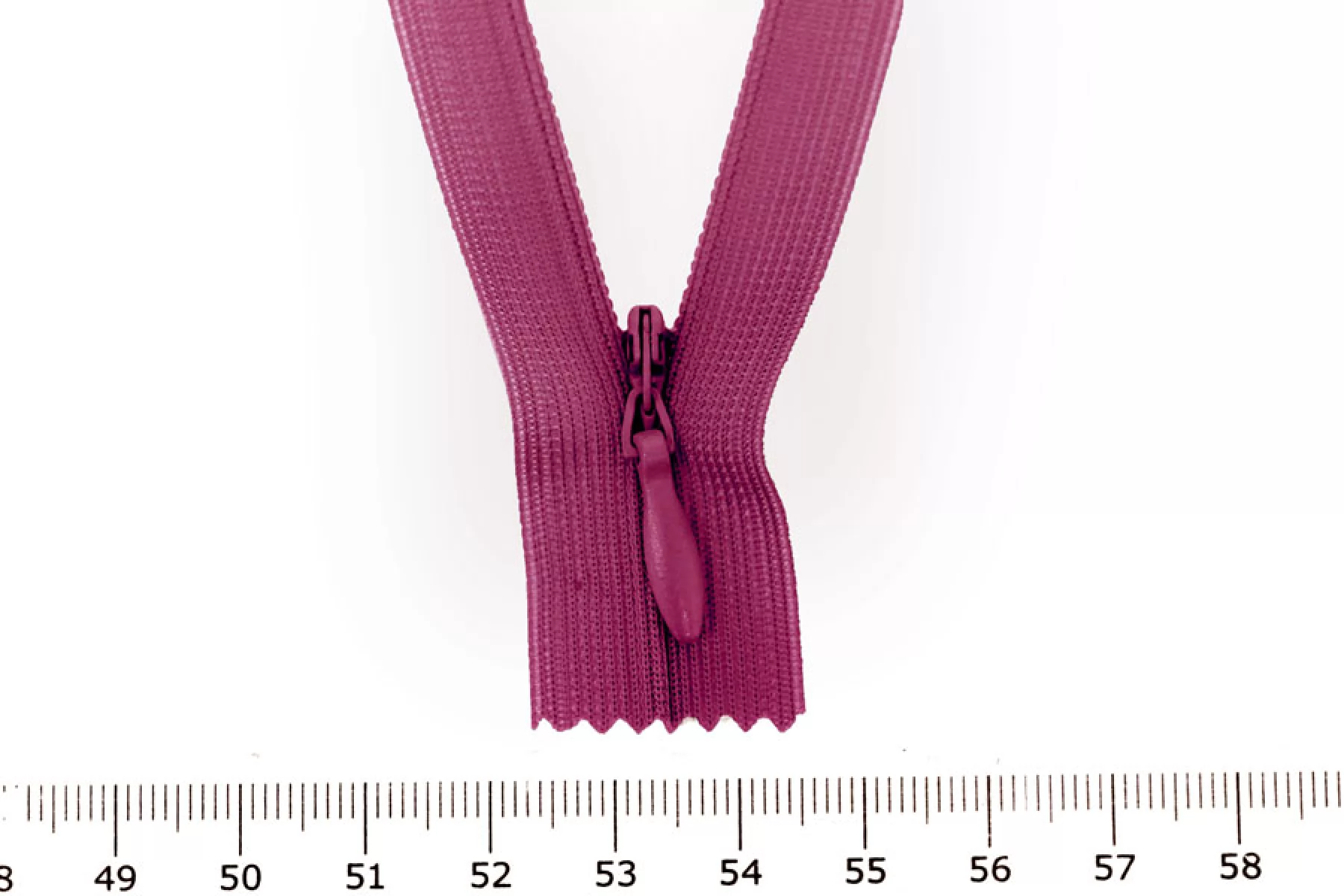 Потайная молния цвета фуксия, длина 20 см. Неразъемная. Зубцы пластиковые, слайдер и пуллер - металл. Ширина молнии 2 см. Ширина зубцов 4 мм.