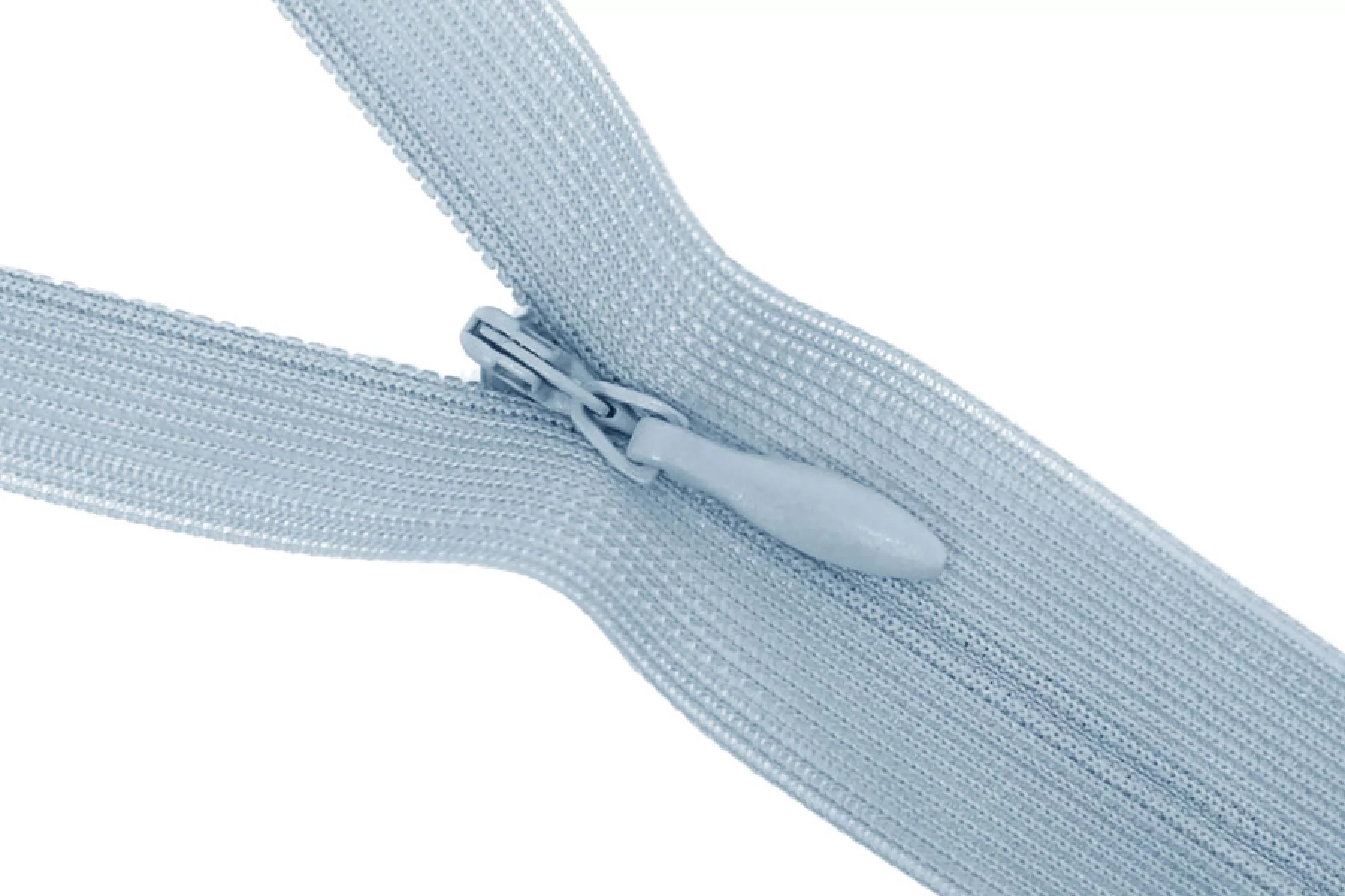 Потайная молния голубого цвета, длина 23 см. Неразъемная. Зубцы пластиковые, слайдер и пуллер - металл.