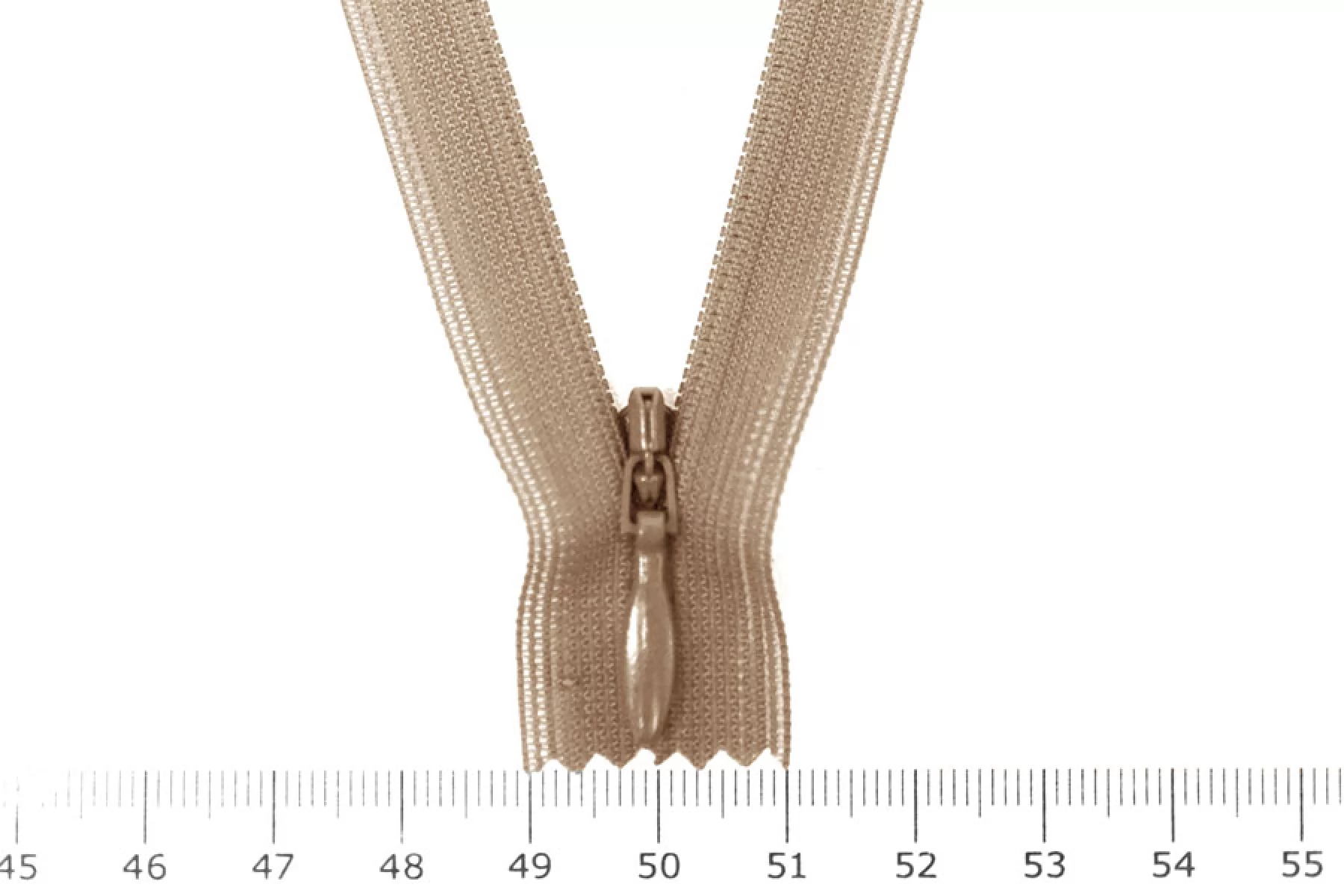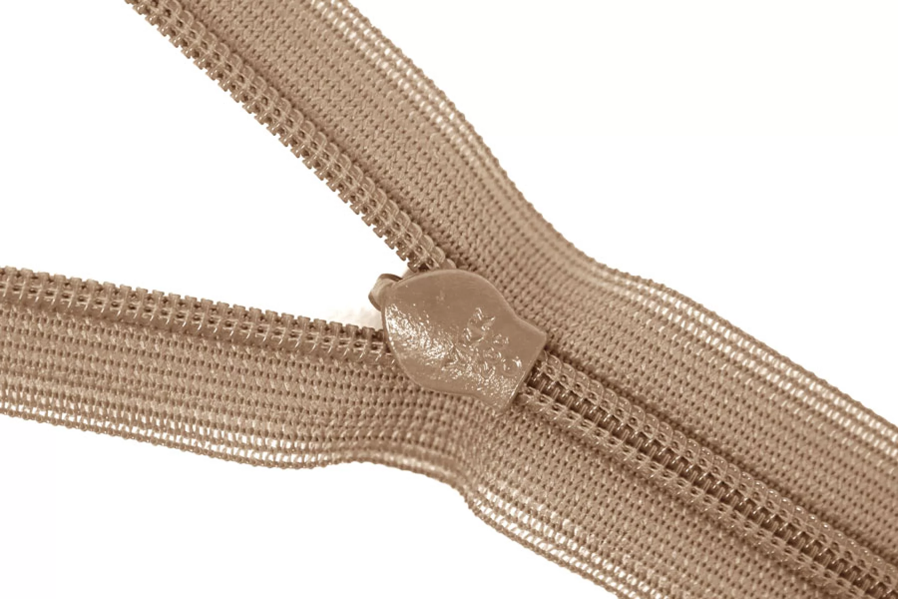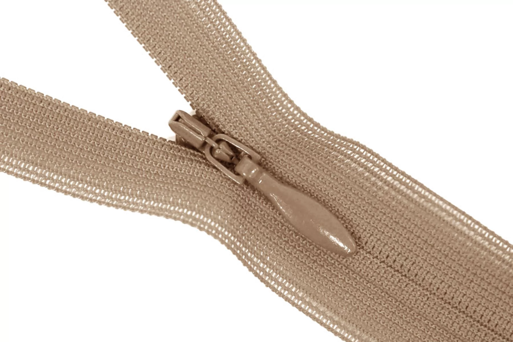 Потайная молния коричневого цвета, длина 17 см. Неразъемная. Зубцы пластиковые, слайдер и пуллер - металл.