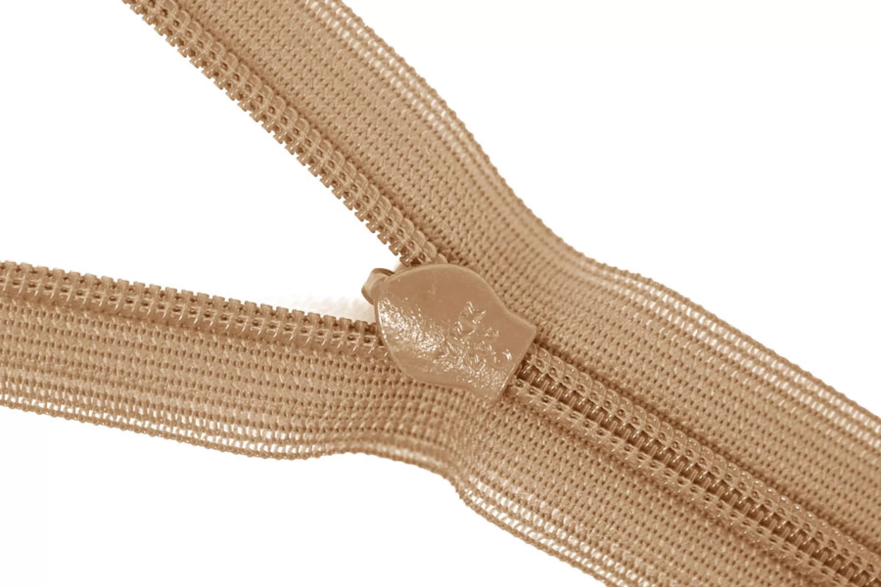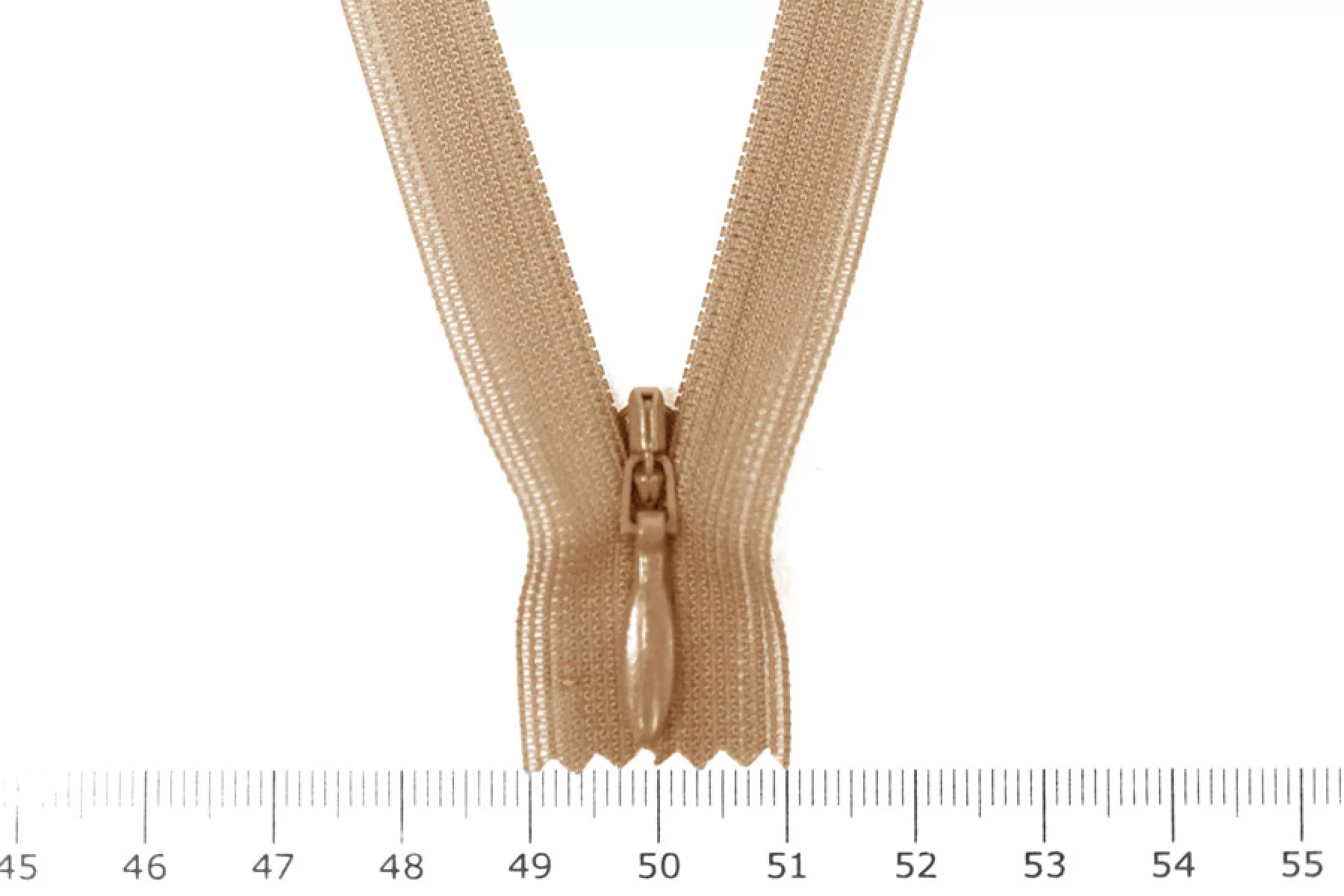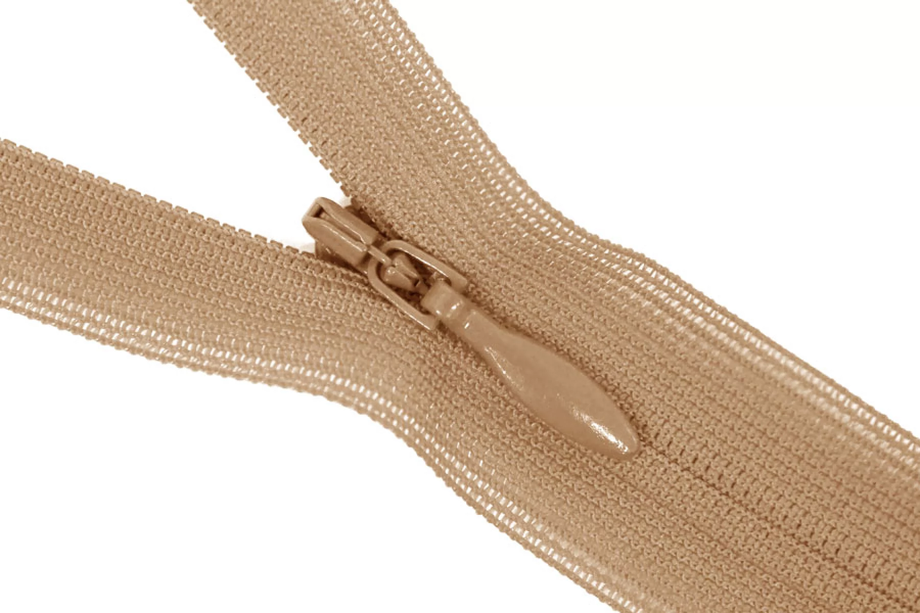 Потайная молния коричневого цвета, длина 19 см. Неразъемная. Зубцы пластиковые, слайдер и пуллер - металл.