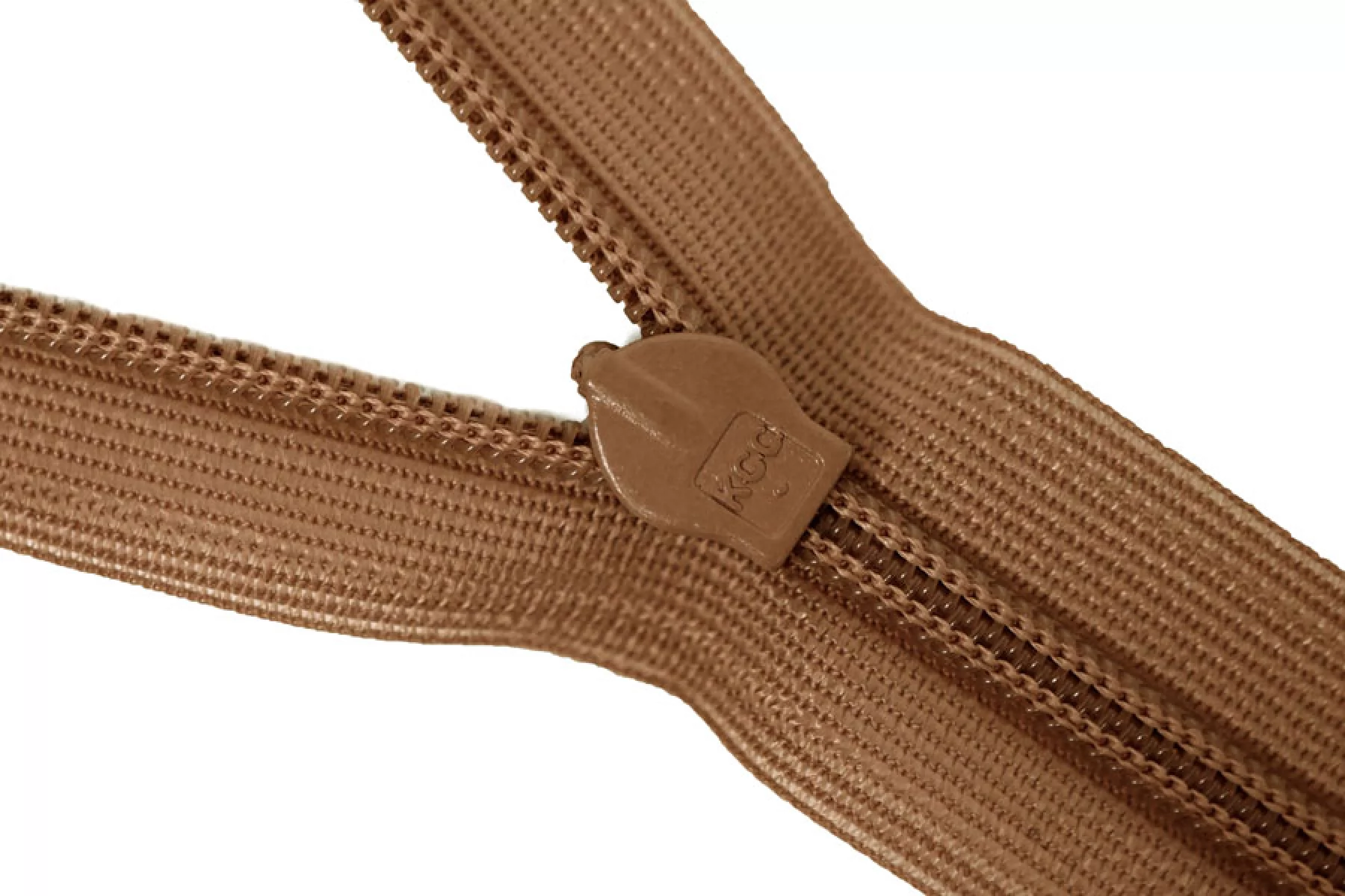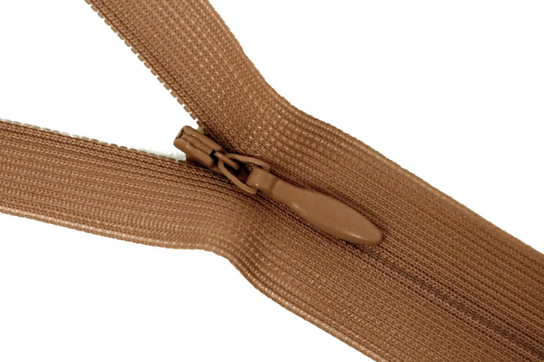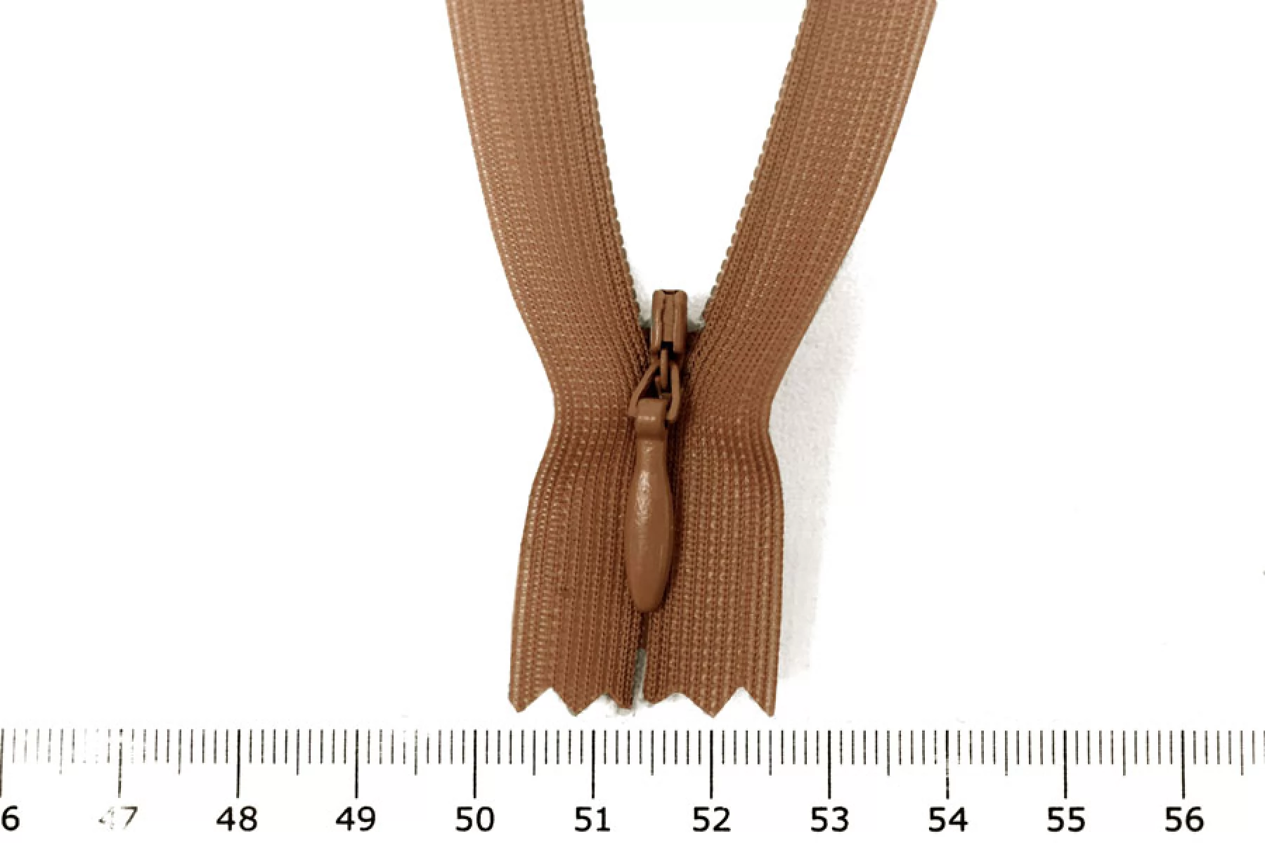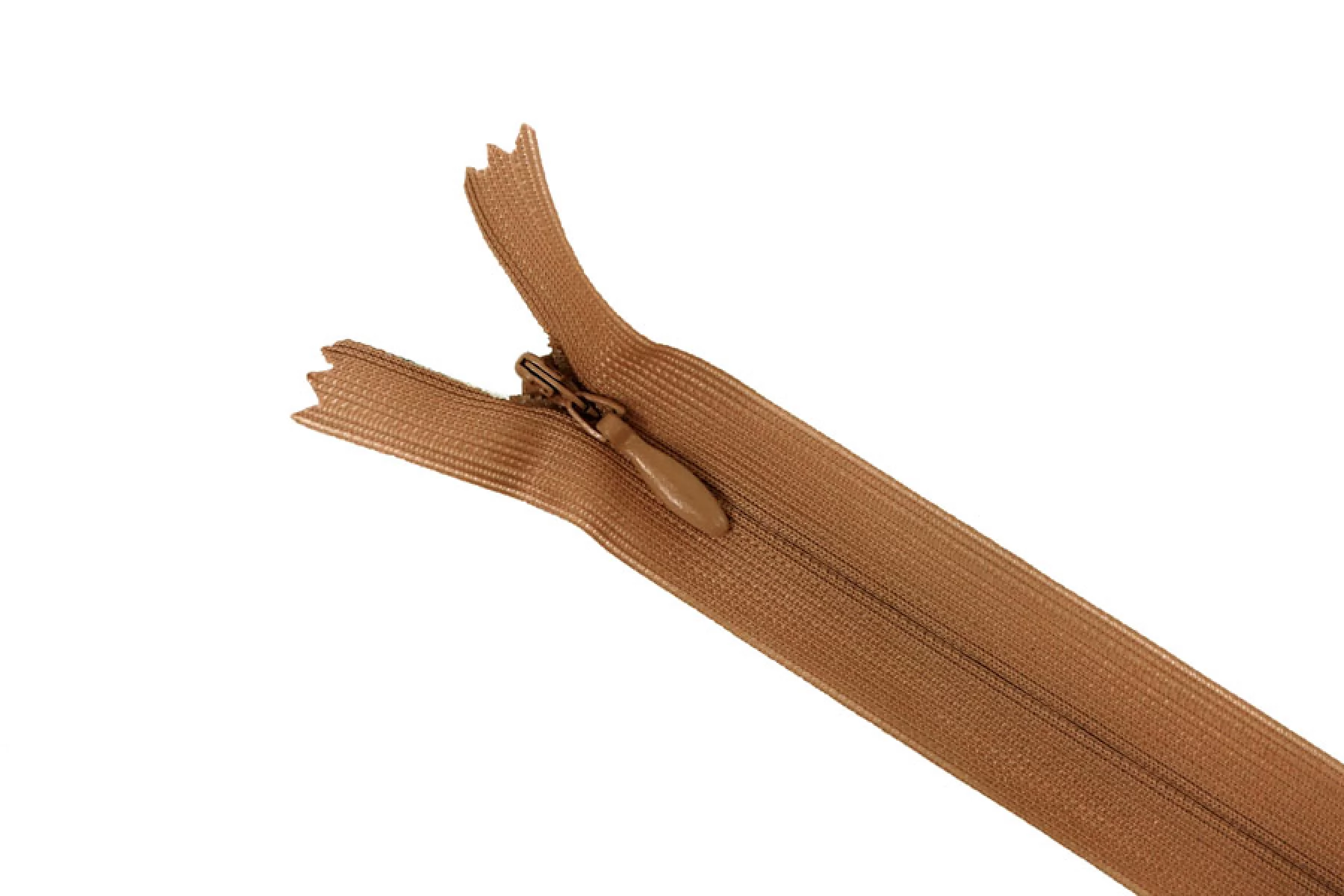 Потайная молния коричневого цвета, длина 22 см. Неразъемная. Зубцы пластиковые, слайдер и пуллер - металл.
