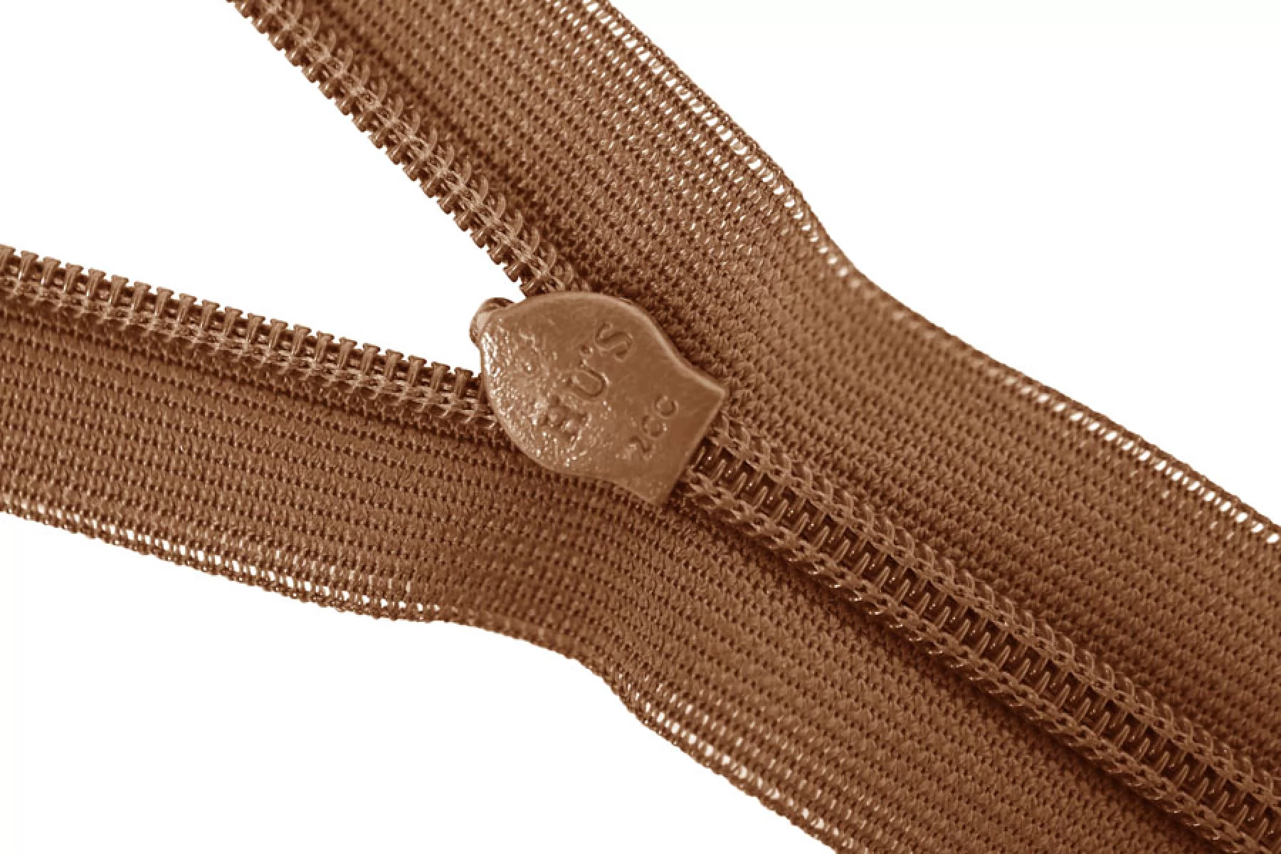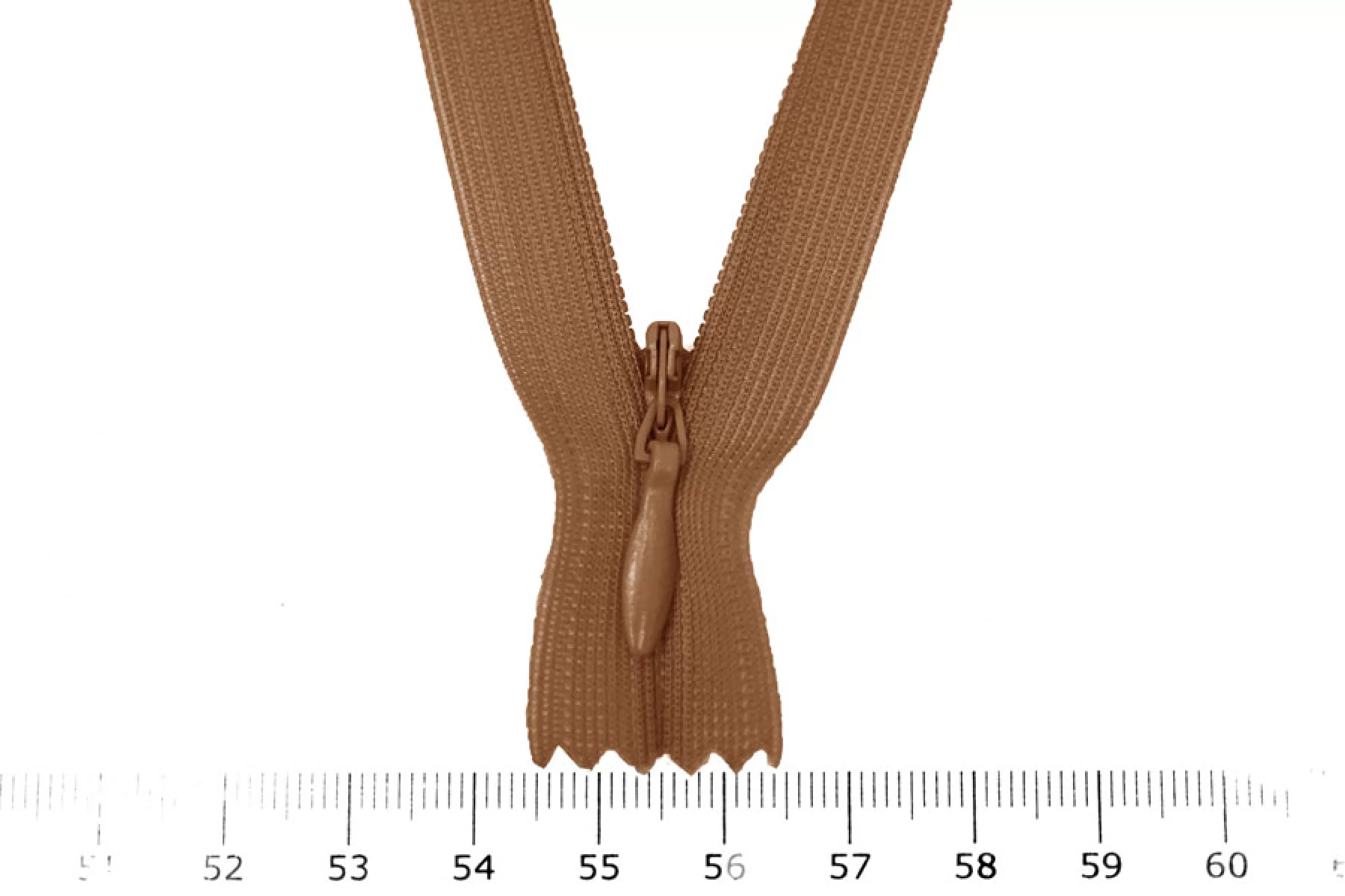 Потайная молния коричневого цвета, длина 22 см. Неразъемная. Зубцы пластиковые, слайдер и пуллер - металл.