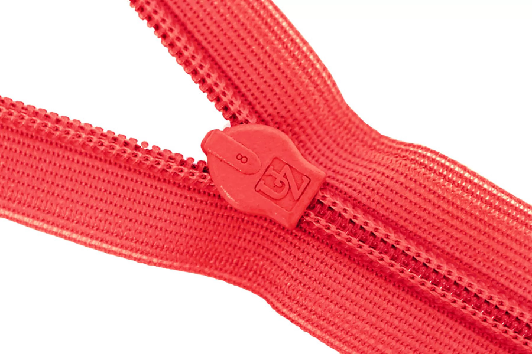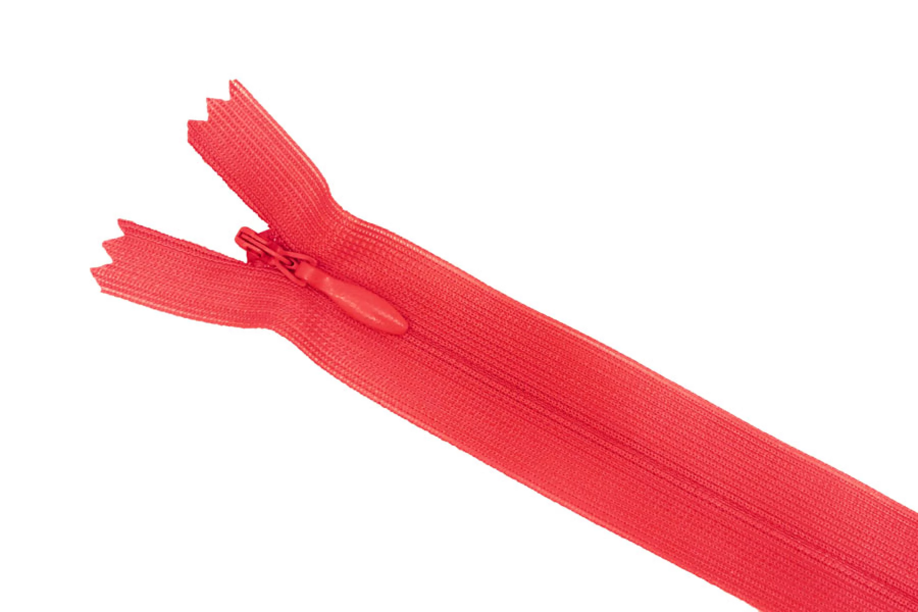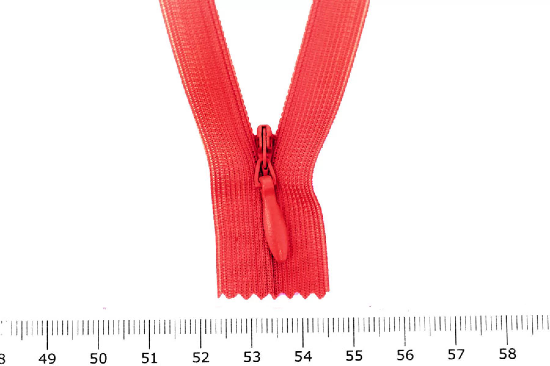 Потайная молния красного цвета, длина 20 см. Неразъемная. Зубцы пластиковые, слайдер и пуллер - металл. Ширина молнии 2 см. Ширина зубцов 4 мм.
